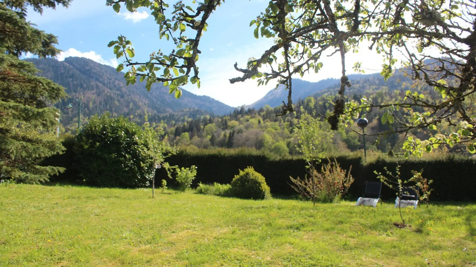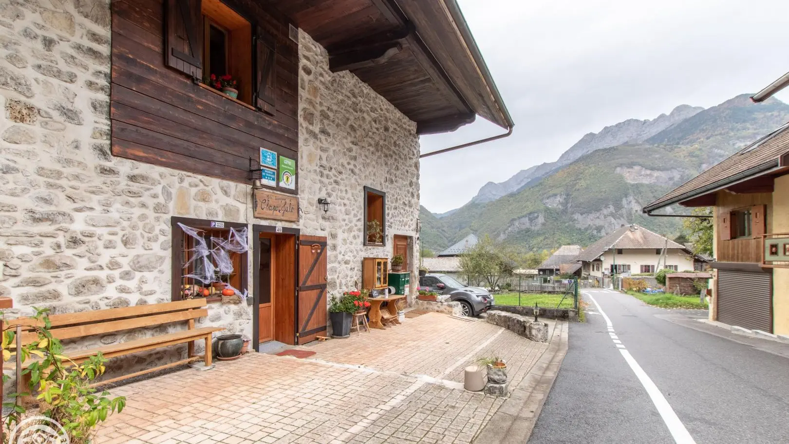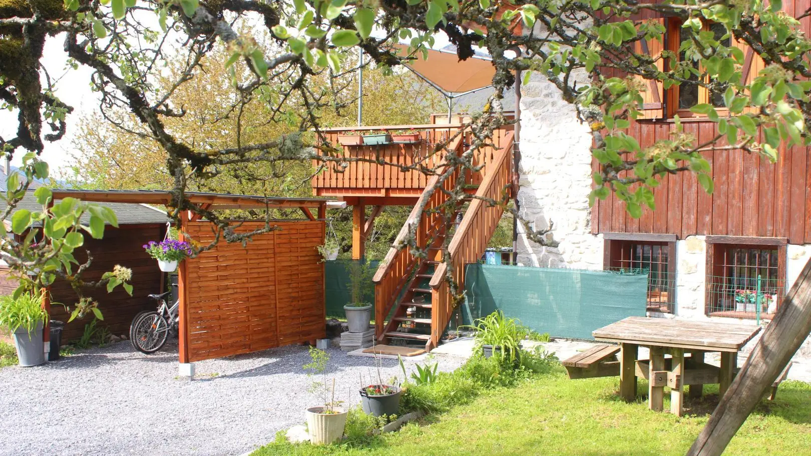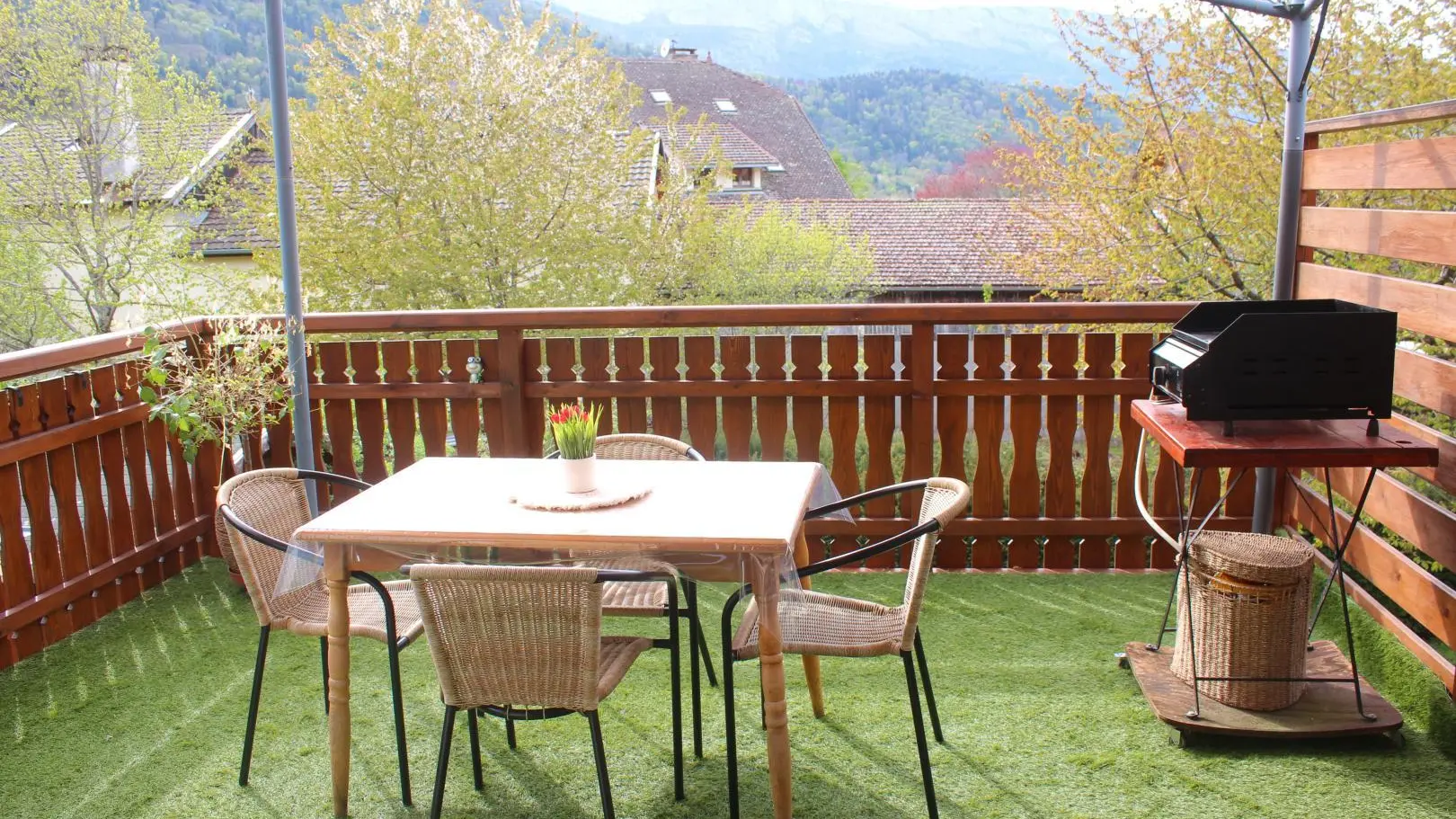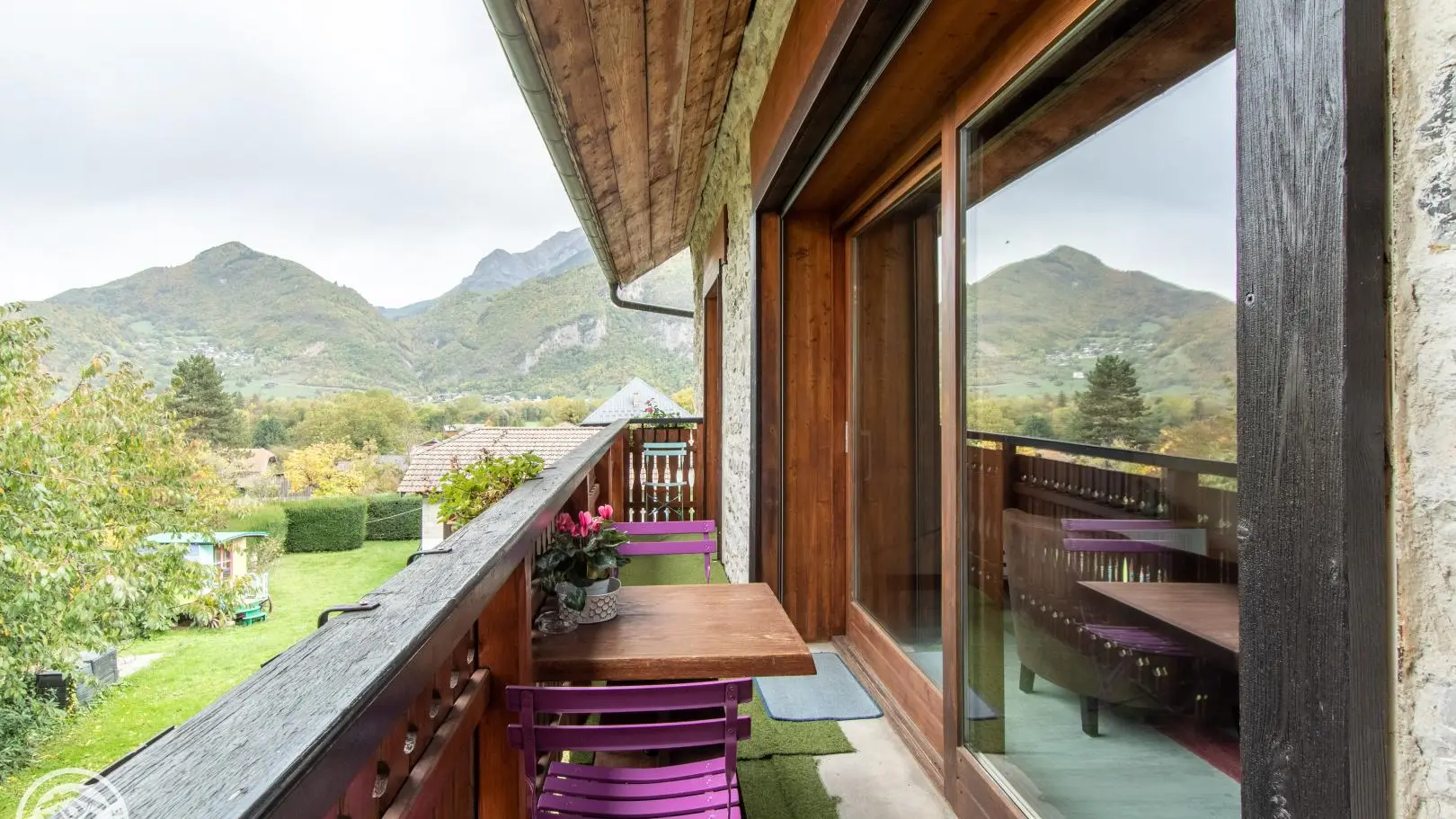 Terrasse avec table extérieure et barbecue gaz. Mobilier de jardin, transats… disponibles sur le terrain. Vaste parking à proximité. Maison située dans un hameau en retrait de la route départementale entre Faverges et Doussard. -10% pour un séjour de 2 semaines.