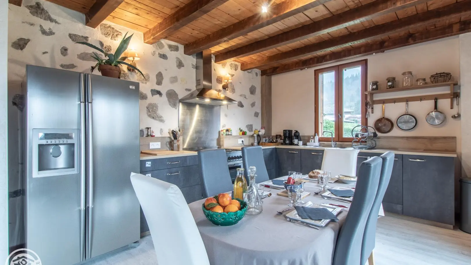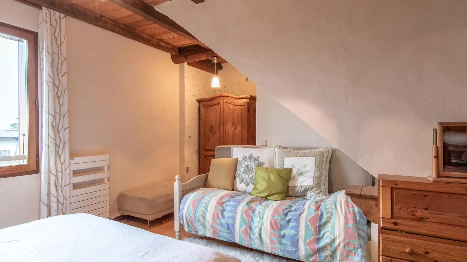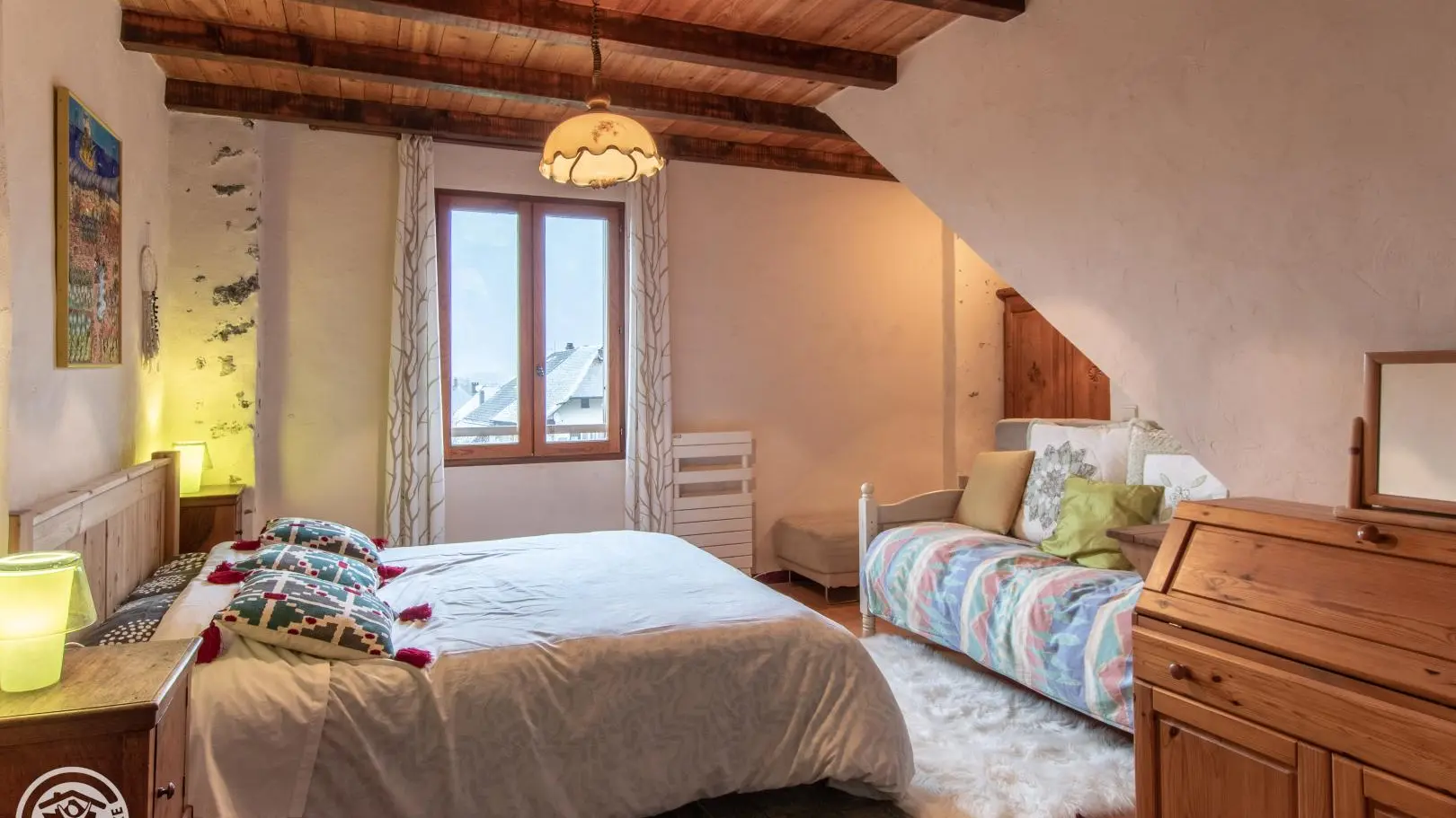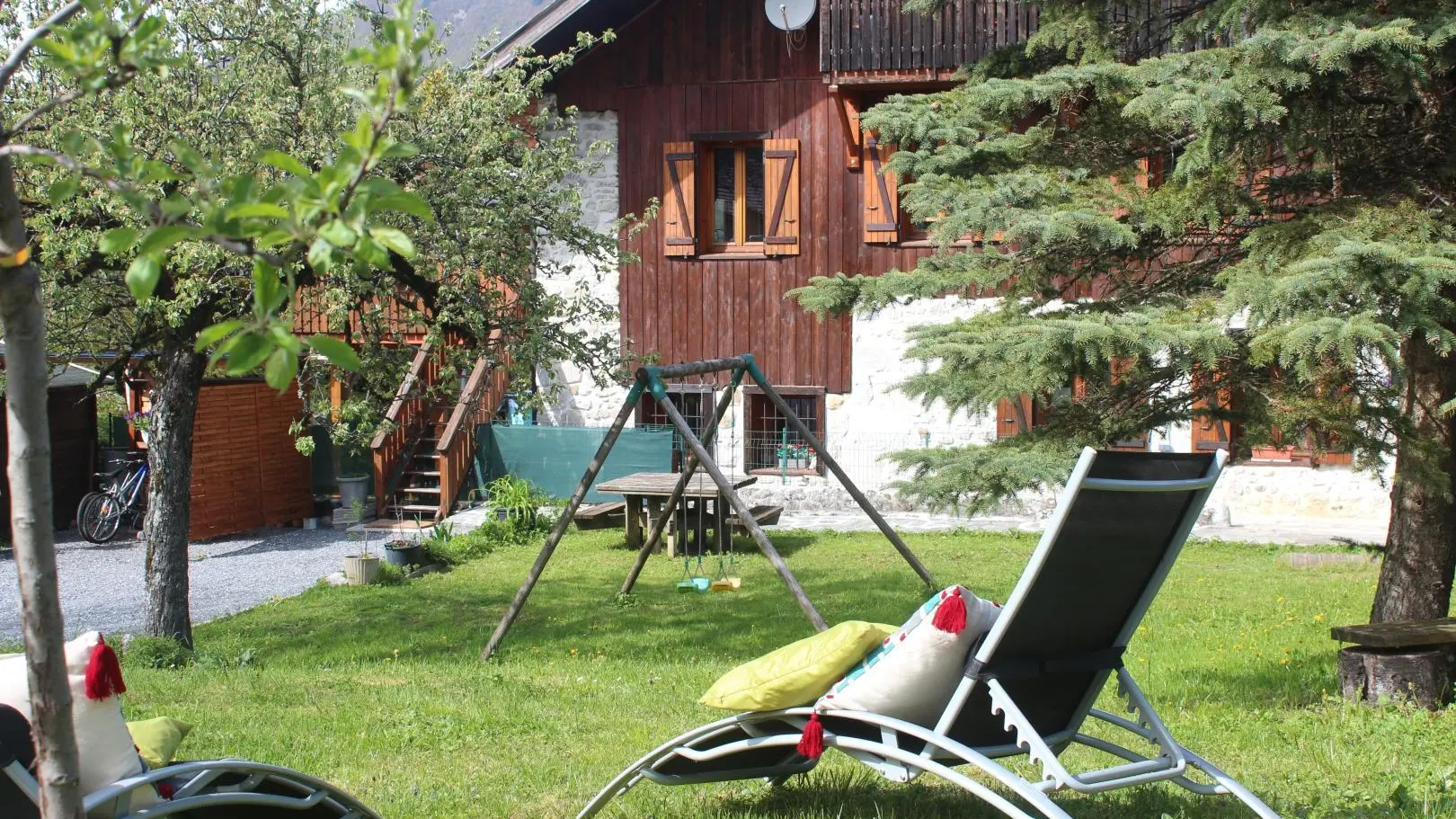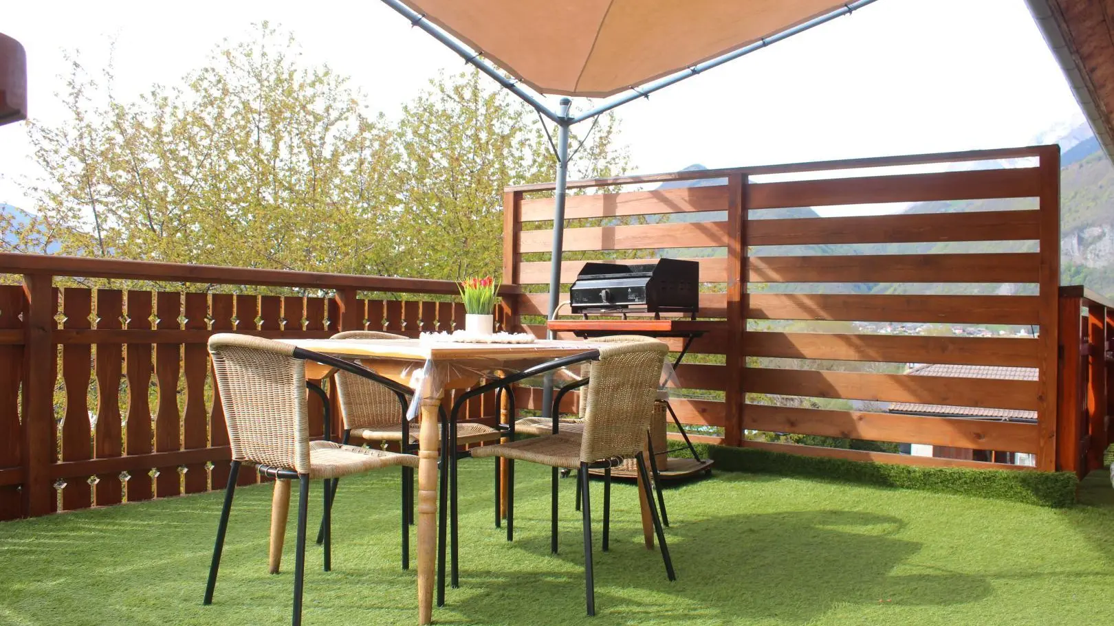 Terrasse avec table extérieure et barbecue gaz. Mobilier de jardin, transats… disponibles sur le terrain. Vaste parking à proximité. Maison située dans un hameau en retrait de la route départementale entre Faverges et Doussard. -10% pour un séjour de 2 semaines.
