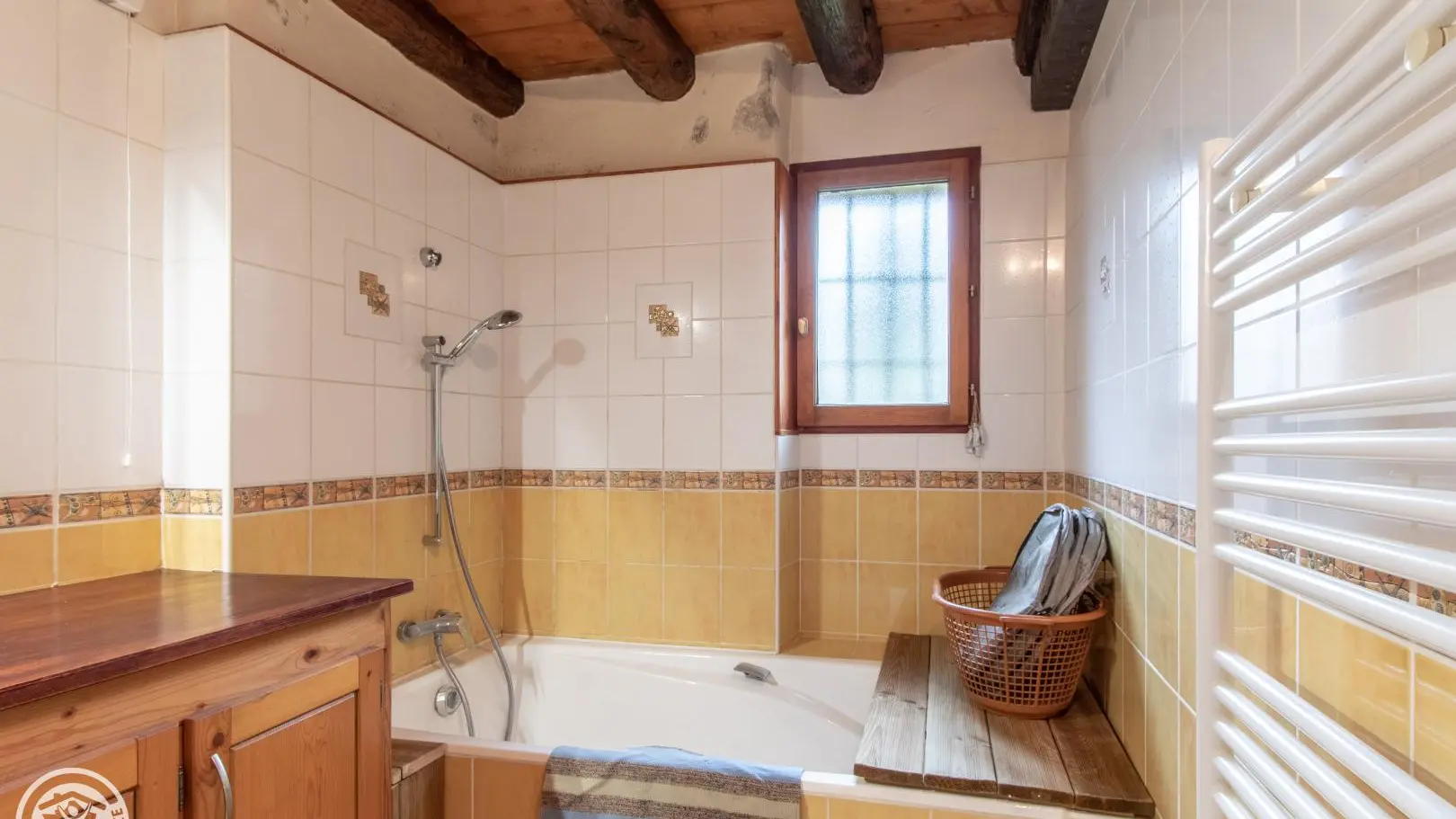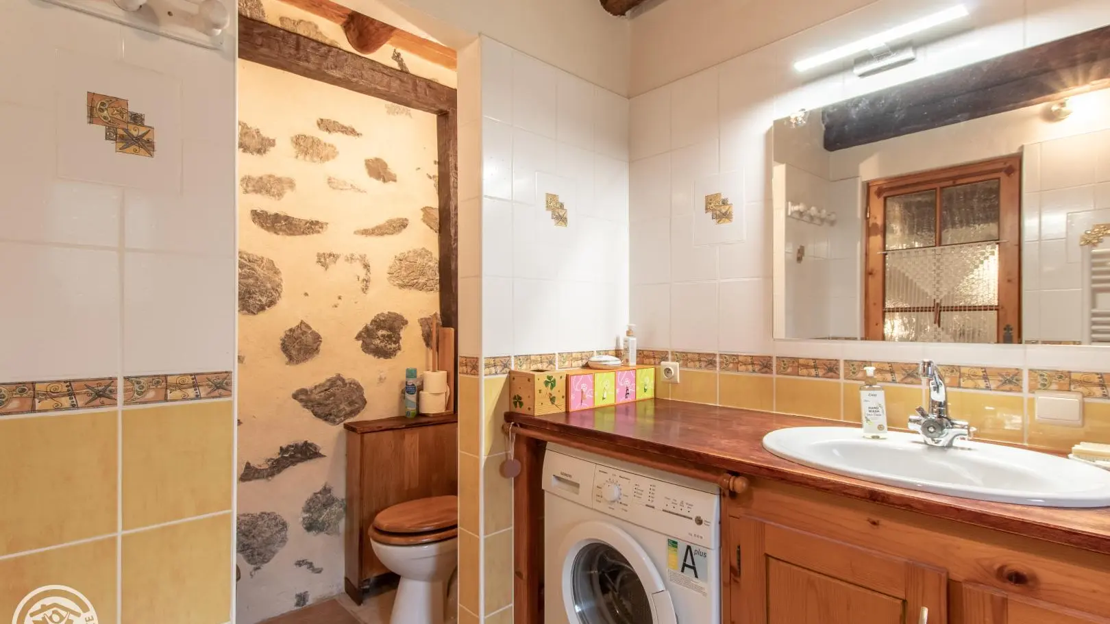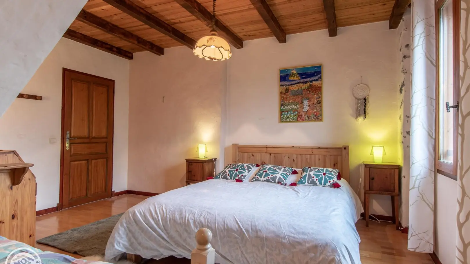 WC indépendants. Accès chambre 1 (lit 160x190 cm et 90x190cm), chambre 2 (lit 140x190cm, salle de bains privative avec douche). 3 marches donnent accès à un demi-étage comprenant la chambre 3 (lit 180x200cm) et la salle de bains principale (douche, lave-linge, WC) accessible depuis la chambre.