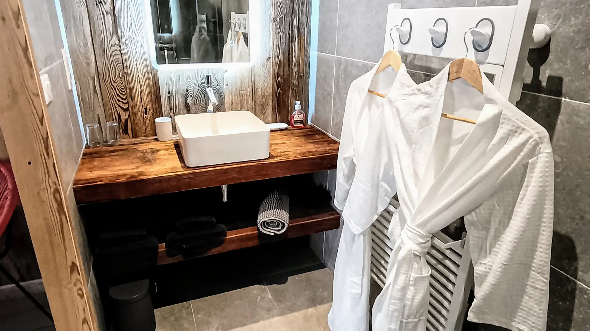 - Chaque personne dispose de 2 serviettes de bain, d'un peignoir et d'une paire de sandales,