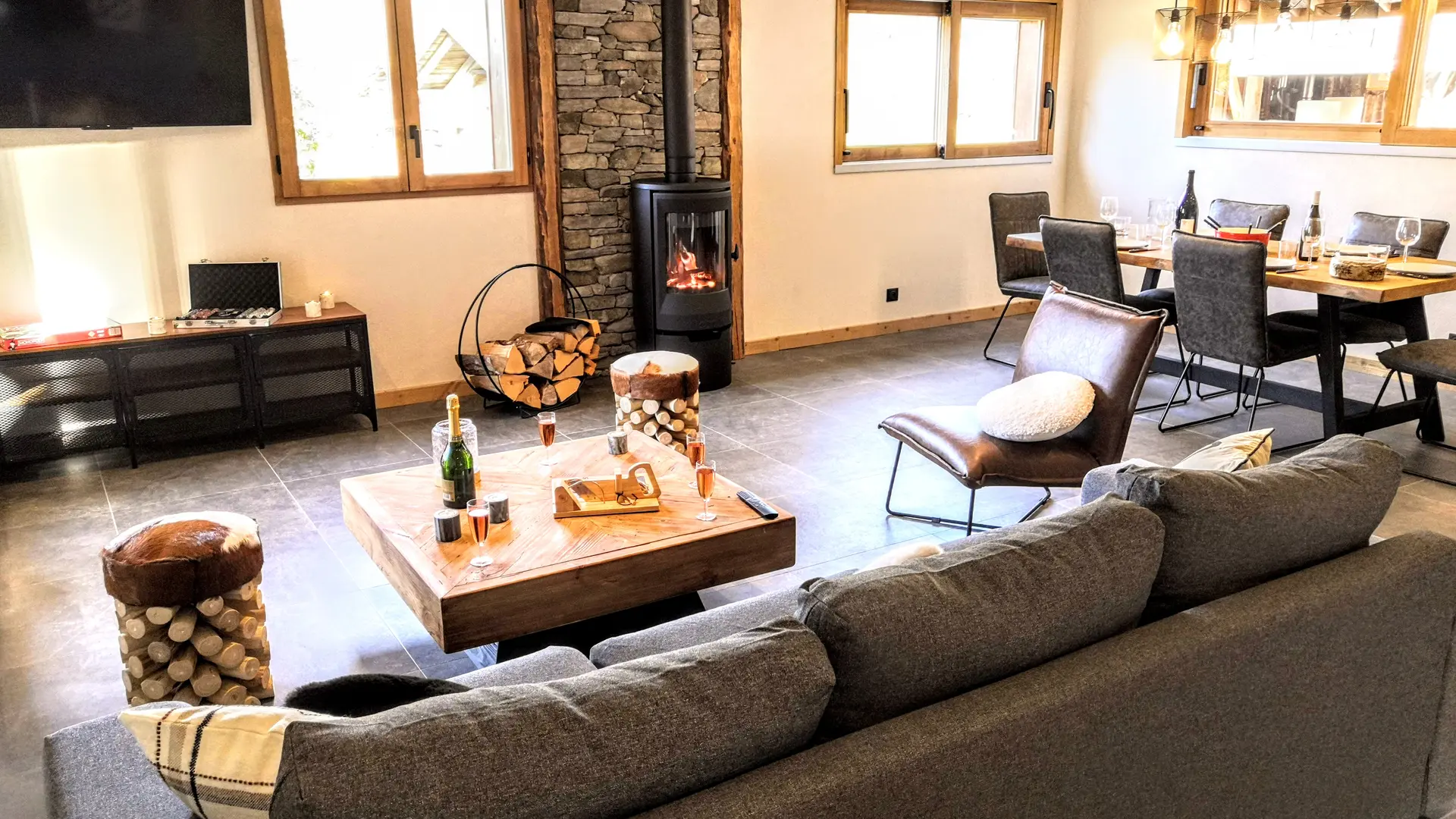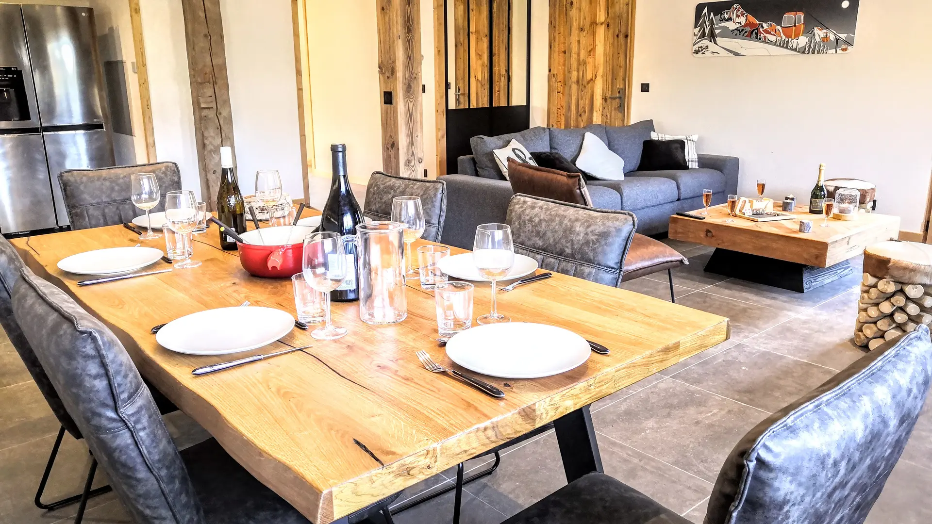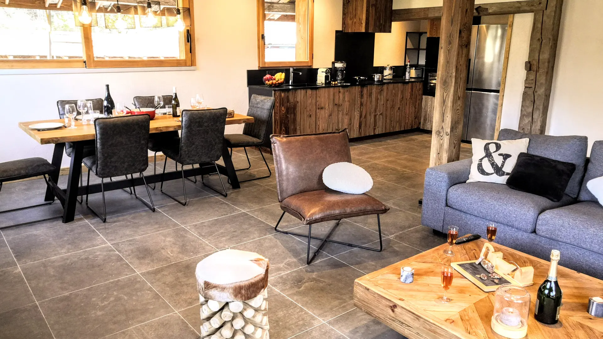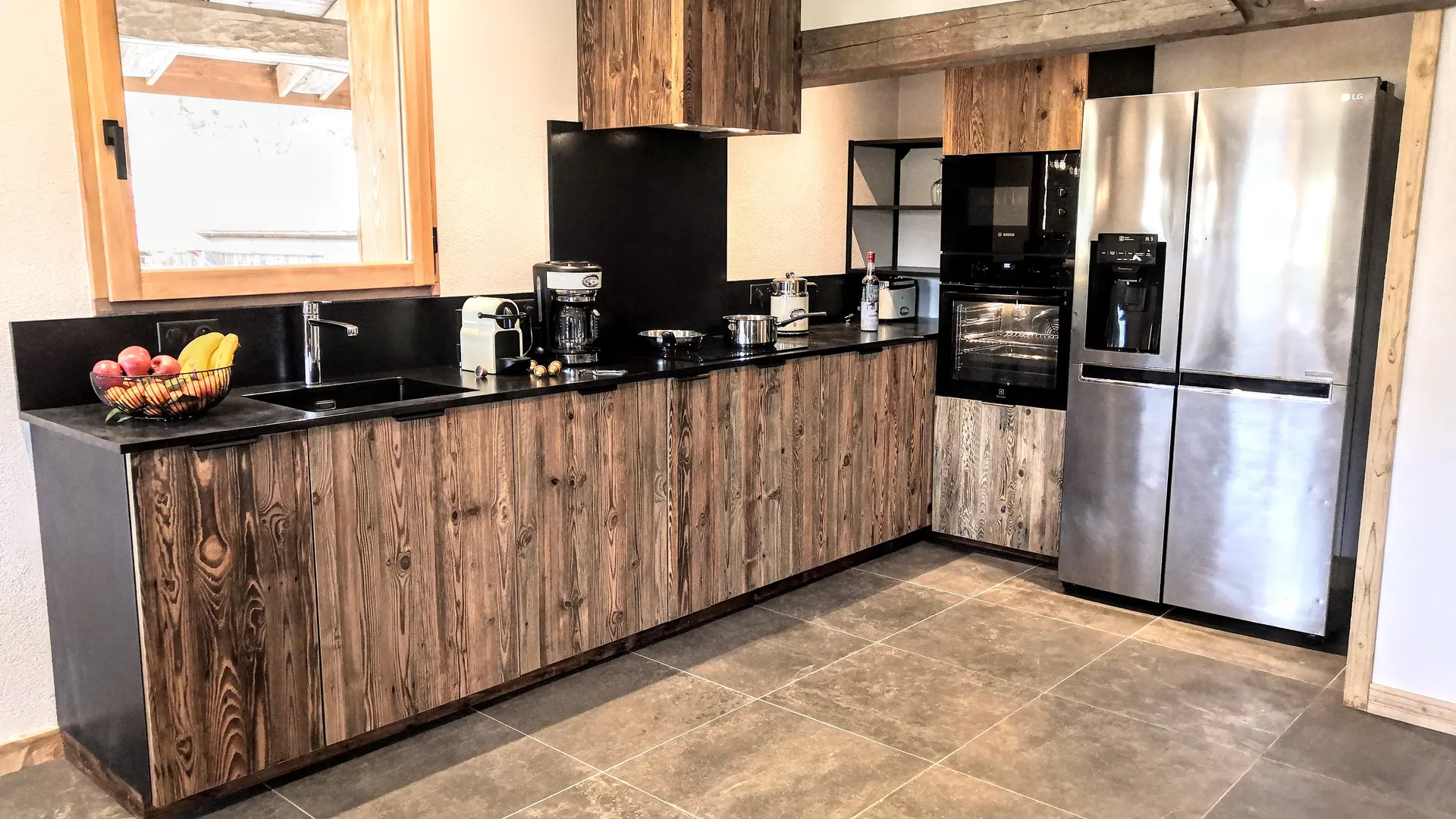 - Une cuisine équipée : Frigo congélateur, Four, micro-ondes, lave-vaisselle, plaque induction, grille pain, bouilloire, cafetière filtre, nespresso à dosette, appareil à fondue, appareil à raclette, un mixeur, un batteur, des torchons, du sel, poivre, sucre, huile, dosettes Nespresso, dosettes lave vaisselle, dosettes lave linge, savons pour la vaisselle et les mains et une éponge, savon pour le corps, shampoing