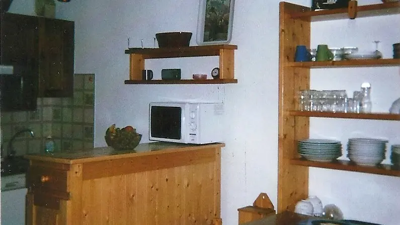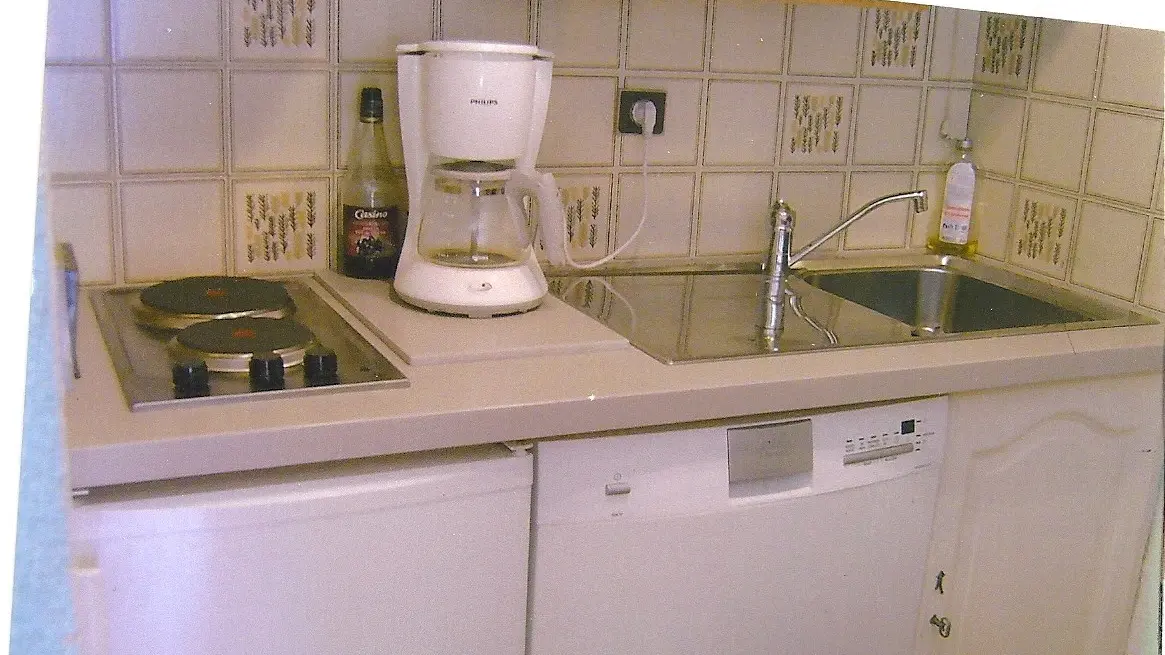 Coin cuisine : lave-vaisselle, four micro-ondes, plaques de cuisson, cafetière, appareil à raclette.