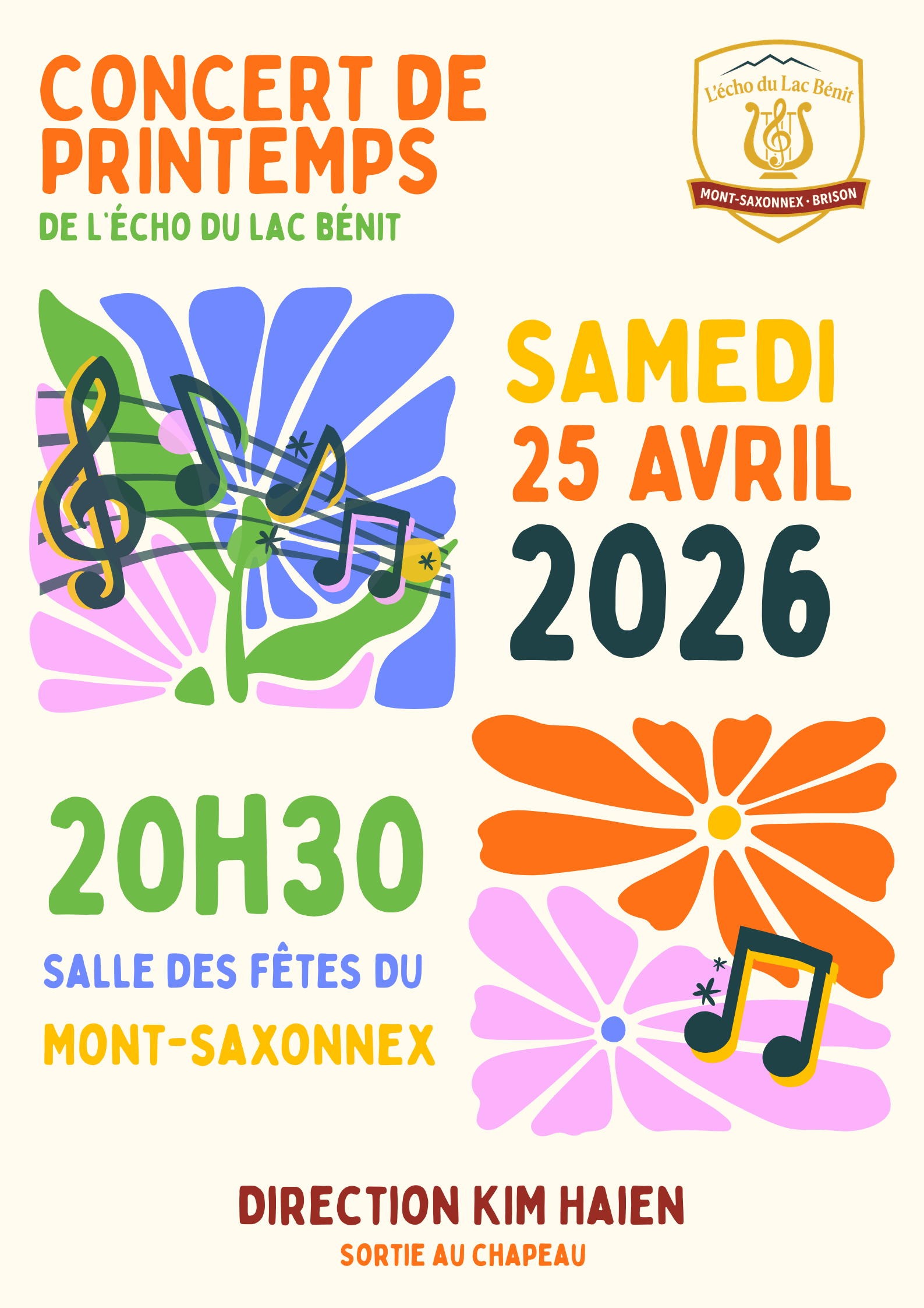 Concert de printemps de l'Harmonie L'Echo du Lac Bénit - Mont-Saxonnex & Brison à la salle des fêtes du Mont Saxonnex le samedi 25/04/2026 à 20h30 sous la Direction de KIM Haien.