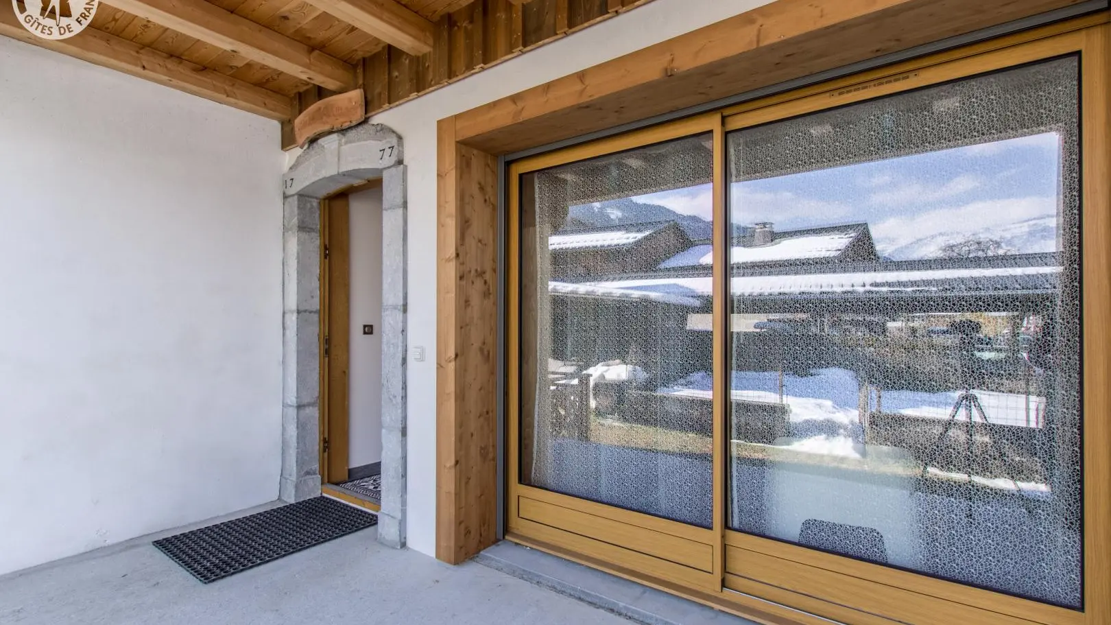 Terrasse couverte Sud-Est côté route + espace terrasse Sud-Ouest (côté opposé à la route) avec mobilier de jardin. Casier à skis privatif. Parking commun aux 3 gîtes dans la propriété (sur le côté opposé au gîte). Prise renforcée pour recharge de voiture électrique.