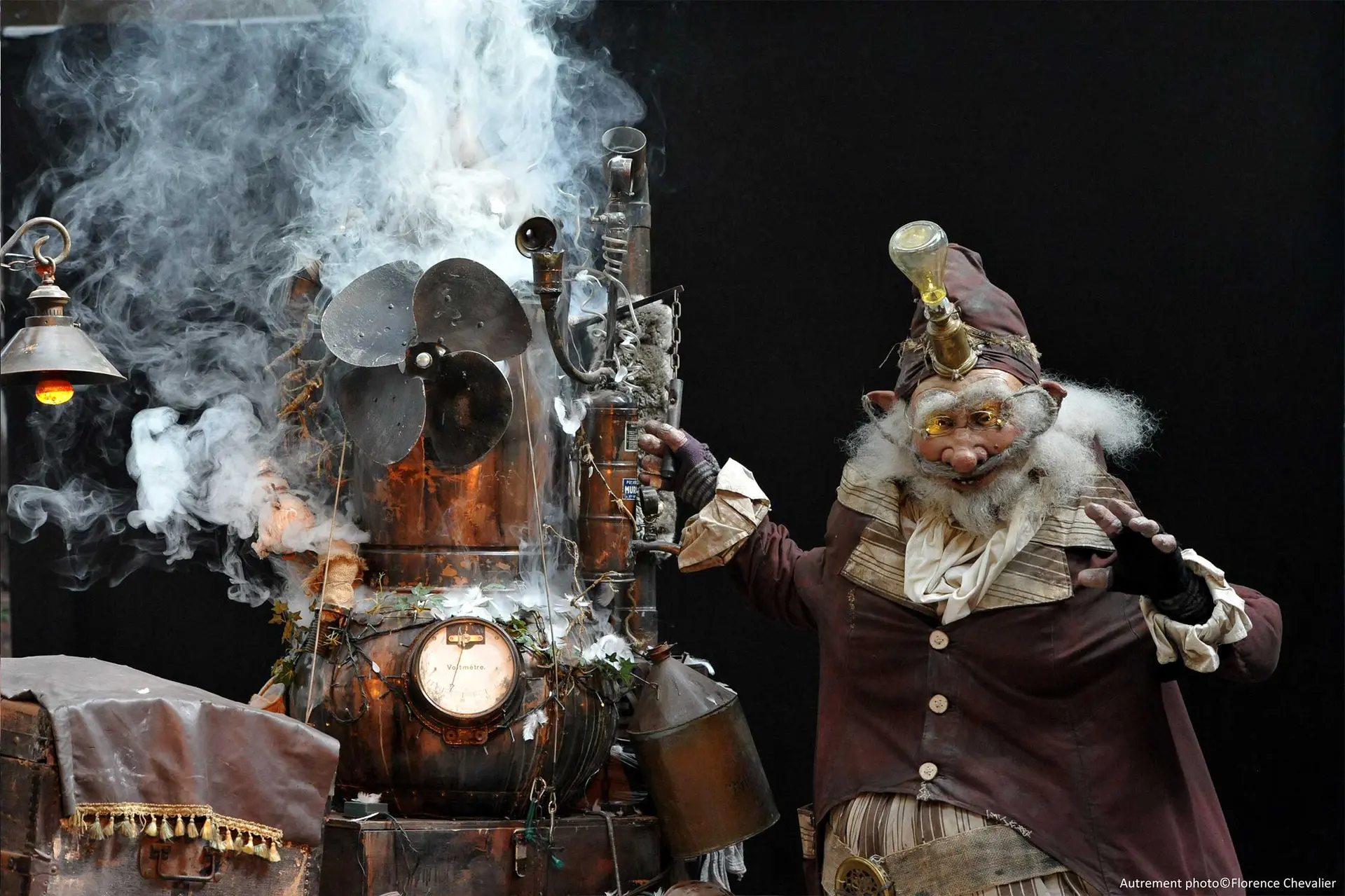 Mister Christmas déambule à bord de son scooter tracto-neige, rétro-futuriste et baroque à souhait. Une terrasse de café? Une petite place? Paf pouf, il s’arrête... mais pas au pif. Ce Nain Géant a du flair! Tout joyeux, il s’en va à la rencontre des gens qui croisent son chemin.