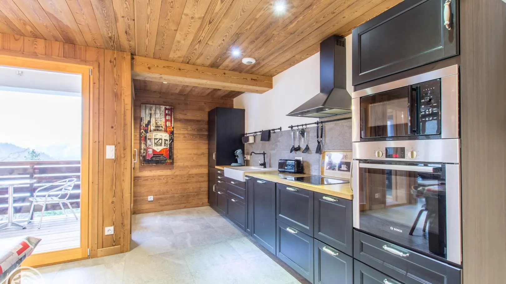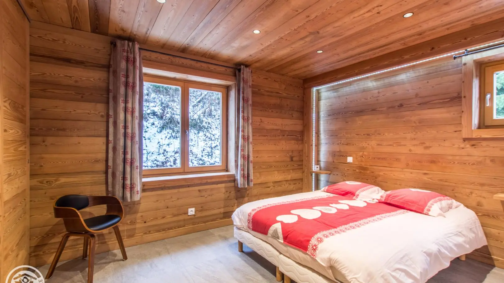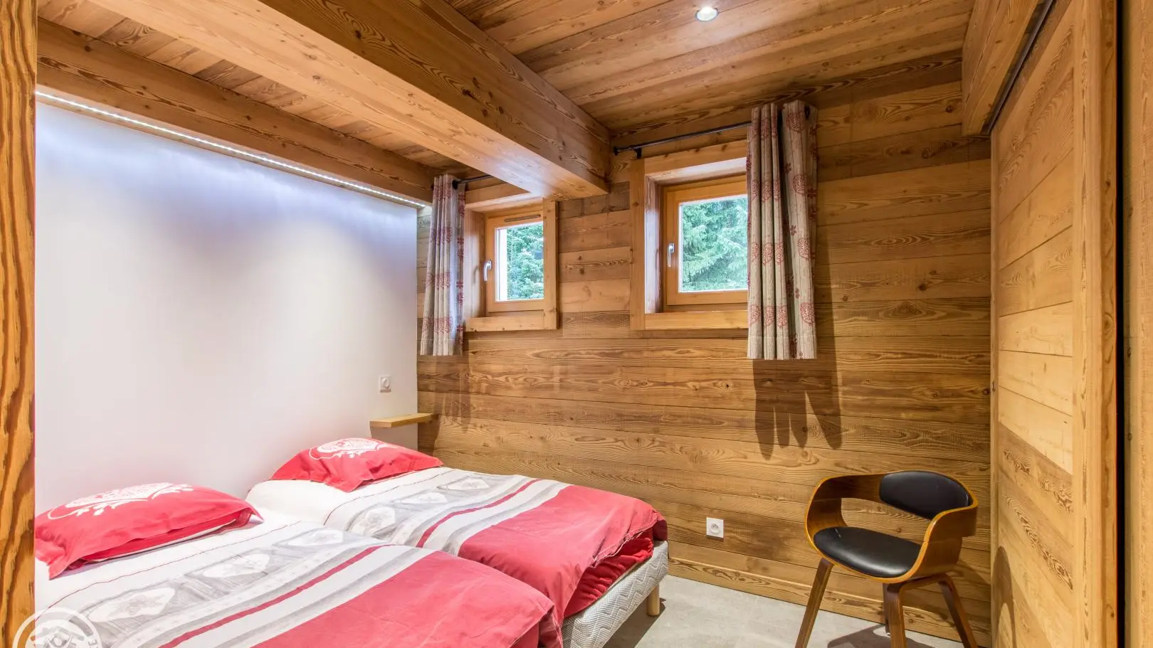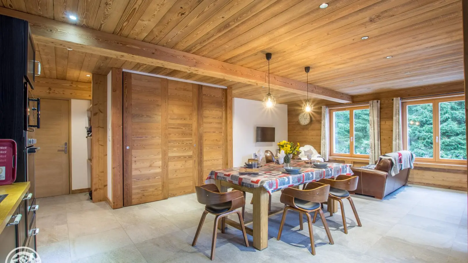 Très belle atmosphère intérieure d'esprit chalet, alliant confort, charme et modernité. Dans le gîte : cuisine intégrée ouverte sur séjour (canapé, Tv), chambre 1 (2 lits 90x200cm), chambre 2 (1 lit 160x200cm), salle d'eau (douche à l'italienne), wc indépendant.