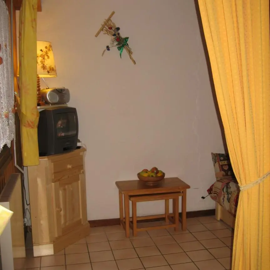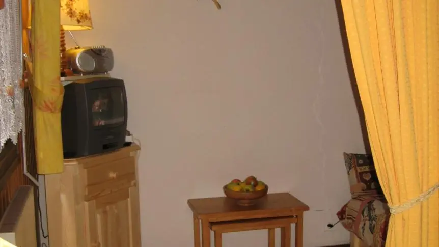 Coin séjour avec canapé, TV et magnétoscope.