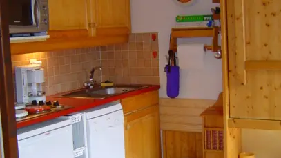 Kitchenette équipée avec réfrigérateur 150 litres, plaques électriques, micro-ondes et lave vaisselle.