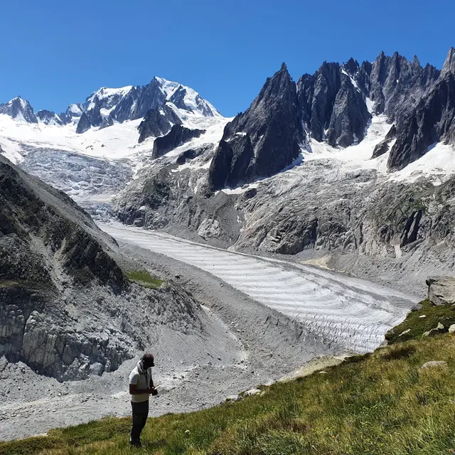 Notre excursion débute par un sentier qui nous conduit jusqu'au Glacier de Talèfre à 2 500 mètres d'altitude. De là, nous progressons à travers un dédale de rochers qui recouvre partiellement le glacier. Finalement, nous atteignons le Jardin de Talèfre, niché entre 2 700 et 3 000 mètres d'altitude. Au cours des derniers siècles, ce site n'a jamais été recouvert par les glaciers. Encadré par deux imposantes moraines latérales, le jardin abrite une flore alpine remarquable, comprenant des espèces uniques qui lui sont propres. Cette zone préservée offre une immersion exceptionnelle dans un environnement naturel préservé, avec des vues imprenables sur les paysages alpins environnants.