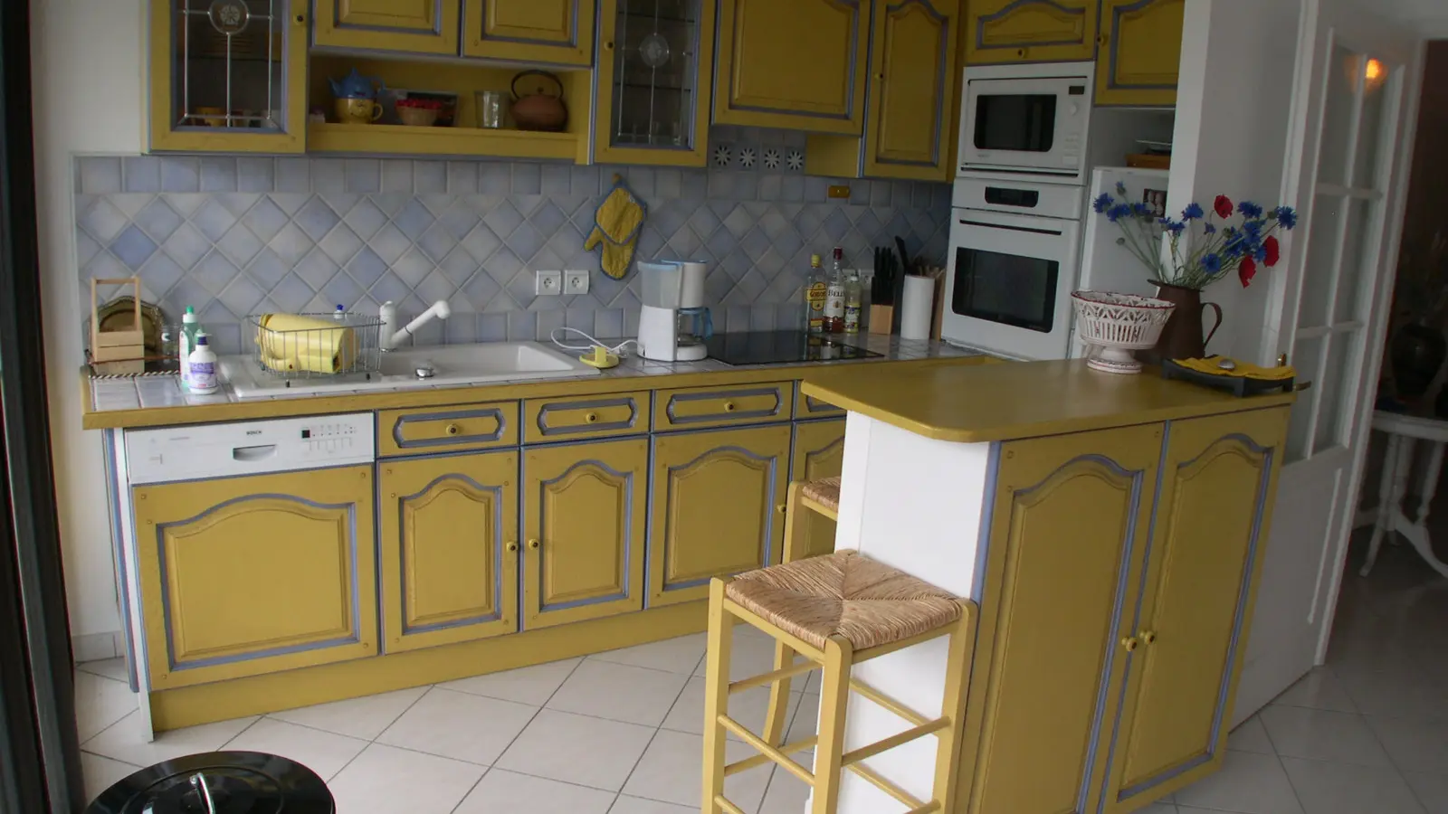 Equipements : plaque de cuisson vitro ; four ; micro-onde ; réfrigérateur / congélateur ; lave-vaisselle ; lave-linge ; sèche-linge ; TV ; fer et planche à repasser