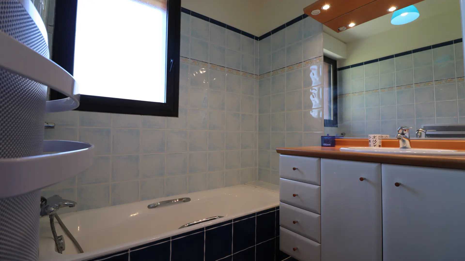 - Une salle de bains privative avec baignoire et vasque.