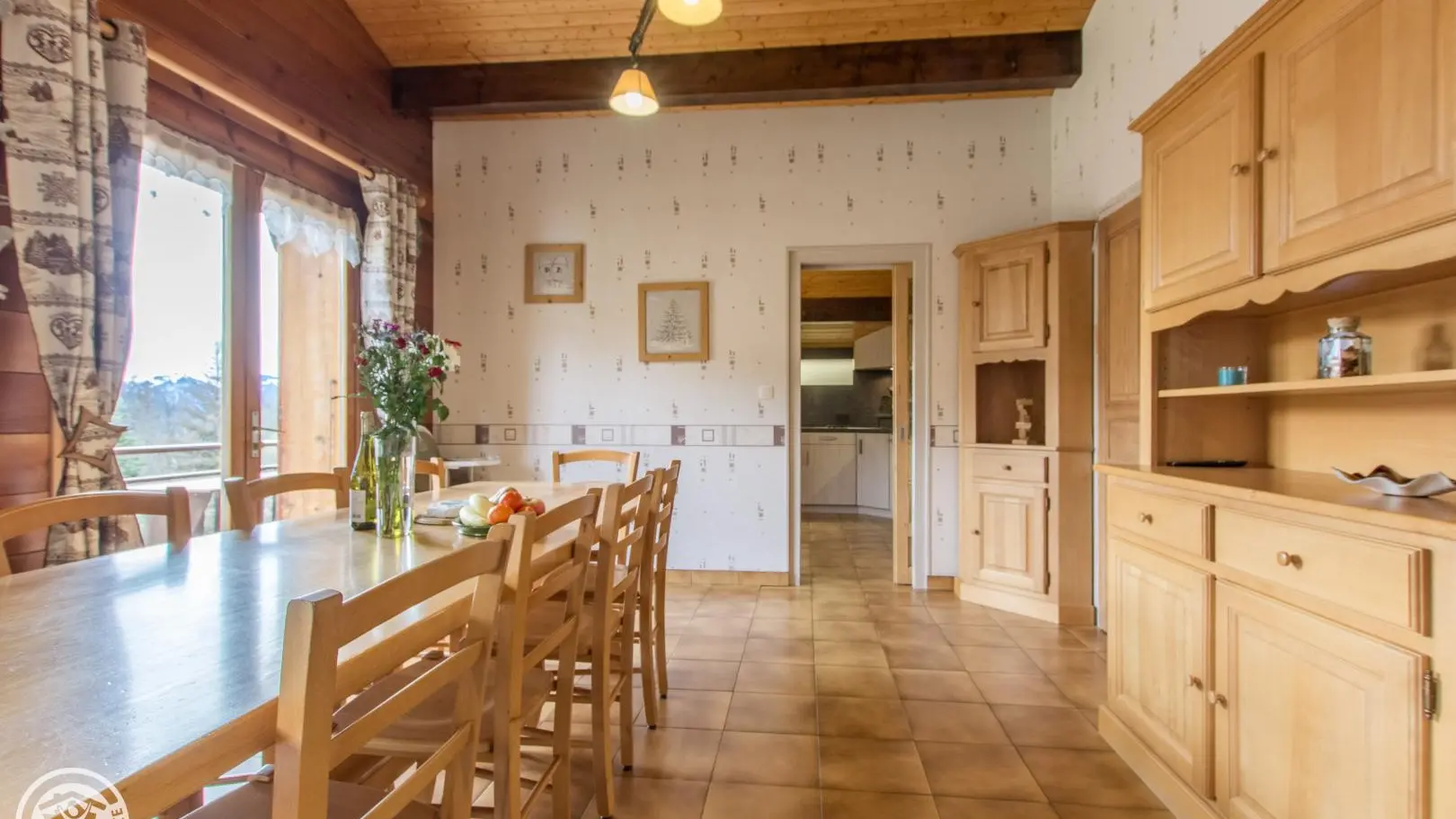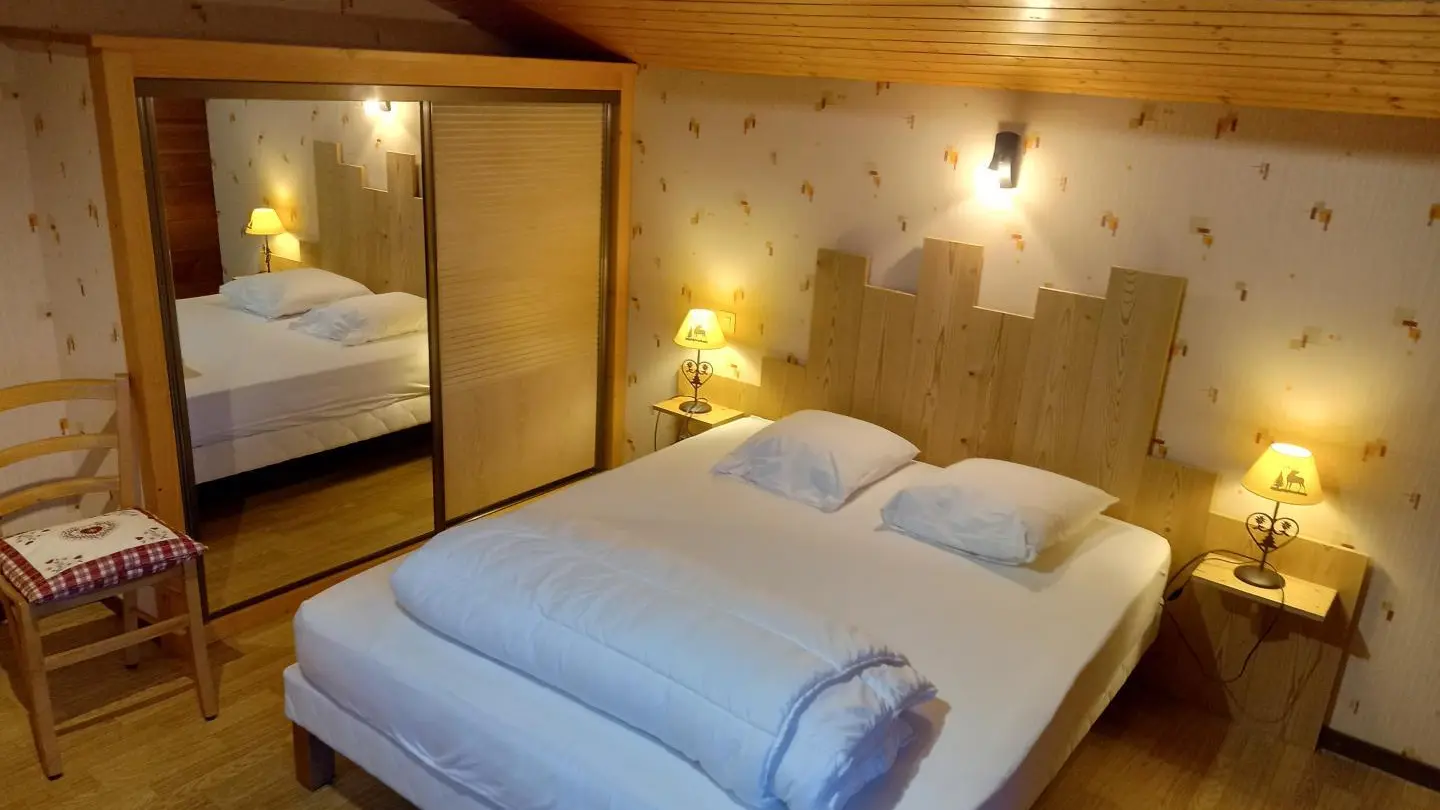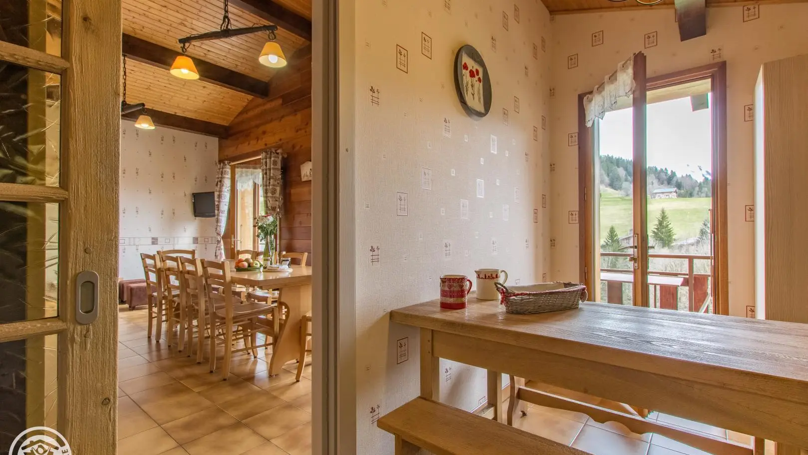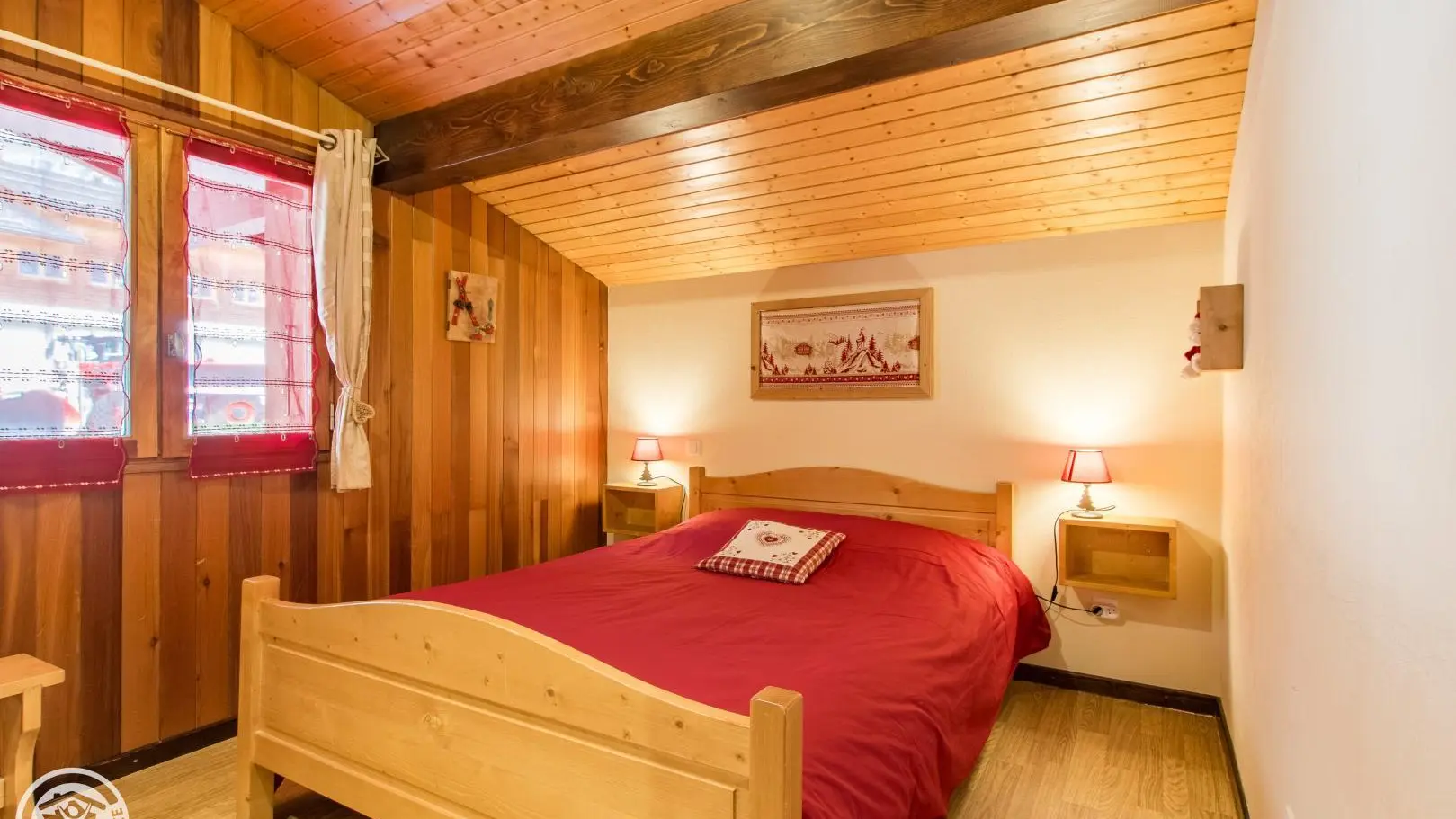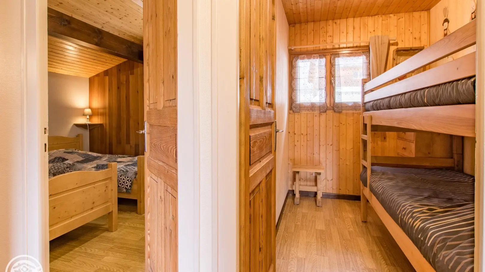 Appartement de 96m² aménagé au 1er étage (depuis le parking sur l'arrière du chalet) d'un grand chalet comprenant 3 autres logements. Entrée commune. Belle ambiance montagne à l'intérieur. Le chalet est situé à l'entrée du village du Chinaillon - Le Grand-Bornand. Hall d'entrée dans couloir avec placards, cuisine équipée avec accès au balcon, séjour avec table repas, canapé convertible clic-clac, poufs, télévision, accès au balcon. Chambre 1 (2 lits 90x190cm), chambre 2 (1 lit 140x190cm), chambre 3 (1 lit 140x190cm, lit bébé, accès au balcon), petite chambre 4 (2 lits superposés 80x190cm). Mezzanine très mansardée (accès par échelle) : 2 lits d'appoint 70cm.
