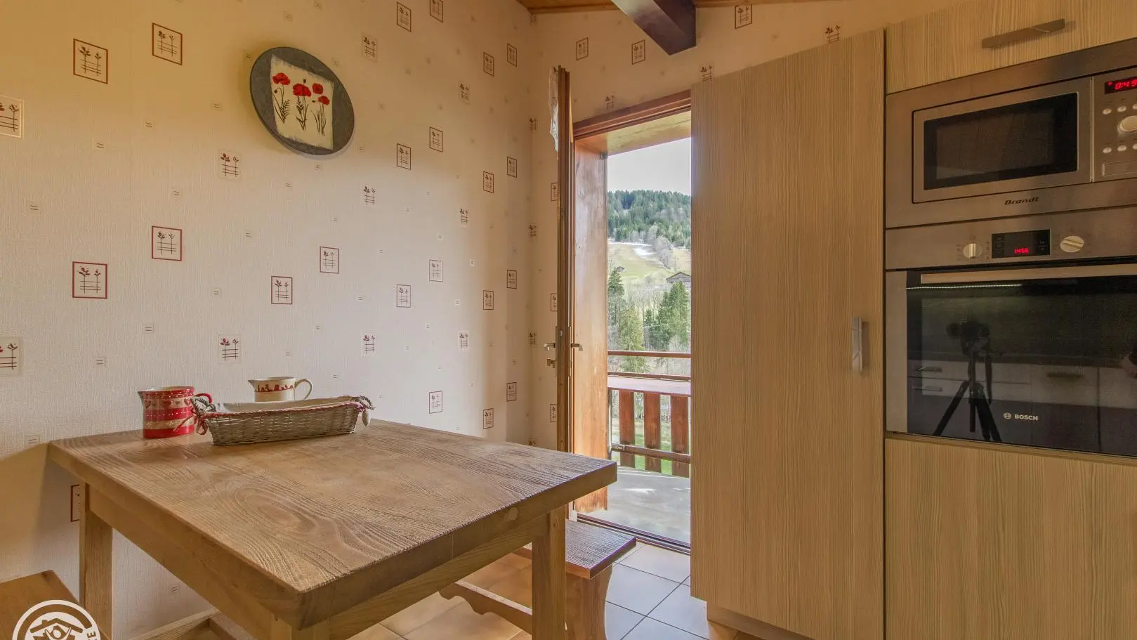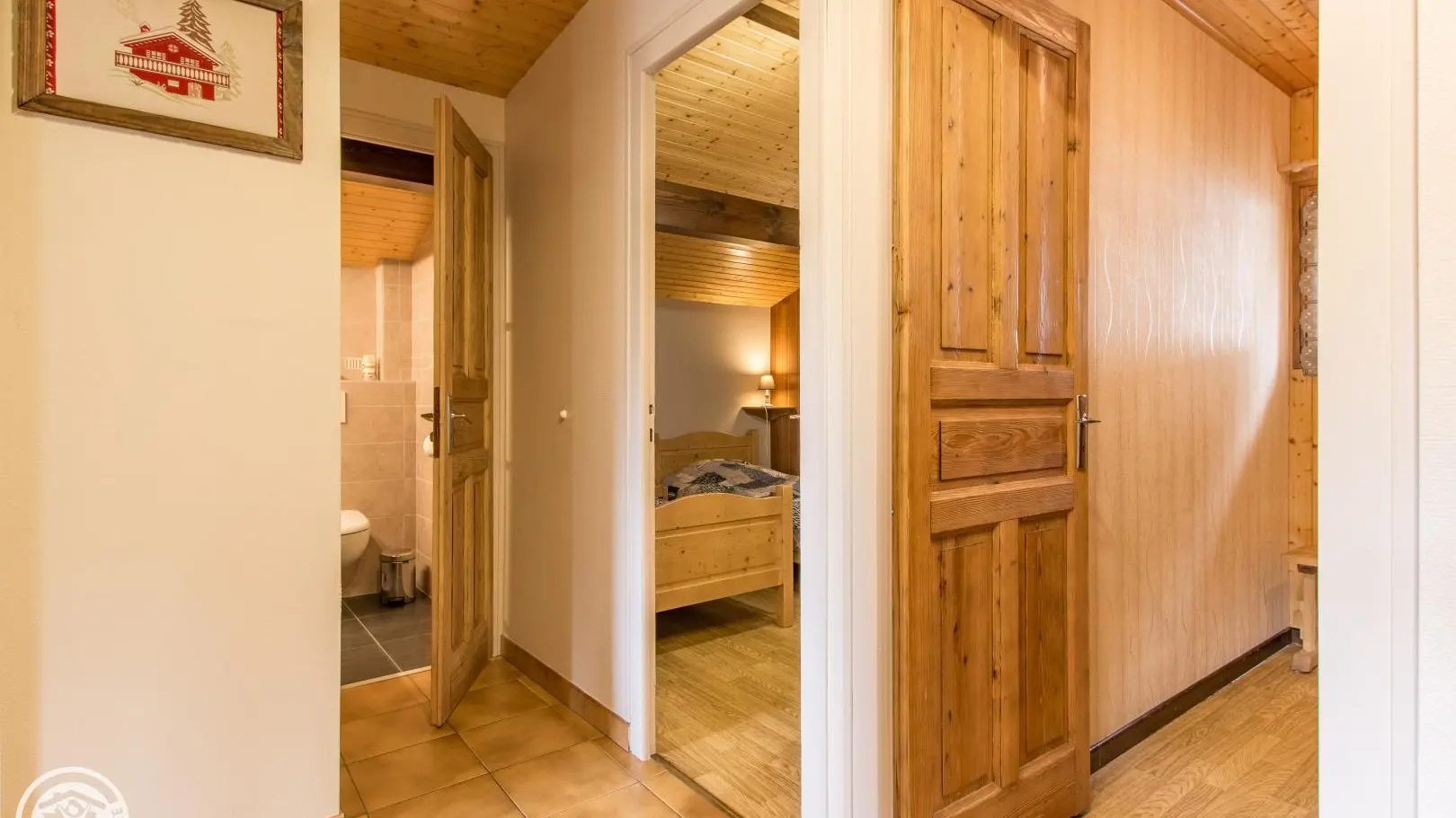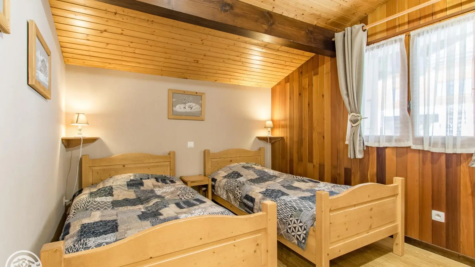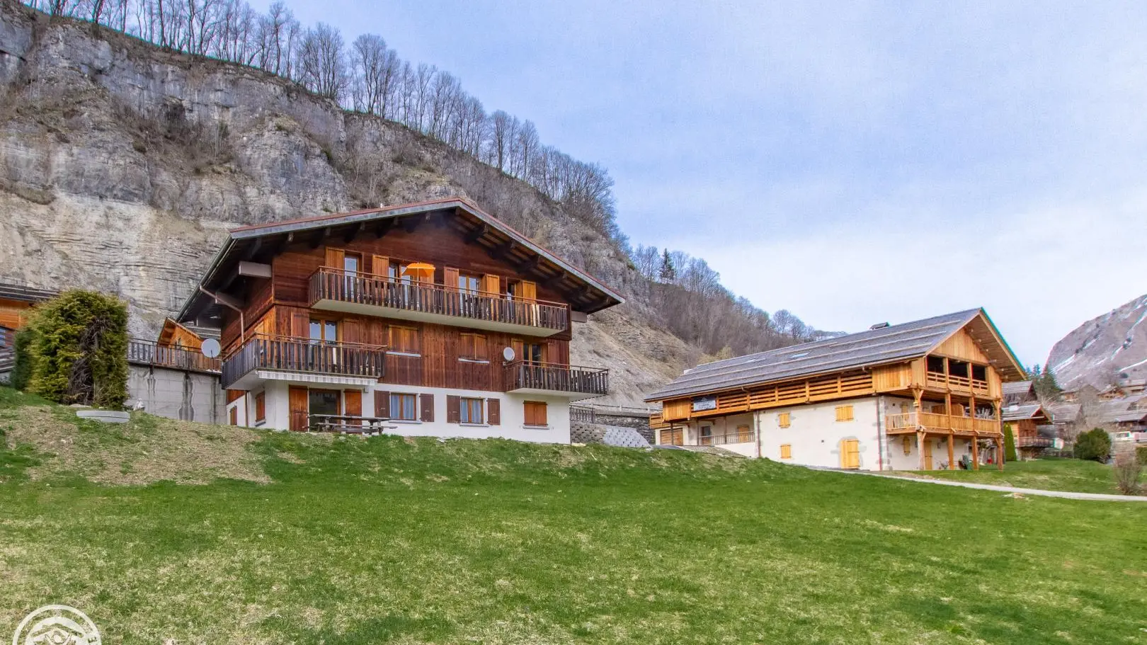 Appartement de 96m² aménagé au 1er étage (depuis le parking sur l'arrière du chalet) d'un grand chalet comprenant 3 autres logements. Entrée commune. Belle ambiance montagne à l'intérieur. Le chalet est situé à l'entrée du village du Chinaillon - Le Grand-Bornand. Hall d'entrée dans couloir avec placards, cuisine équipée avec accès au balcon, séjour avec table repas, canapé convertible clic-clac, poufs, télévision, accès au balcon. Chambre 1 (2 lits 90x190cm), chambre 2 (1 lit 140x190cm), chambre 3 (1 lit 140x190cm, lit bébé, accès au balcon), petite chambre 4 (2 lits superposés 80x190cm). Mezzanine très mansardée (accès par échelle) : 2 lits d'appoint 70cm.
