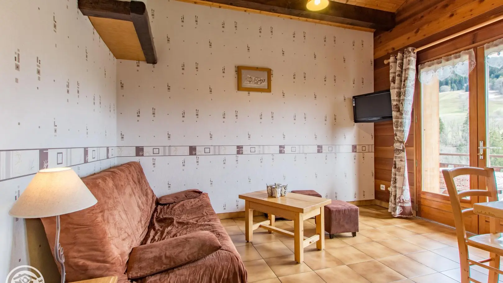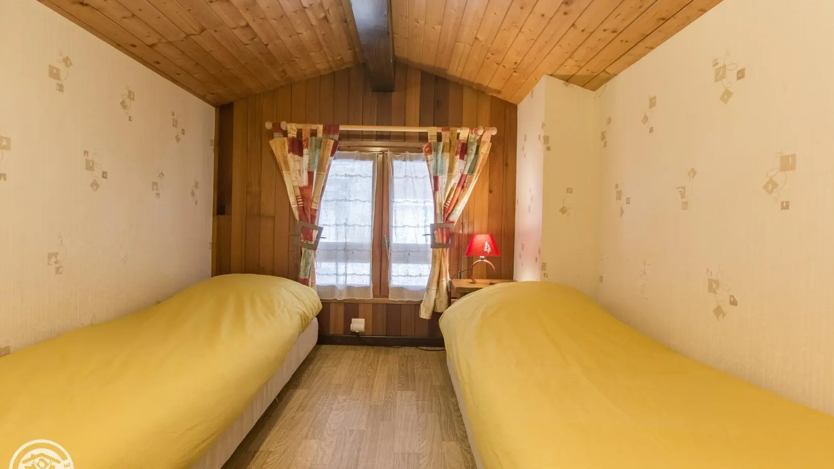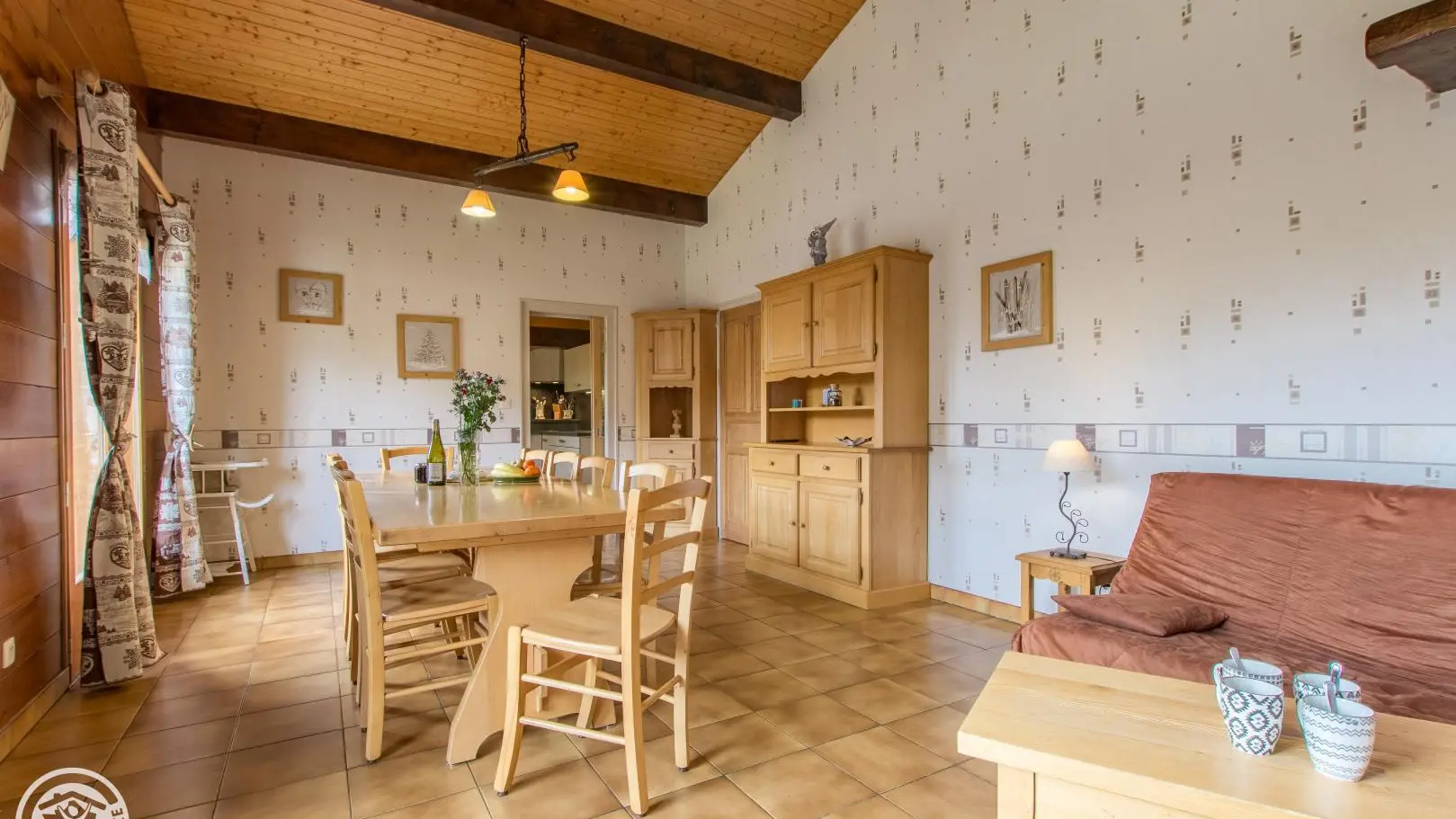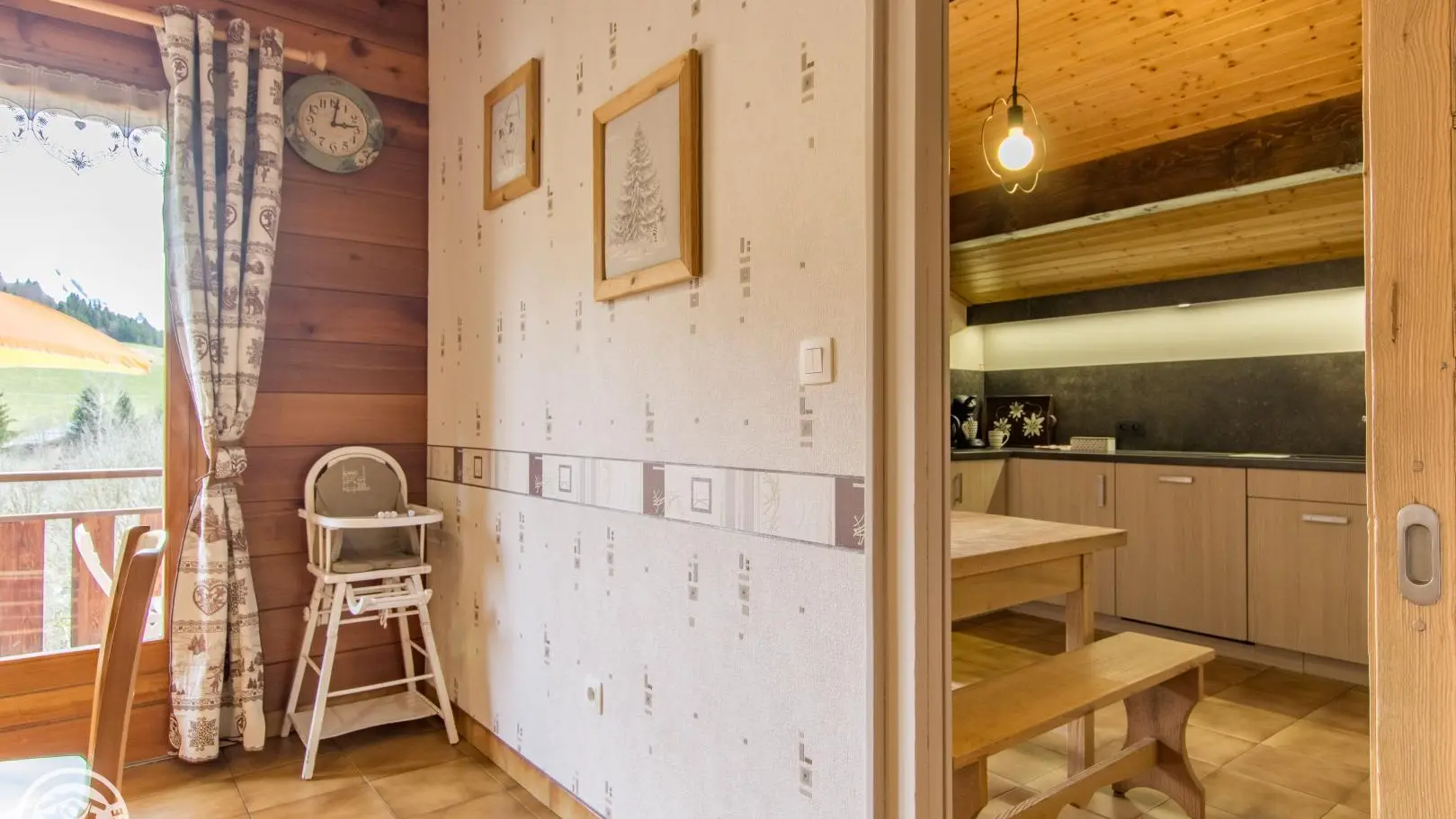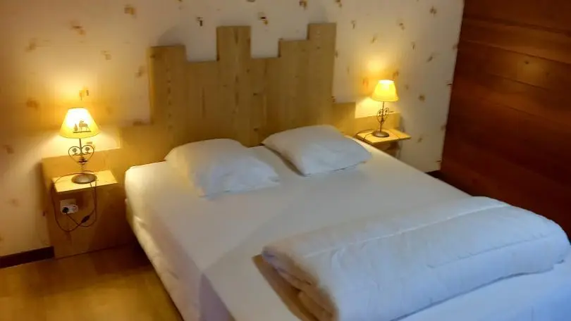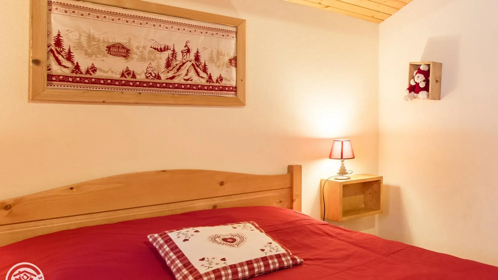 Appartement de 96m² aménagé au 1er étage (depuis le parking sur l'arrière du chalet) d'un grand chalet comprenant 3 autres logements. Entrée commune. Belle ambiance montagne à l'intérieur. Le chalet est situé à l'entrée du village du Chinaillon - Le Grand-Bornand. Hall d'entrée dans couloir avec placards, cuisine équipée avec accès au balcon, séjour avec table repas, canapé convertible clic-clac, poufs, télévision, accès au balcon. Chambre 1 (2 lits 90x190cm), chambre 2 (1 lit 140x190cm), chambre 3 (1 lit 140x190cm, lit bébé, accès au balcon), petite chambre 4 (2 lits superposés 80x190cm). Mezzanine très mansardée (accès par échelle) : 2 lits d'appoint 70cm.
