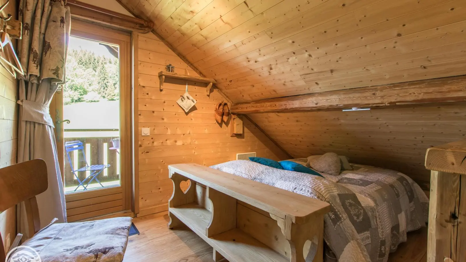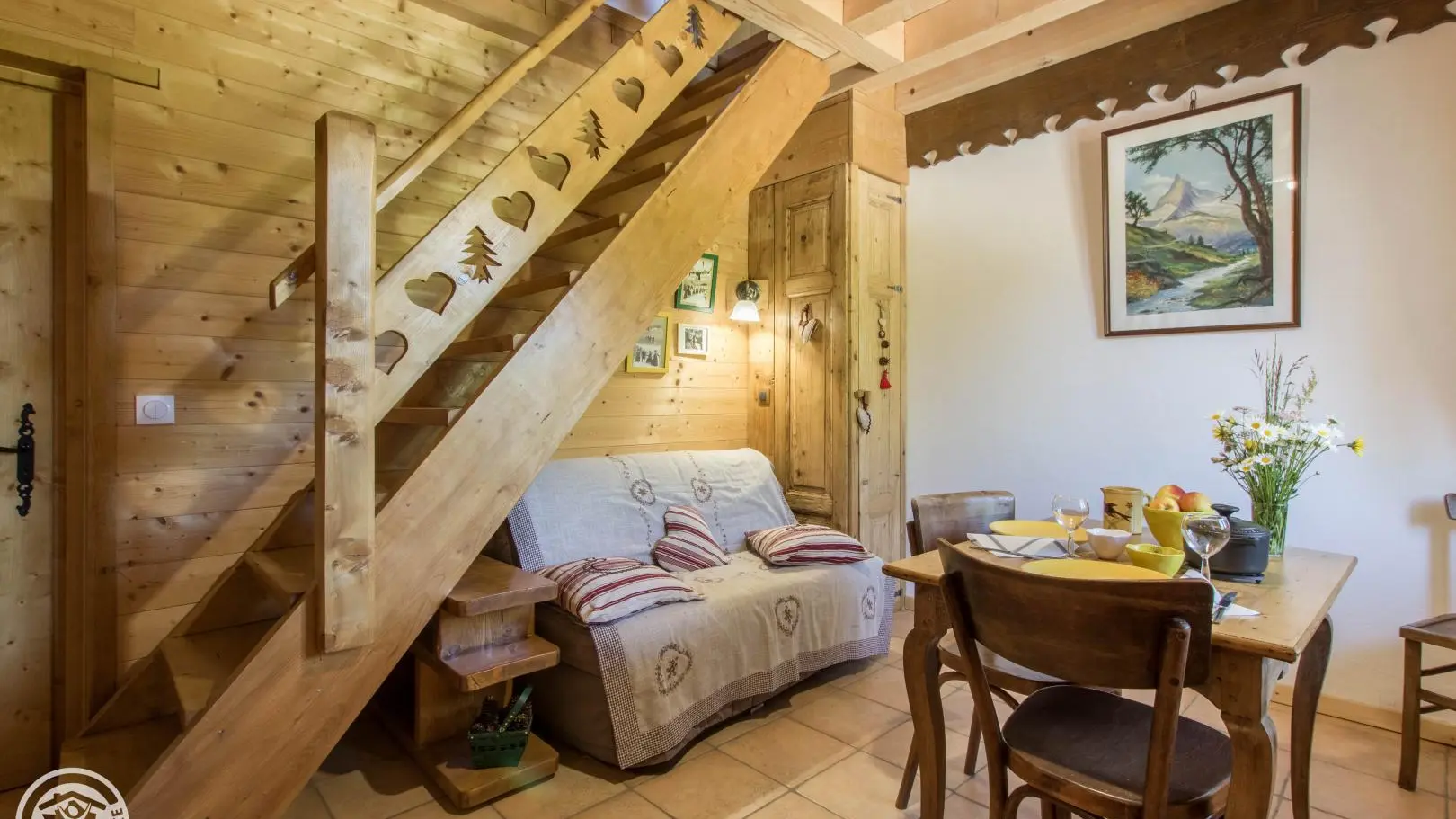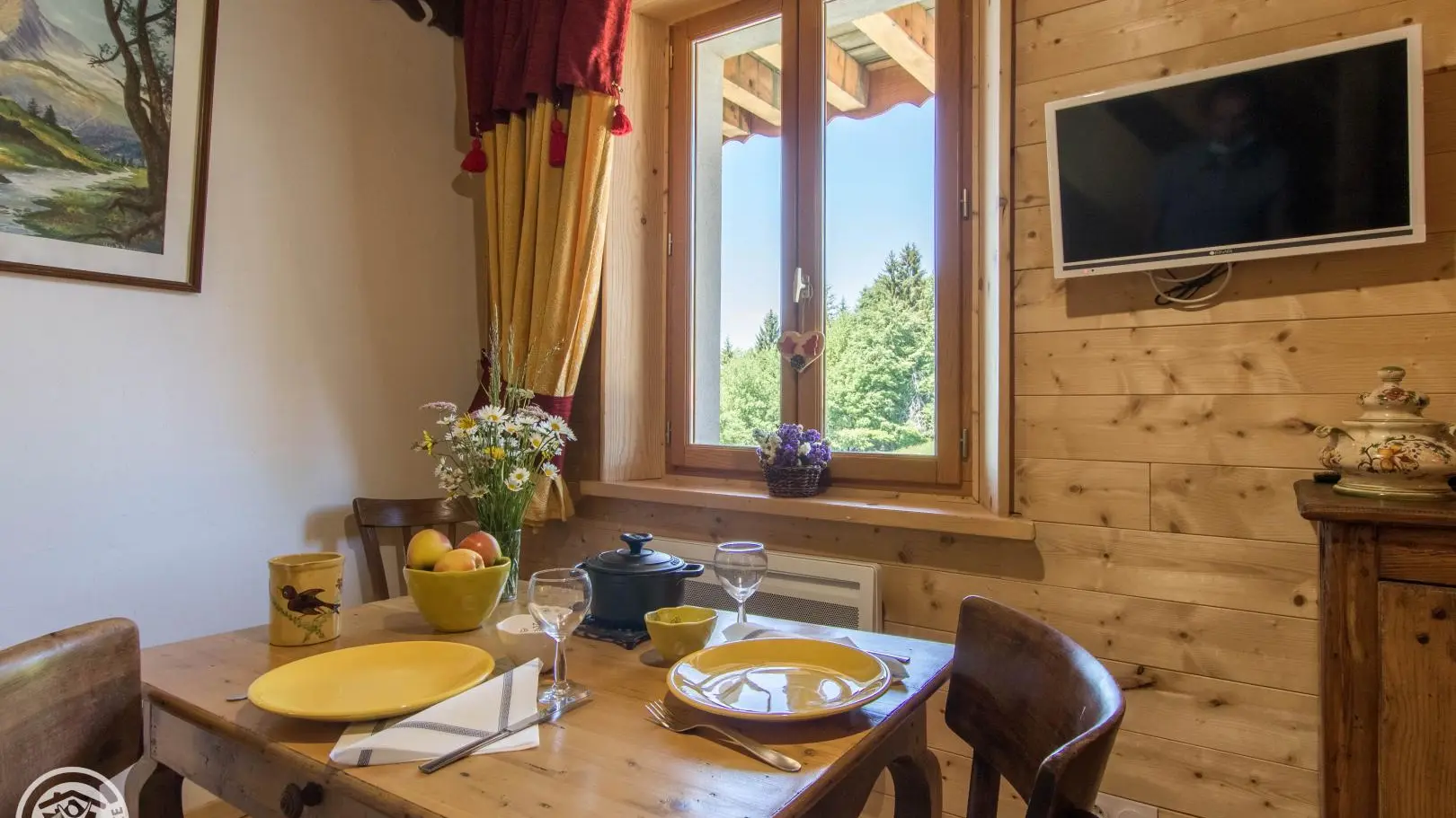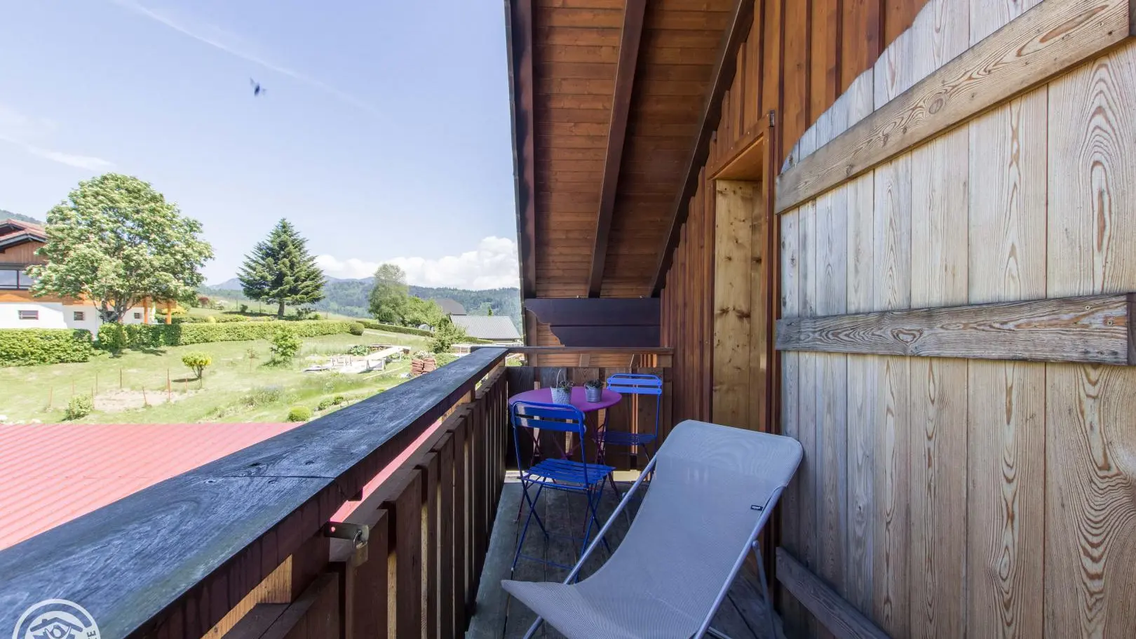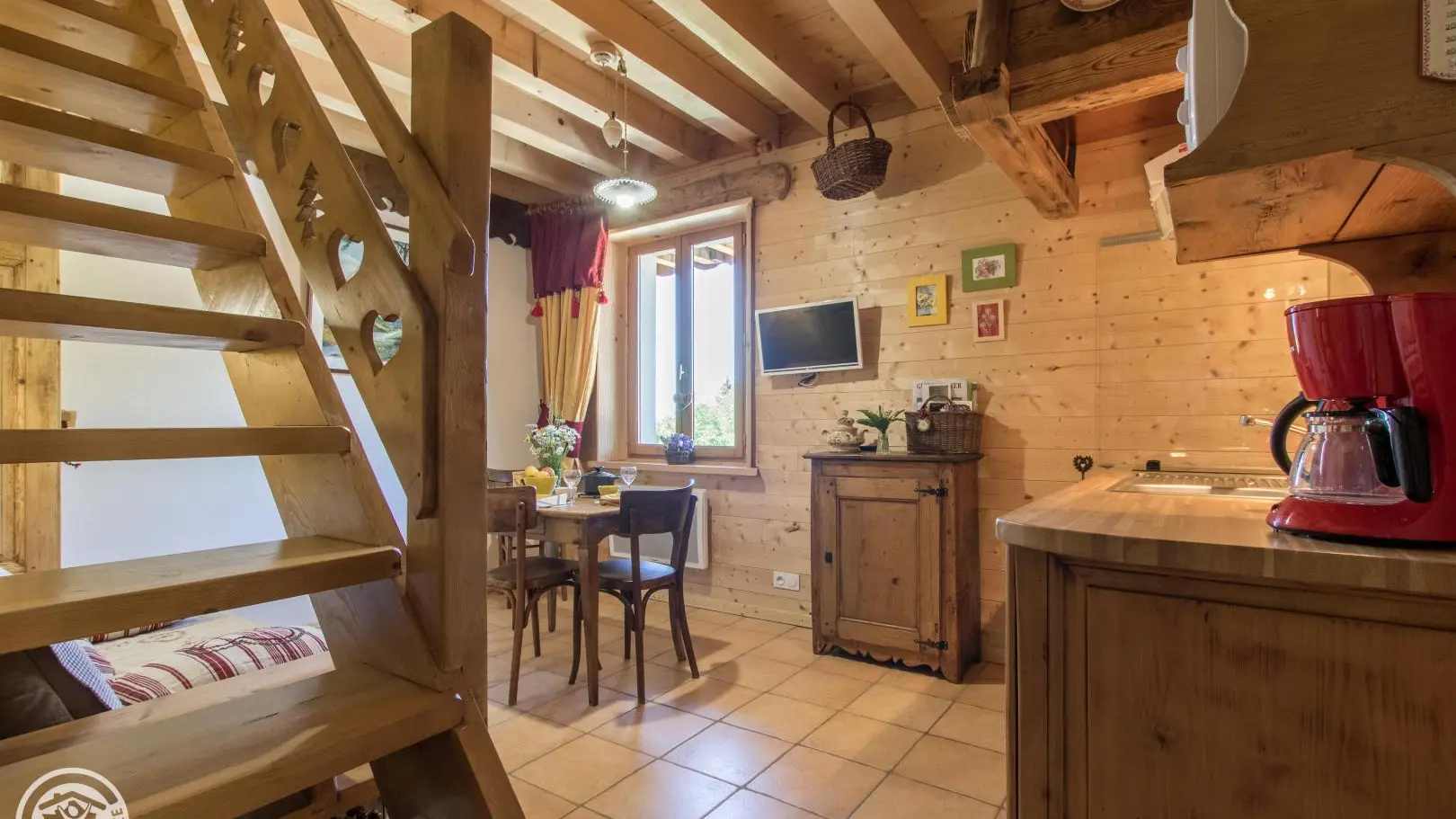 Gîte (21m² + 6m² mansardés) décoré avec goût et aménagé au 1er étage d'une ancienne ferme restaurée comprenant 2 autres gîtes sur le même niveau, l'habitation et le restaurant familial des propriétaires. Entrée commune. Cuisine ouverte sur séjour, banquette. En duplex : chambre mansardée (1 lit 140x190cm), salle d'eau ouverte (douche, vasque, sèche-serviettes, WC), accès au balcon (salon de jardin, transats). Buanderie commune aux 3 gîtes (lave-linge). Terrain/jardin commun avec vue sur le Lac Léman (salon de jardin, chaises longues, barbecue. Parking. Location draps. Casier à skis privé. Ski : Les Habères 4.2km. Thonon, Thermes, Lac Léman 17km, nombreuses randonnées en Vallée Verte. Genève 34km. Peu ou pas de réseau portable.