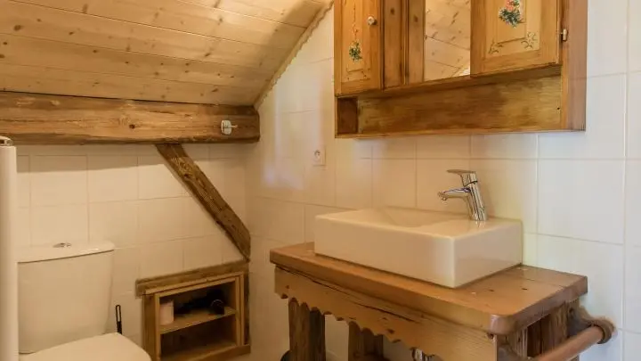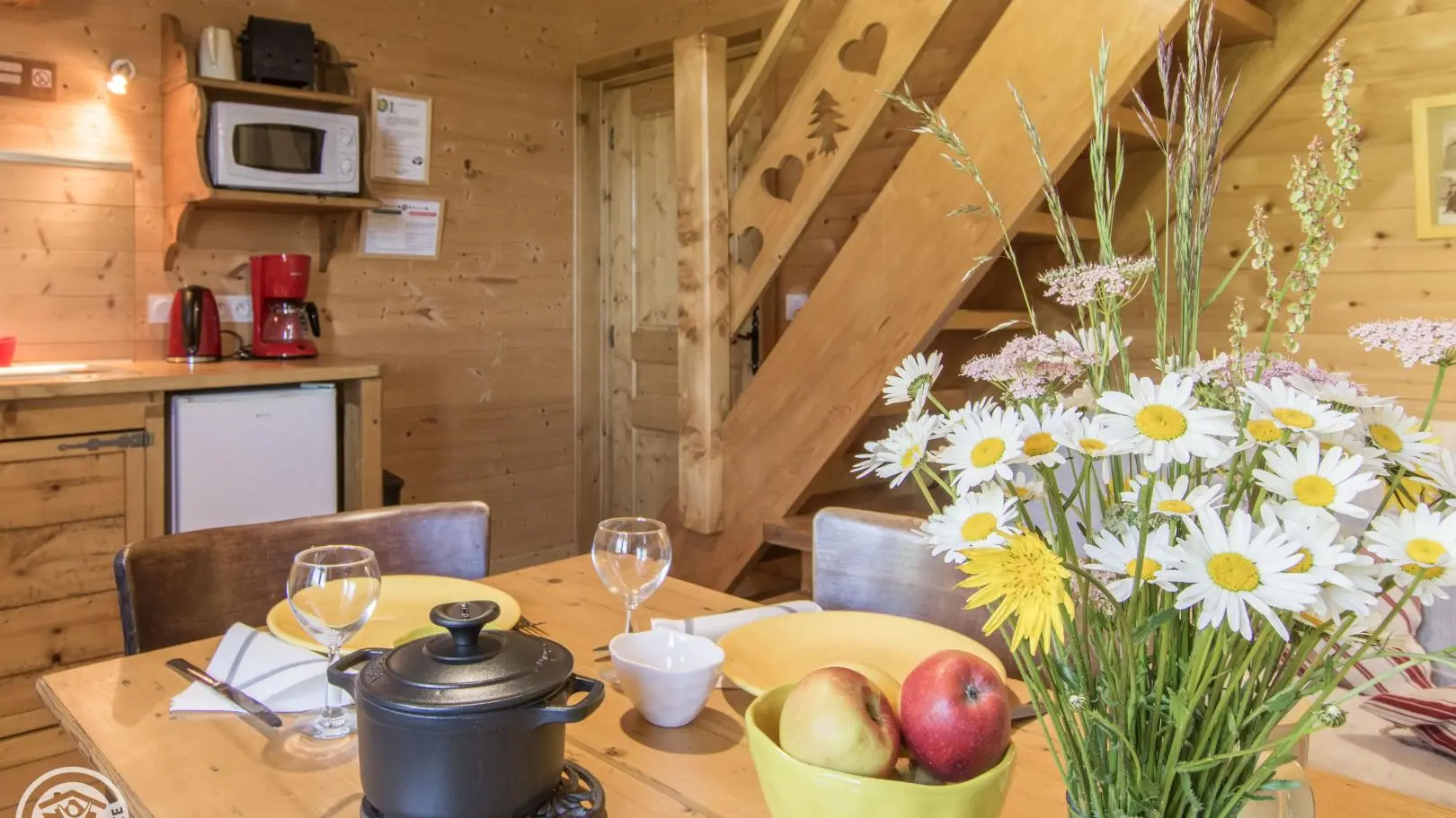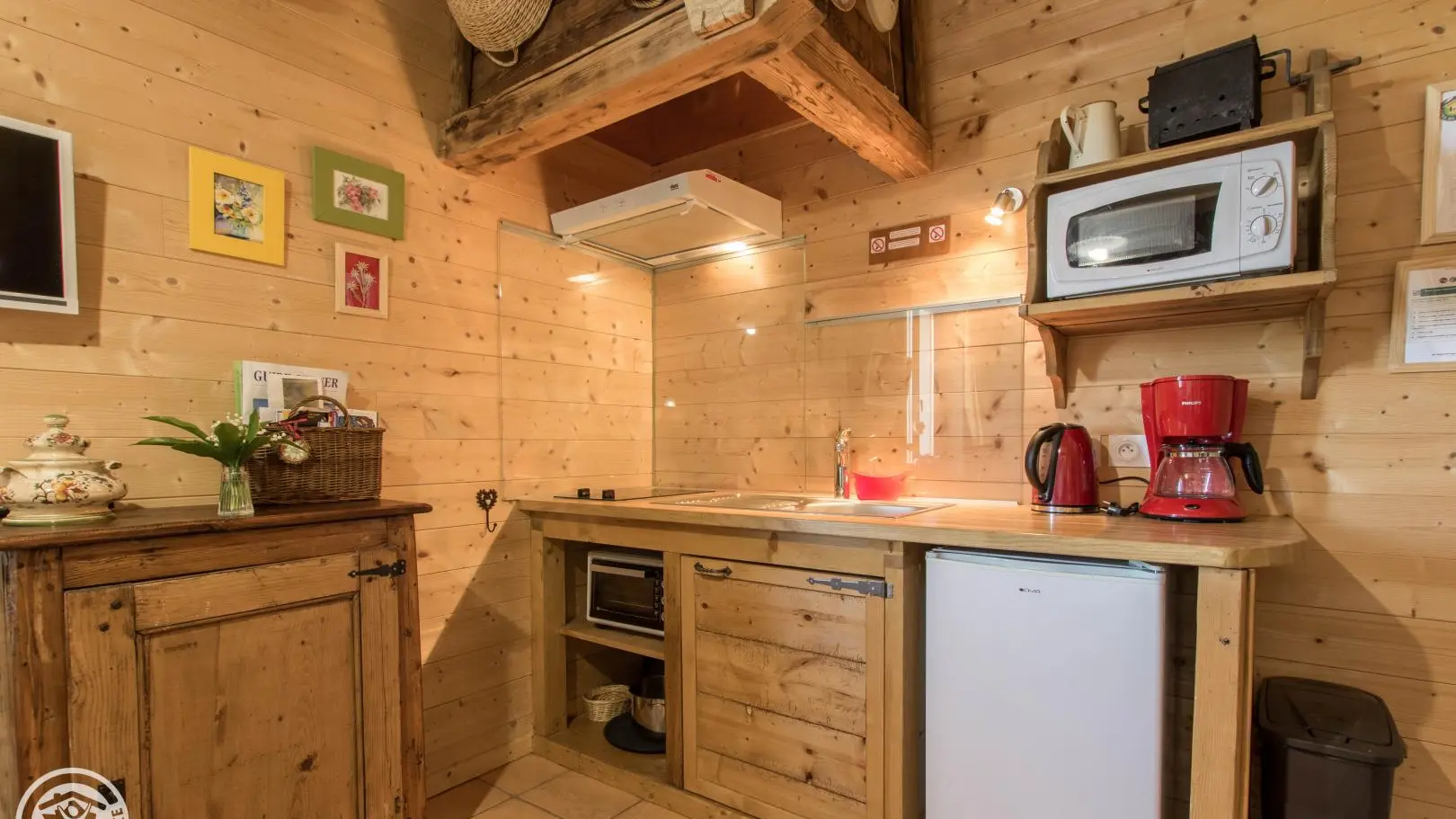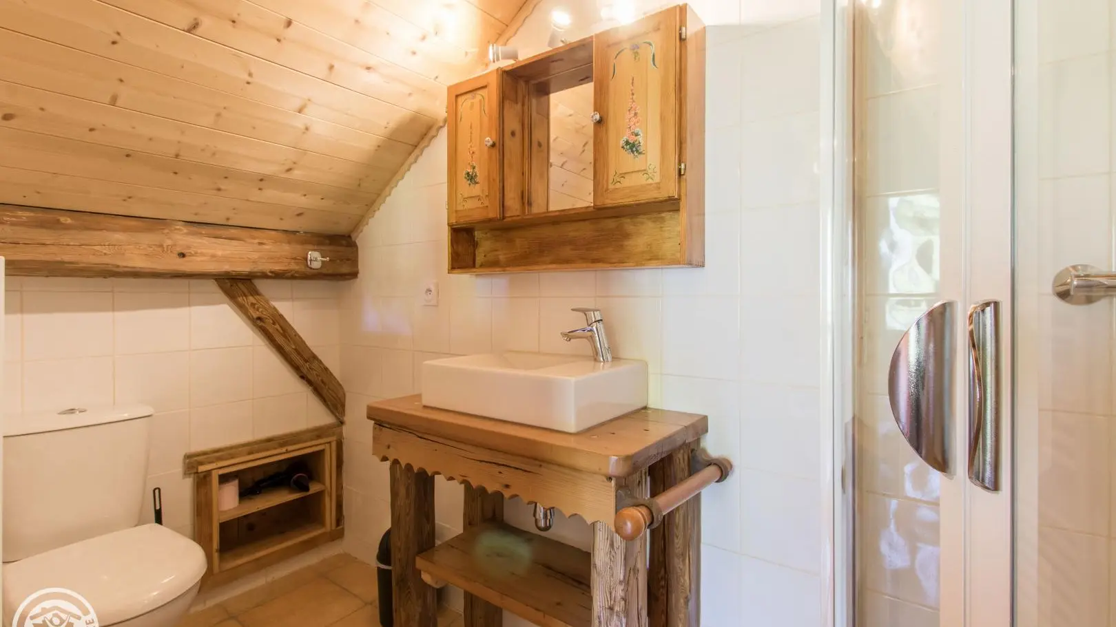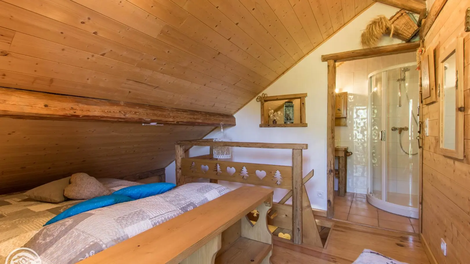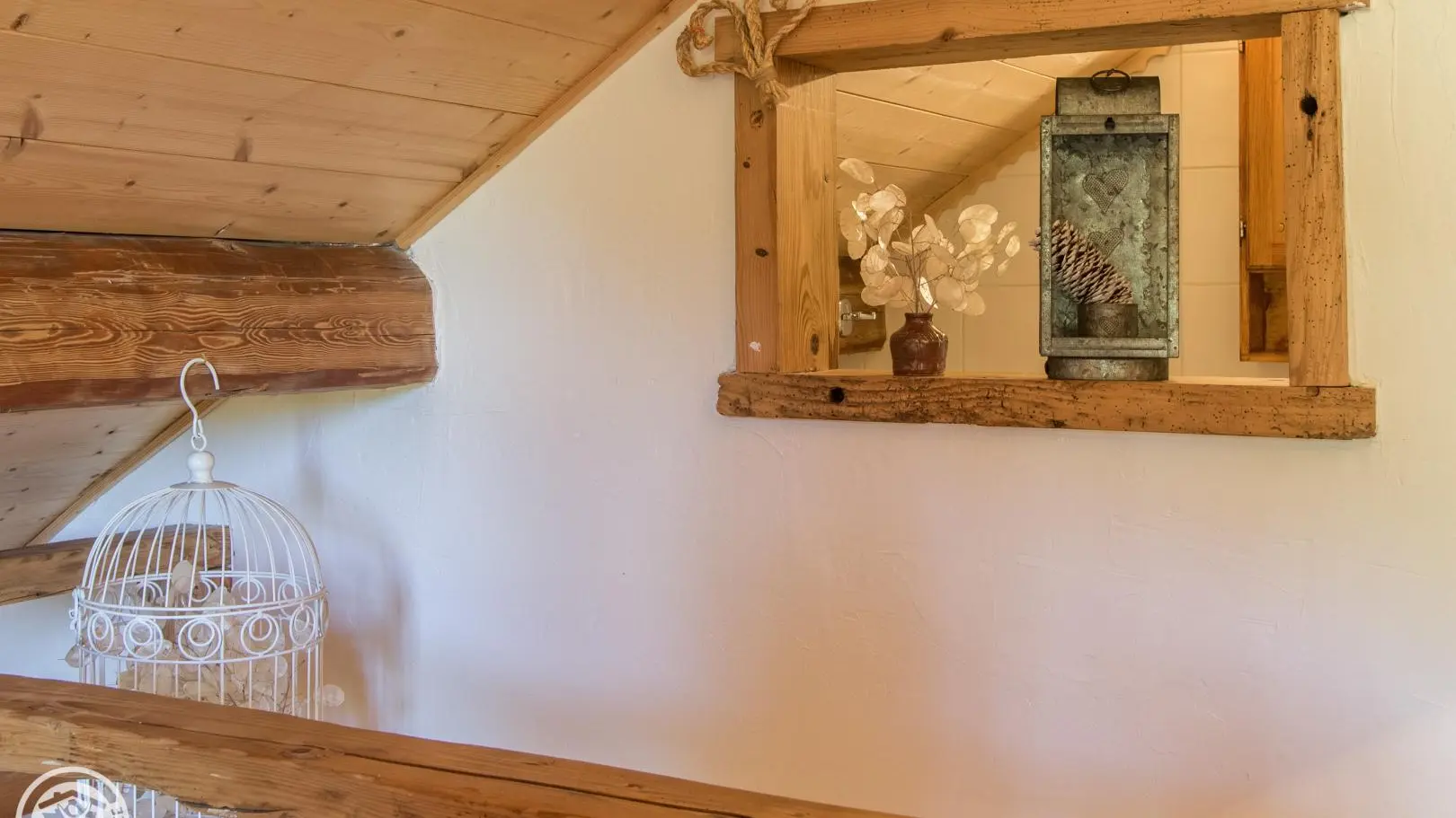Gîte (21m² + 6m² mansardés) décoré avec goût et aménagé au 1er étage d'une ancienne ferme restaurée comprenant 2 autres gîtes sur le même niveau, l'habitation et le restaurant familial des propriétaires. Entrée commune. Cuisine ouverte sur séjour, banquette. En duplex : chambre mansardée (1 lit 140x190cm), salle d'eau ouverte (douche, vasque, sèche-serviettes, WC), accès au balcon (salon de jardin, transats). Buanderie commune aux 3 gîtes (lave-linge). Terrain/jardin commun avec vue sur le Lac Léman (salon de jardin, chaises longues, barbecue. Parking. Location draps. Casier à skis privé. Ski : Les Habères 4.2km. Thonon, Thermes, Lac Léman 17km, nombreuses randonnées en Vallée Verte. Genève 34km. Peu ou pas de réseau portable.
