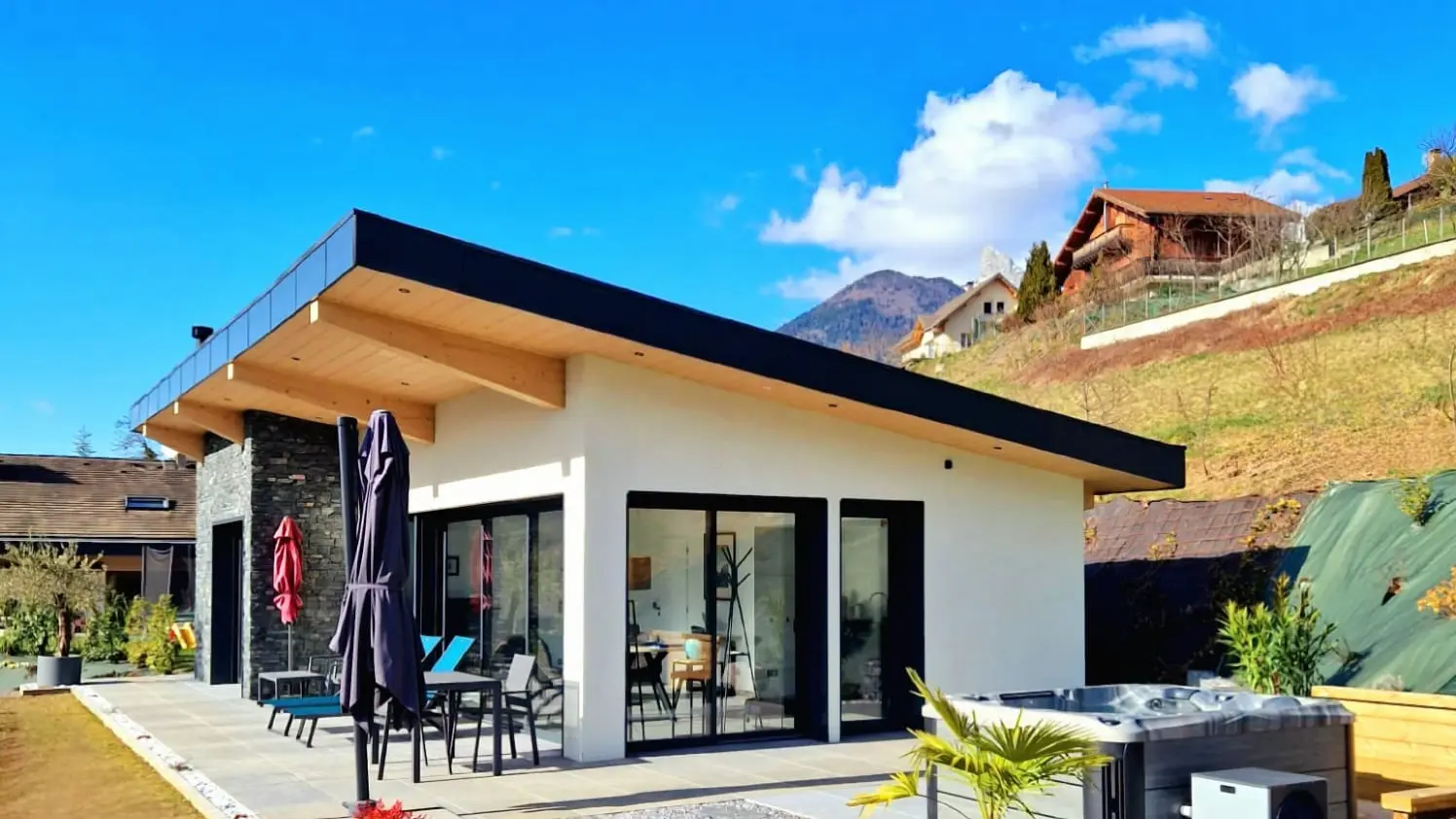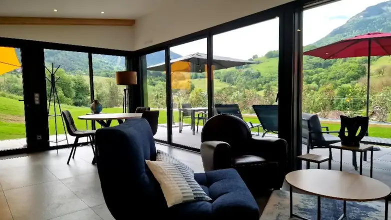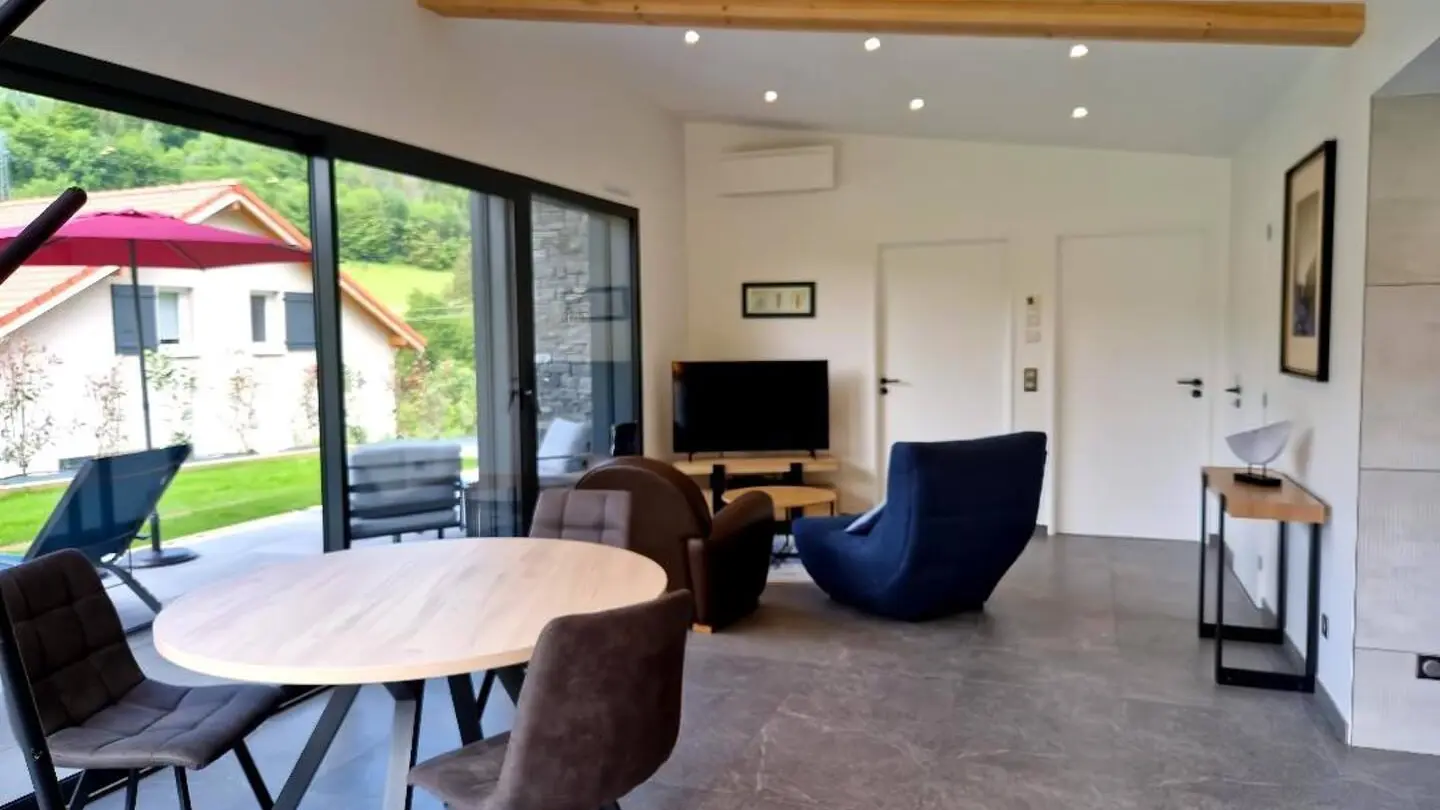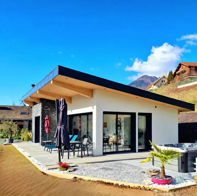 Le “427” est un gîte neuf indépendant (4 *) avec SPA privé et prestations haut de gamme : maison conçue pour 2, sur grand terrain avec terrasse et vue panoramique sur les Bauges.