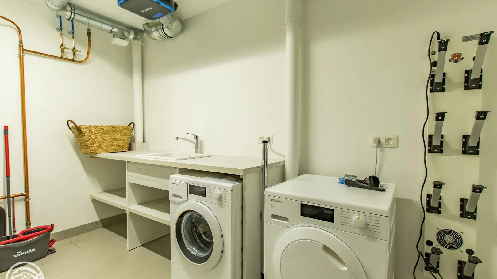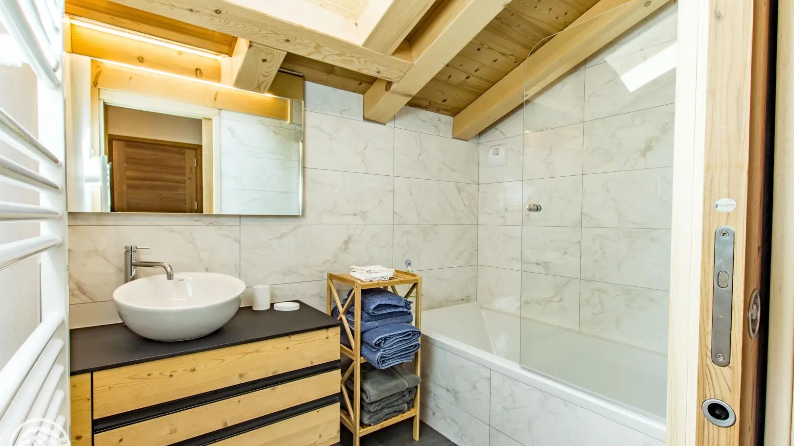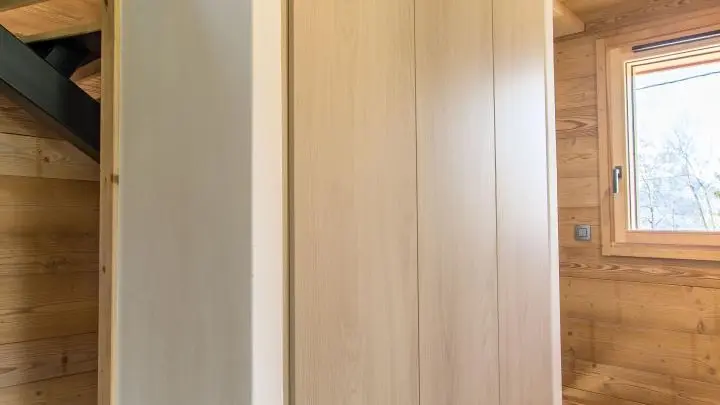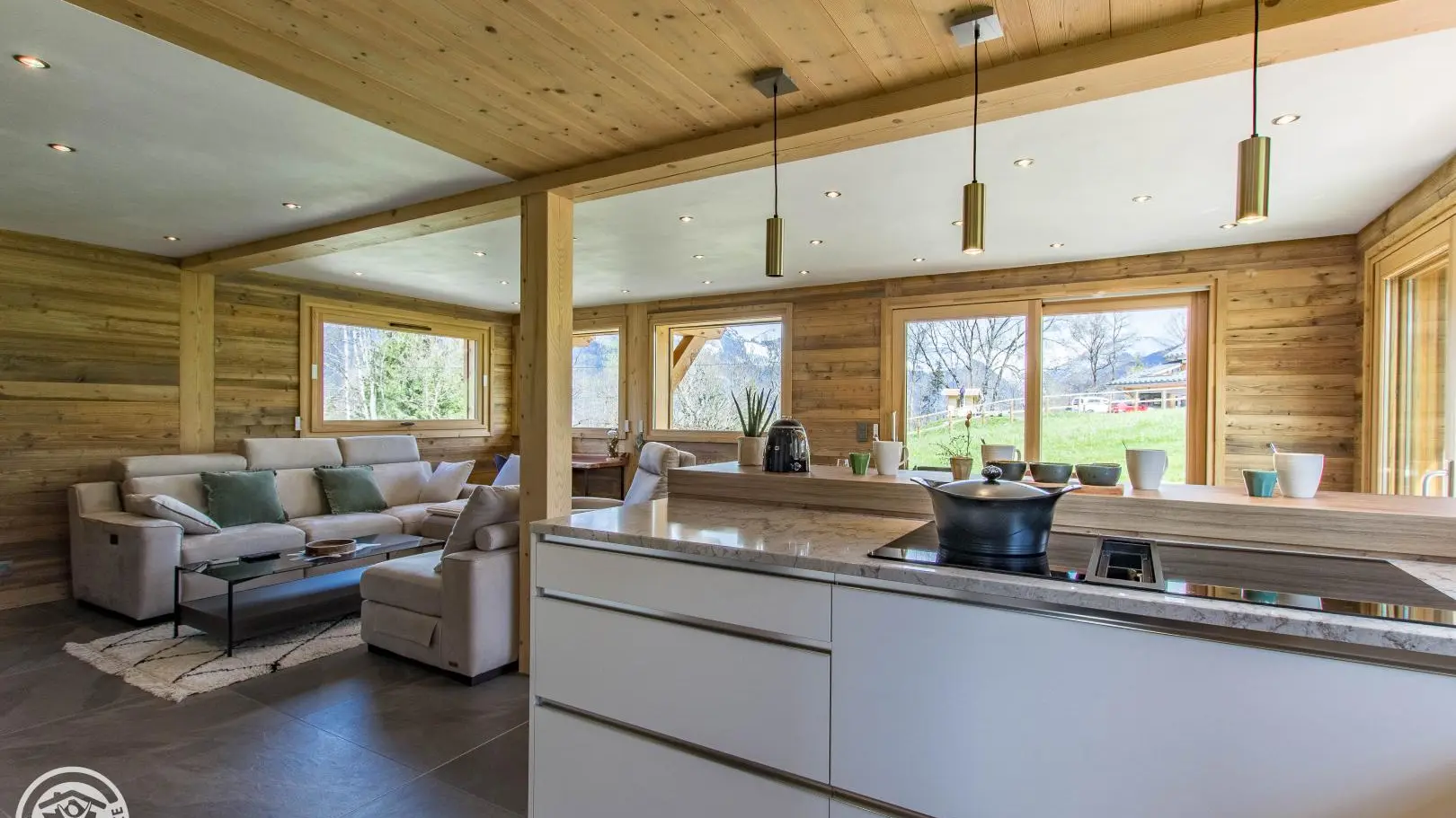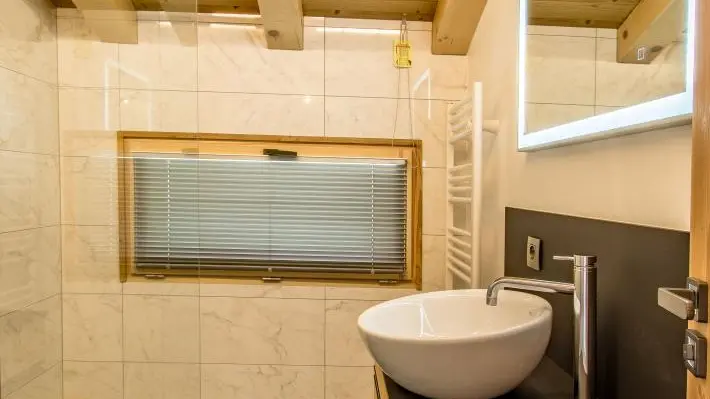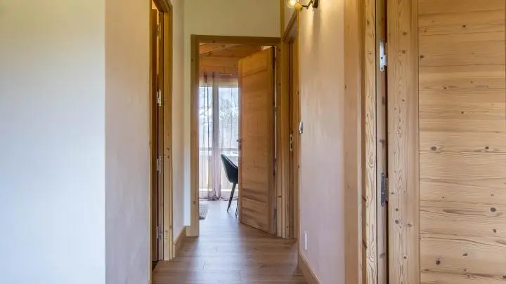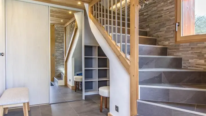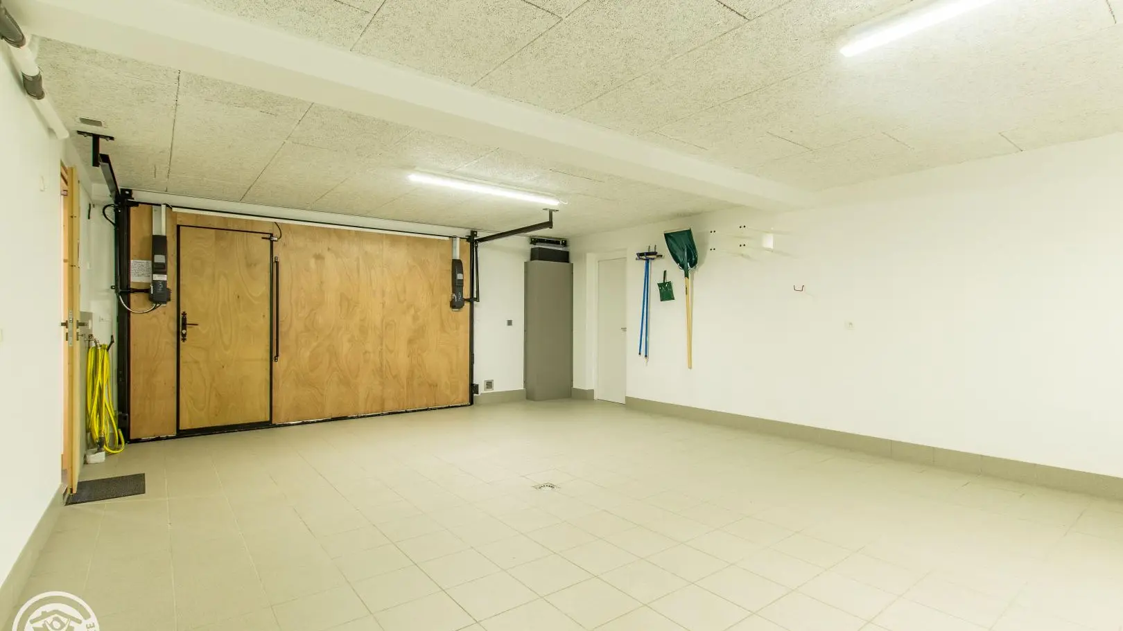 Le chalet est aménagé sur 3 niveaux. Au rez-de-chaussée : hall d'entrée, vaste garage de 40m2, buanderie, cave.
