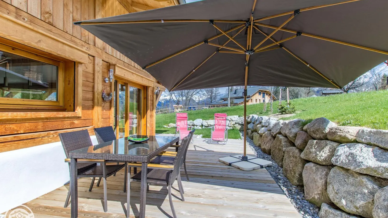 Balcon, cour, jardin, et terrasse avec mobilier de jardin, parasol, transats et plancha.