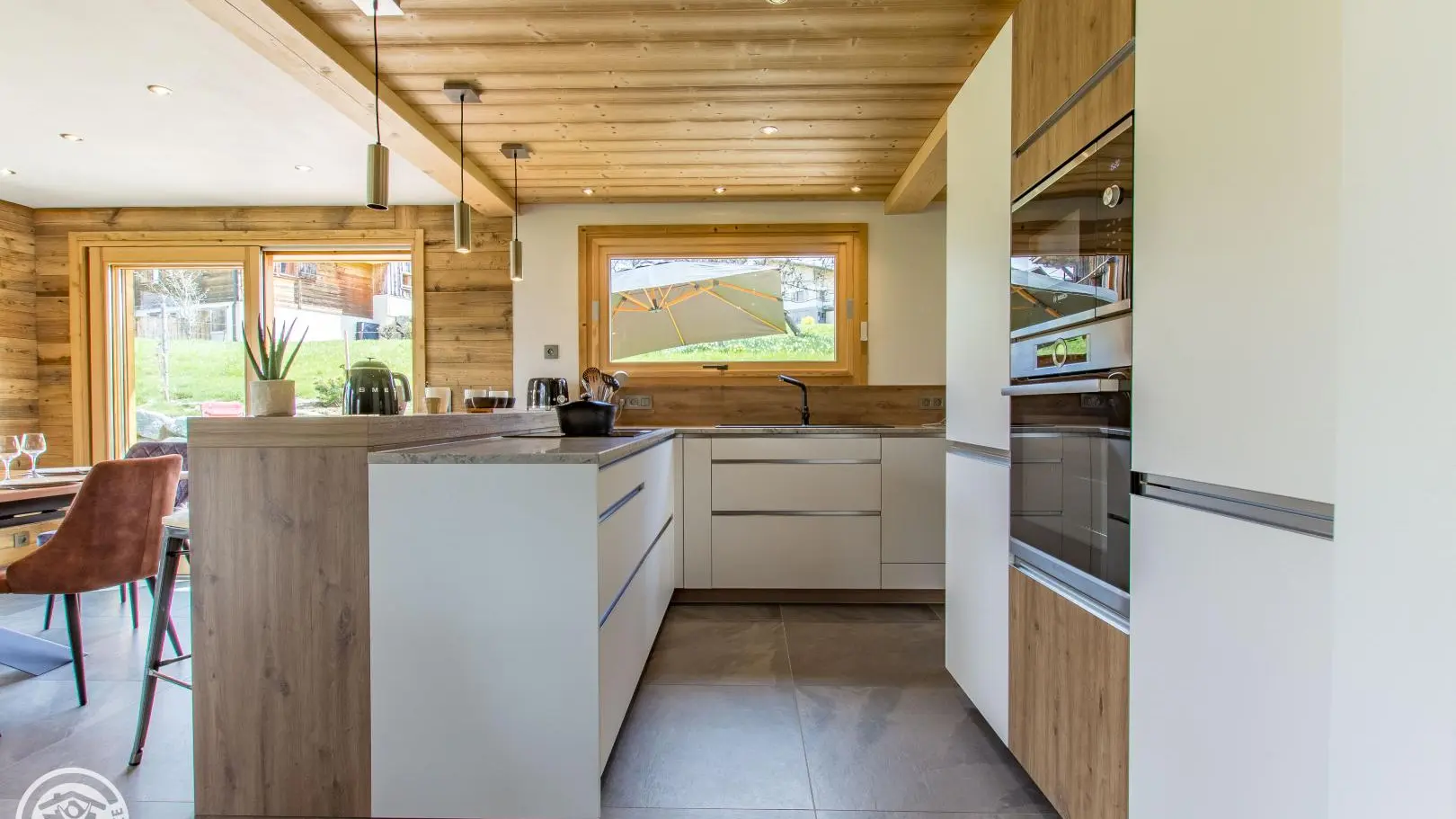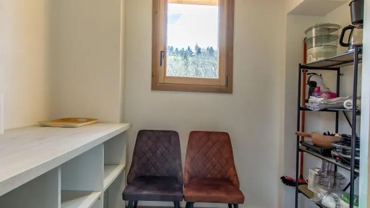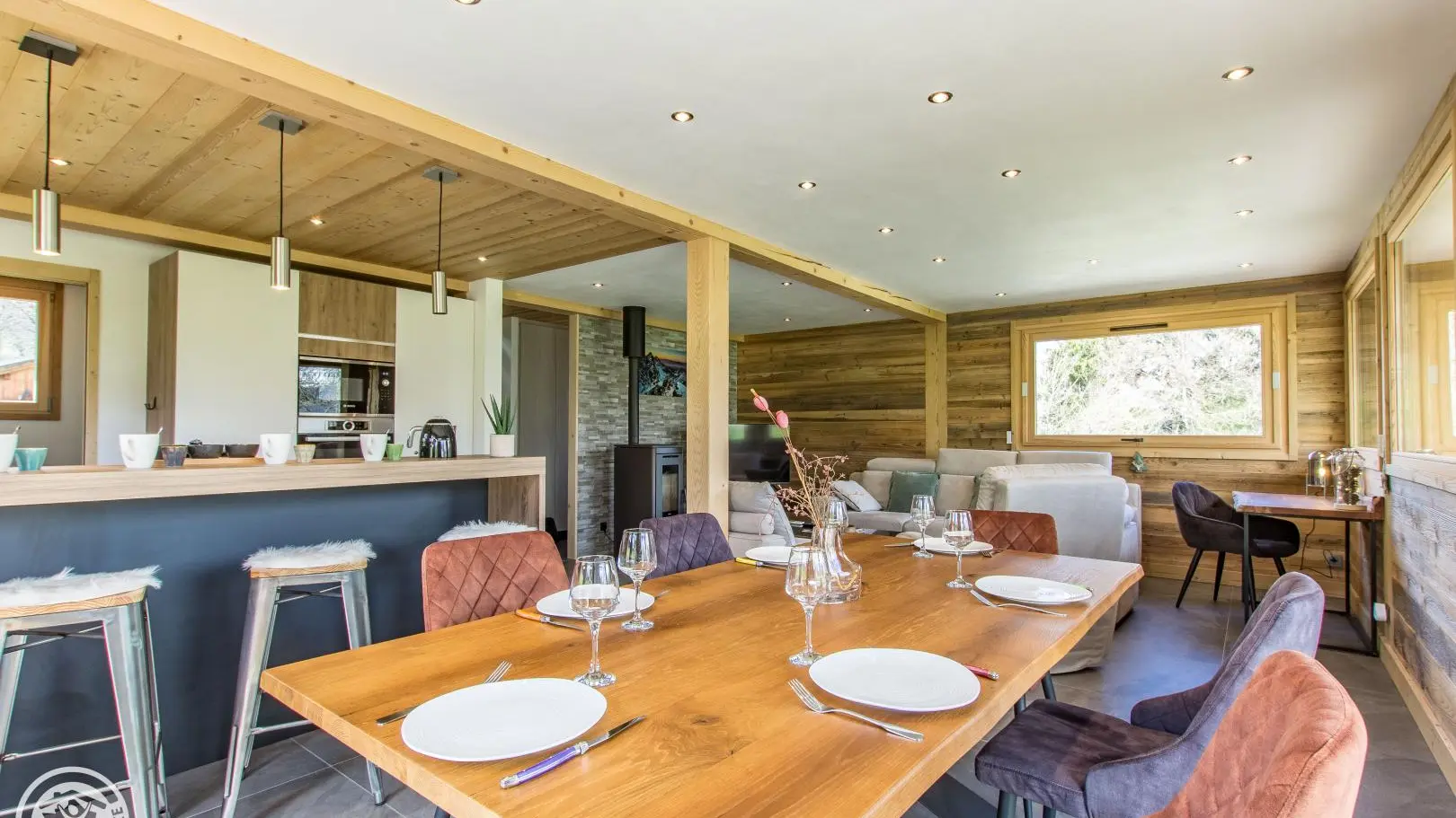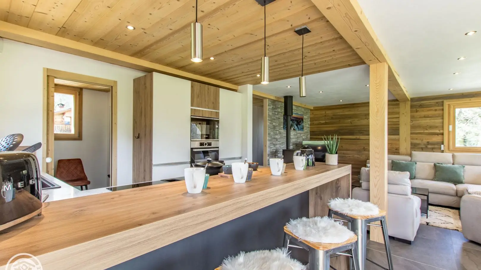 Au 1er étage : cuisine intégrée (+cellier) ouverte sur séjour (poêle à bois, canapé, Tv), wc indépendant, coin dressing.