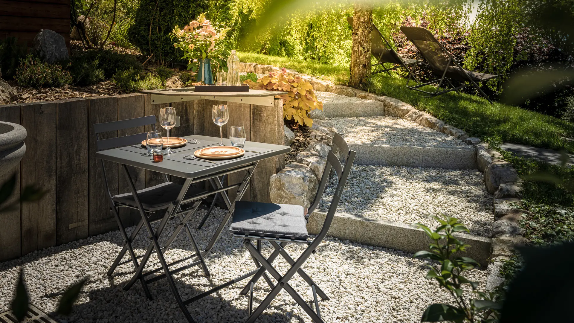 Grand parc arboré attenant à la terrasse avec banc et transats à disposition.