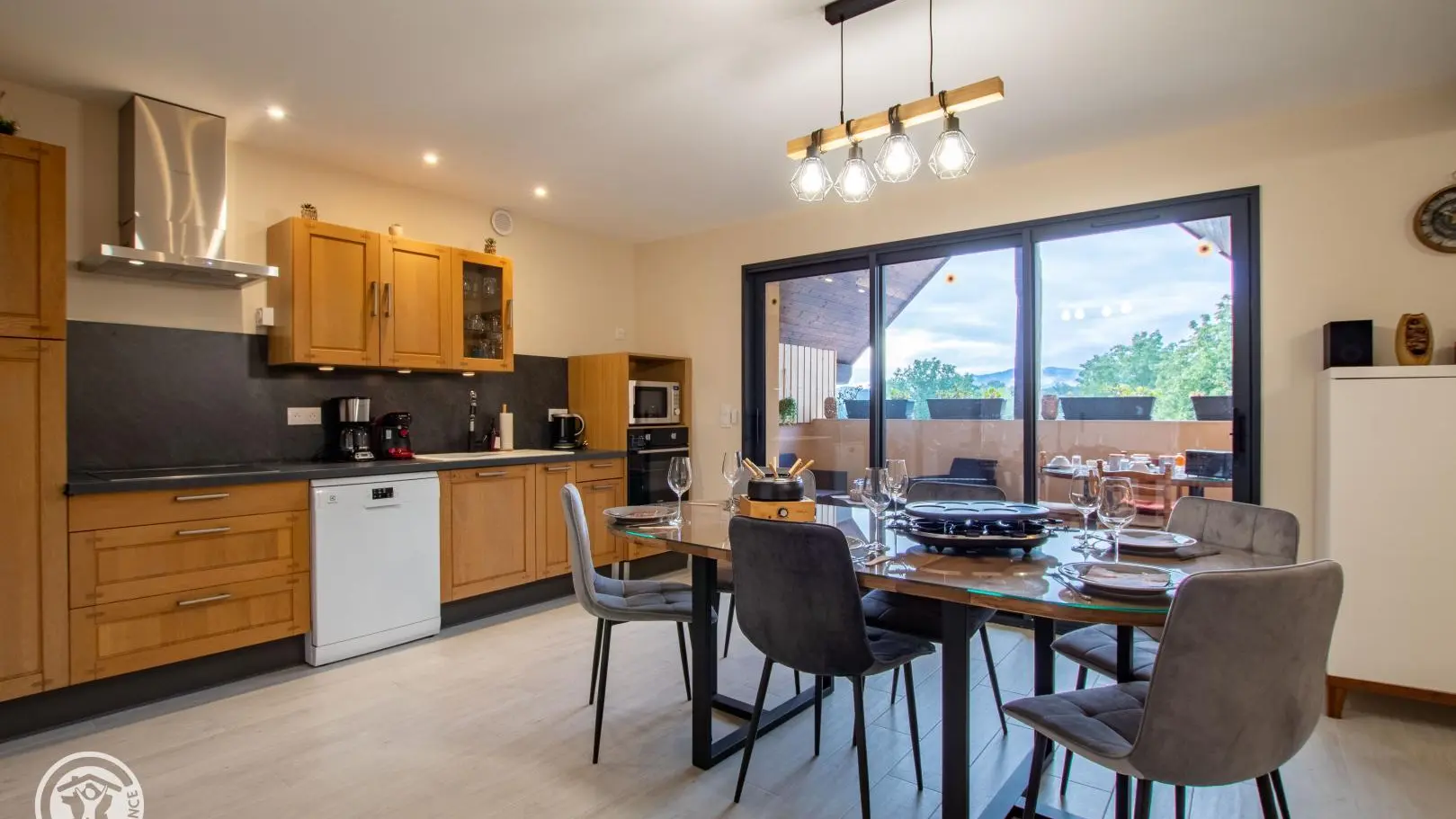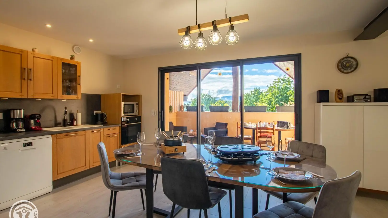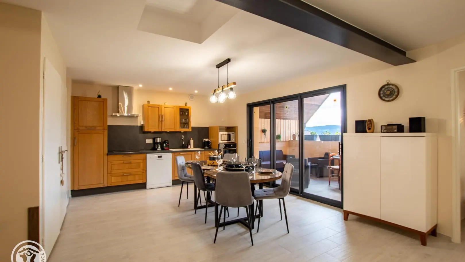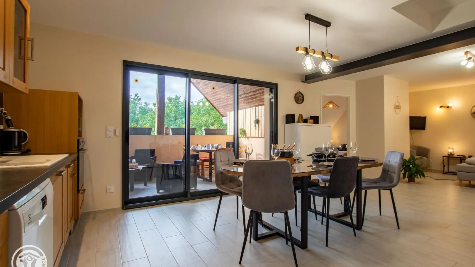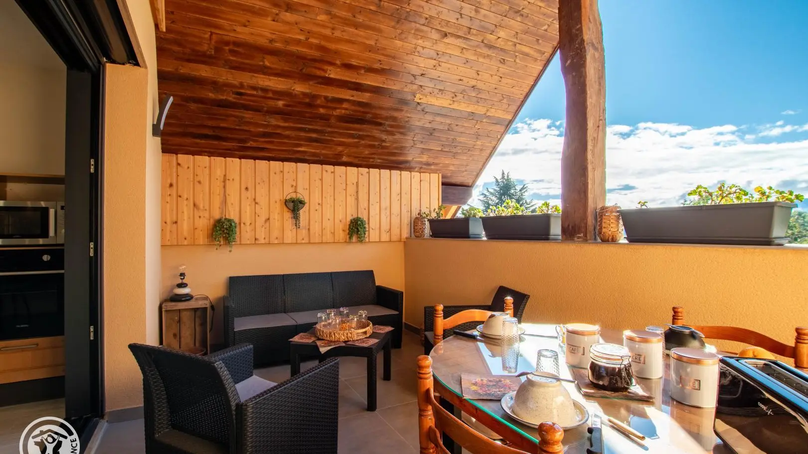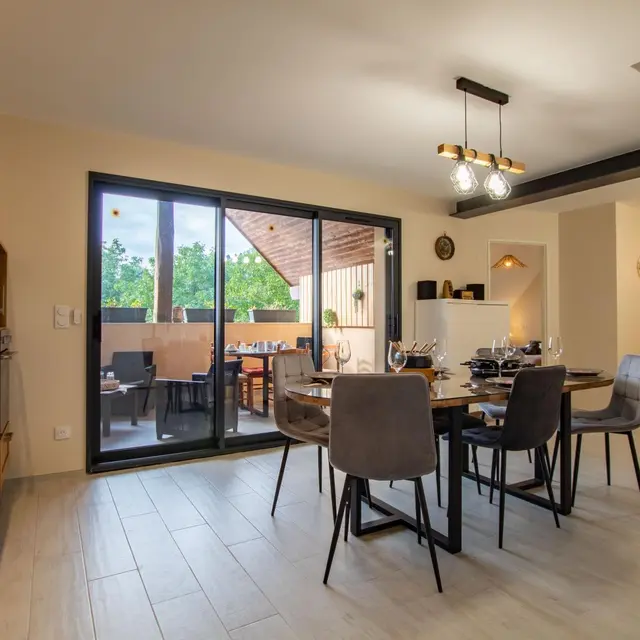 Entrée sur cuisine ouverte avec son espace repas. Accès au balcon avec salon de jardin et table de repas.