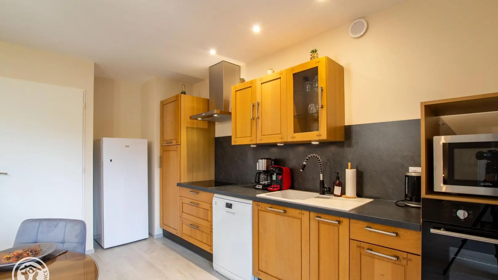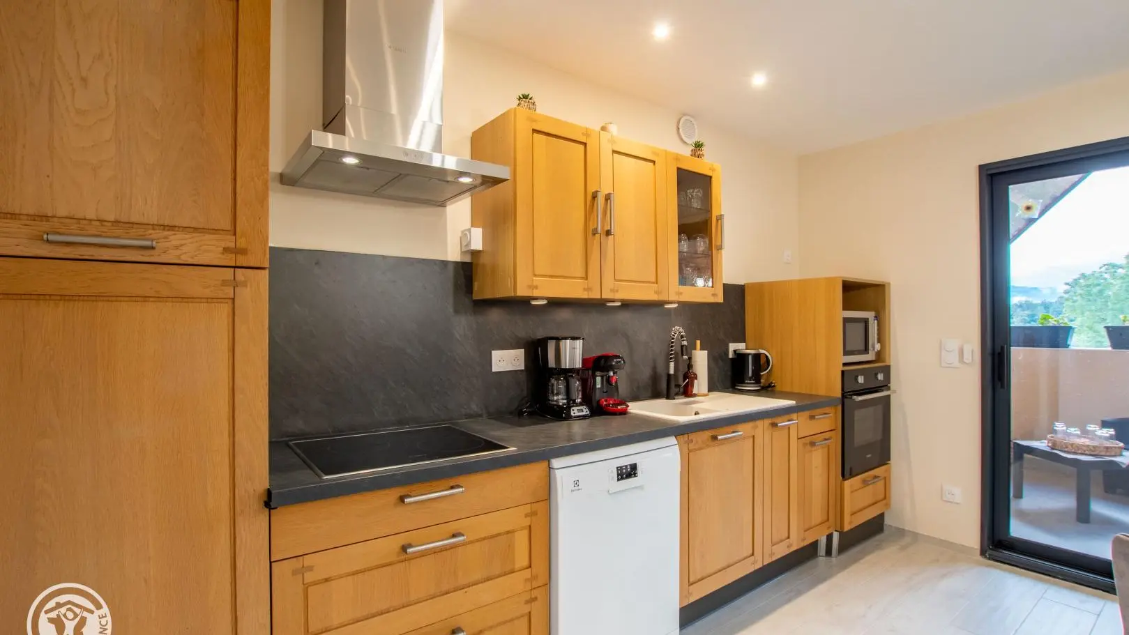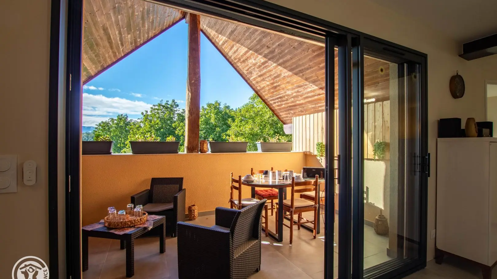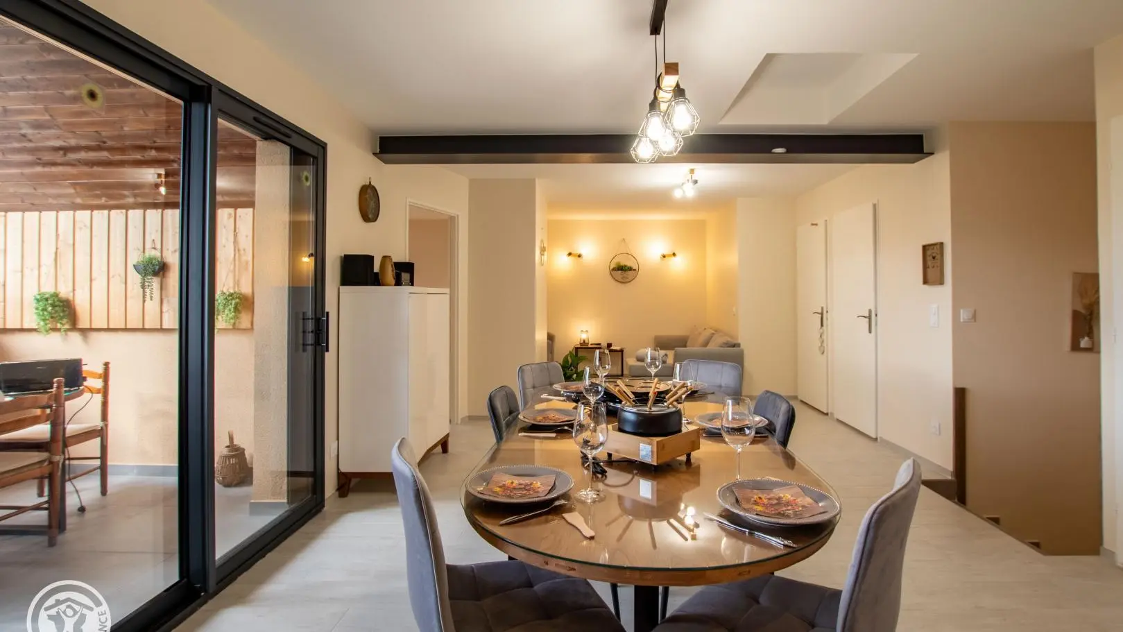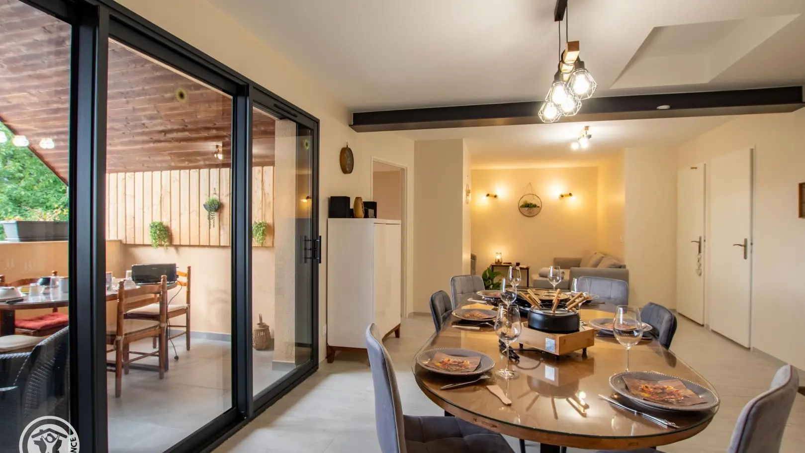 Entrée sur cuisine ouverte avec son espace repas. Accès au balcon avec salon de jardin et table de repas.