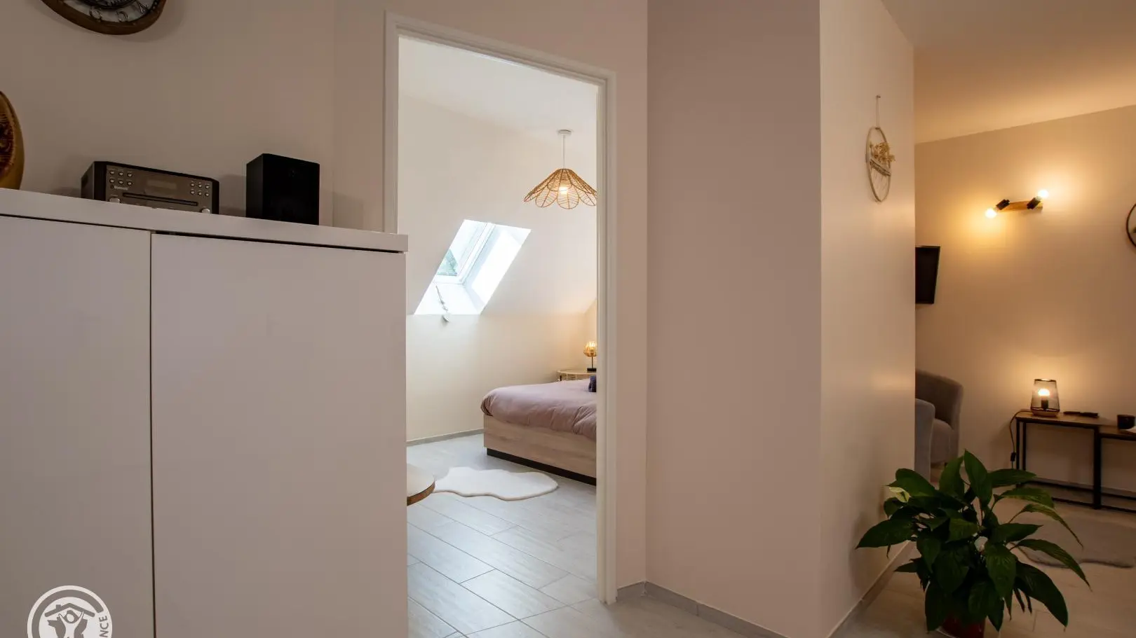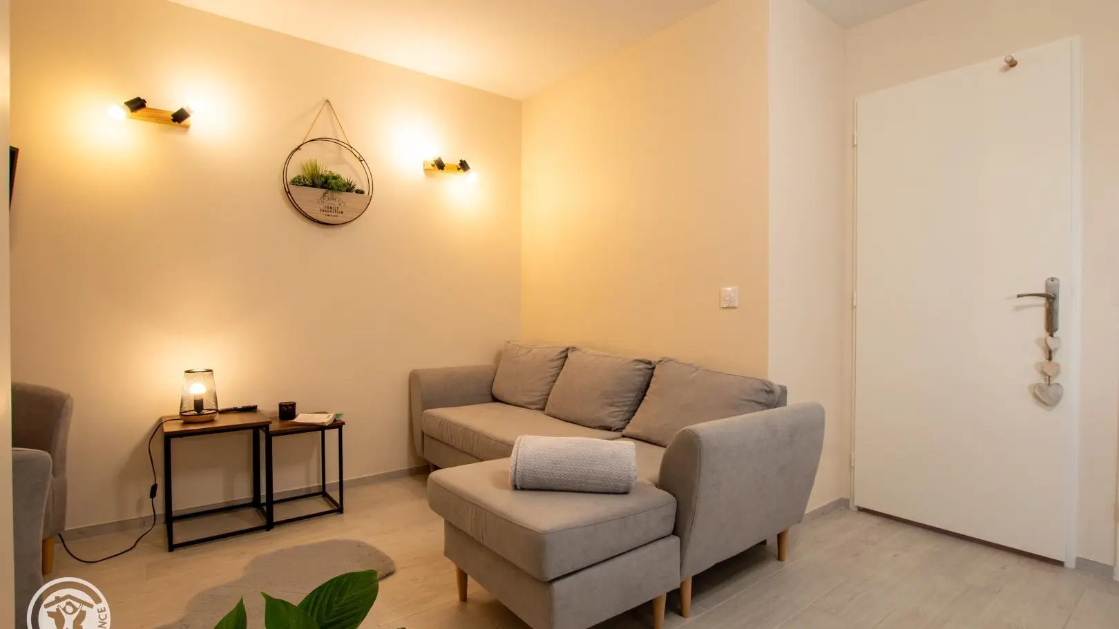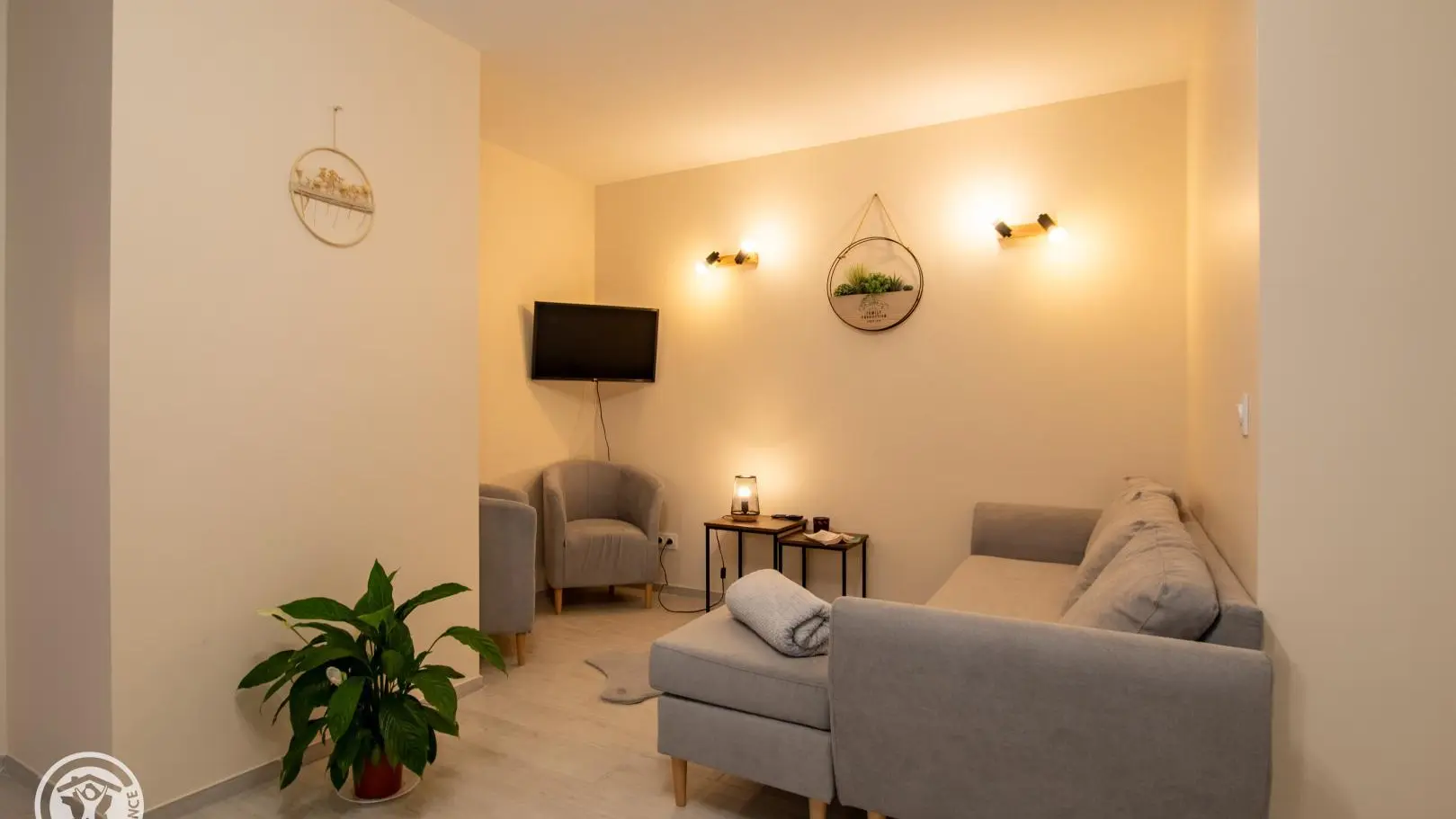 Séjour avec canapé et TV murale.