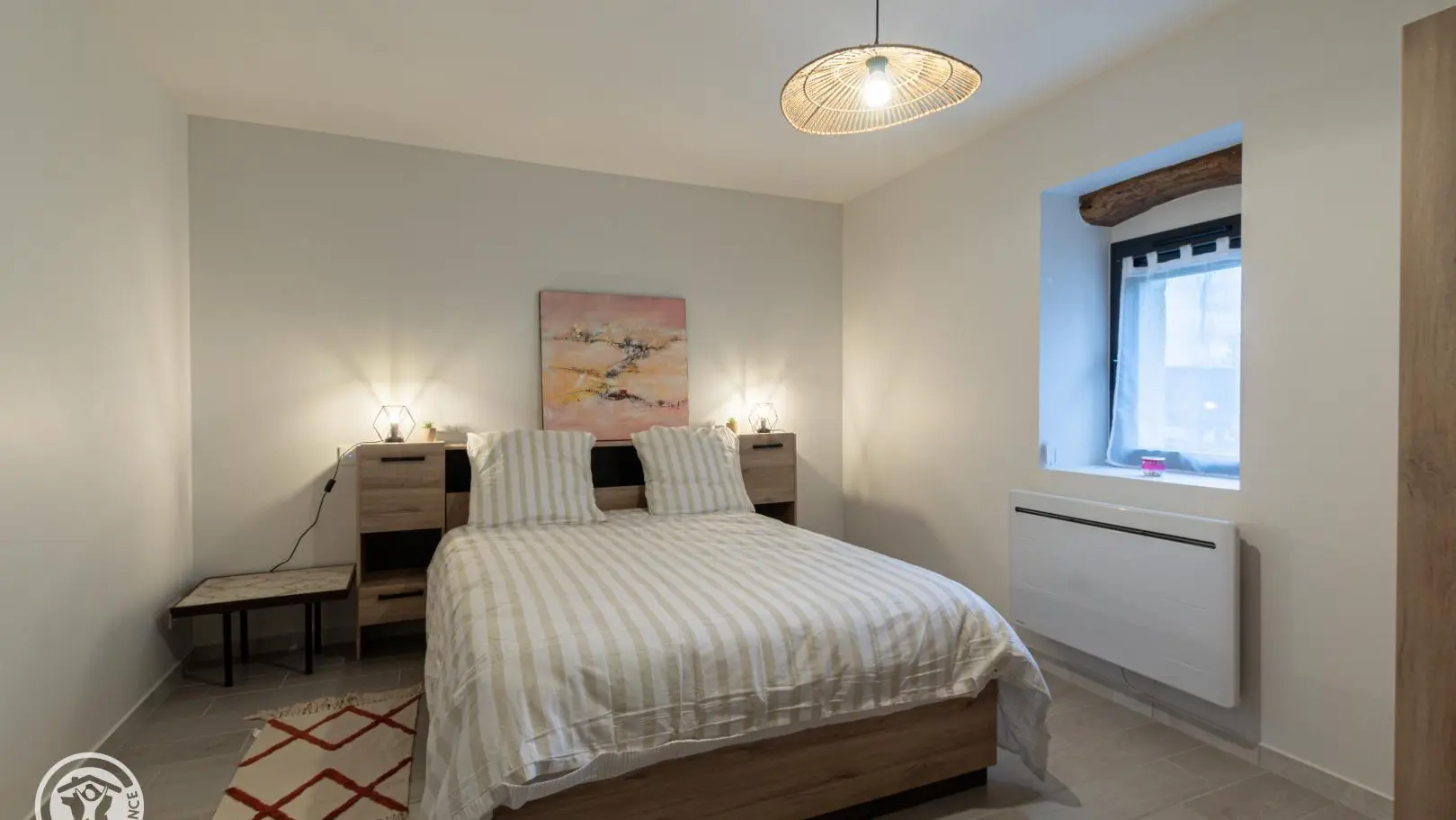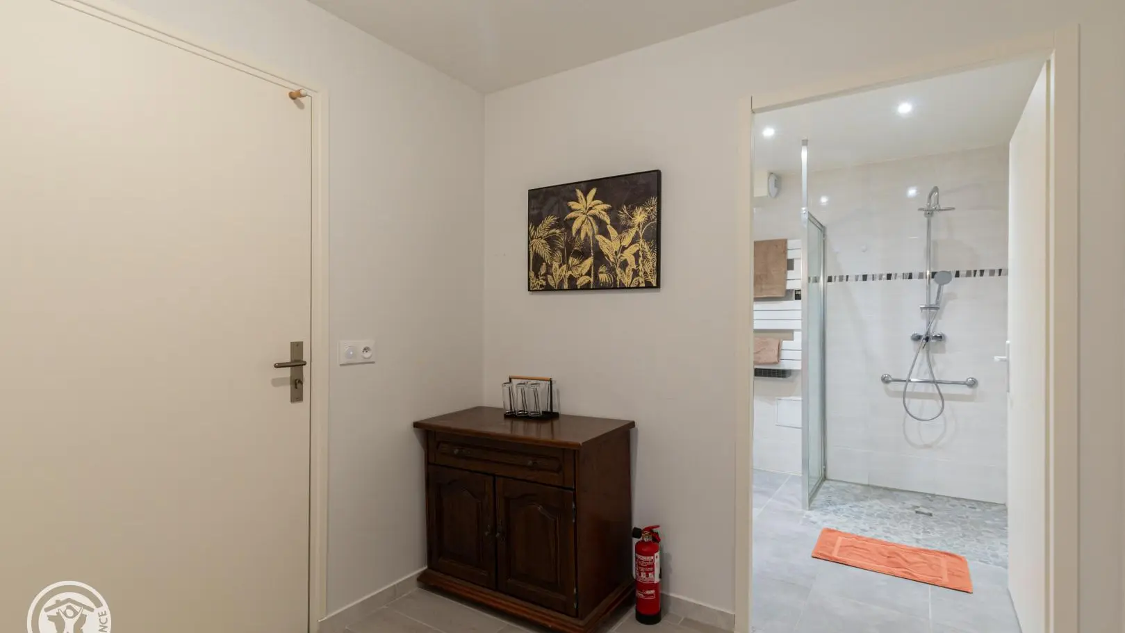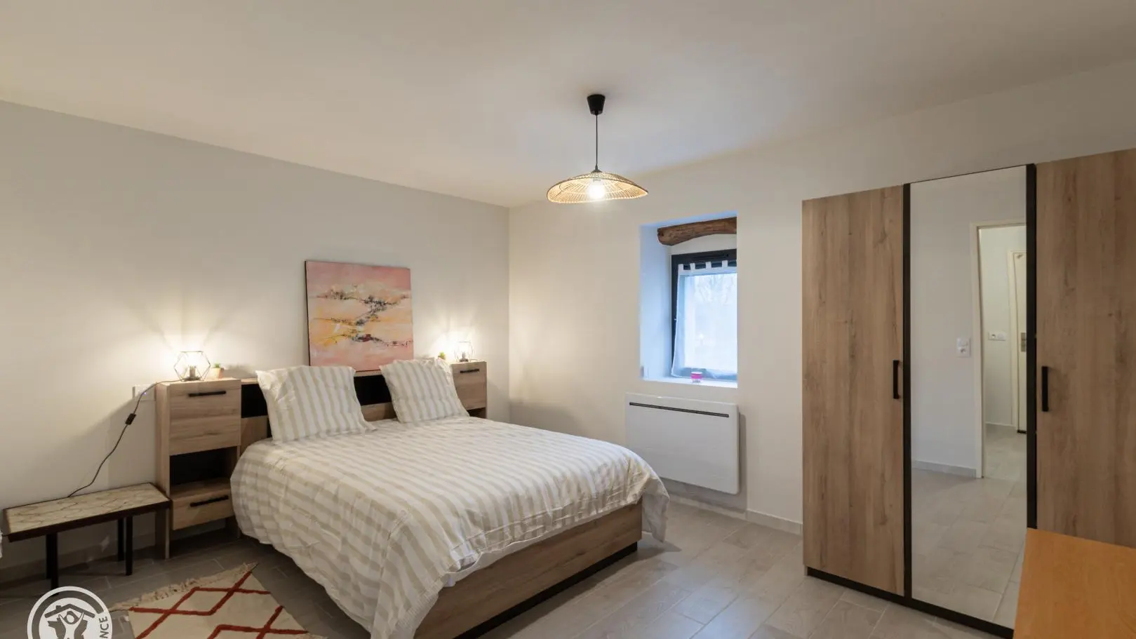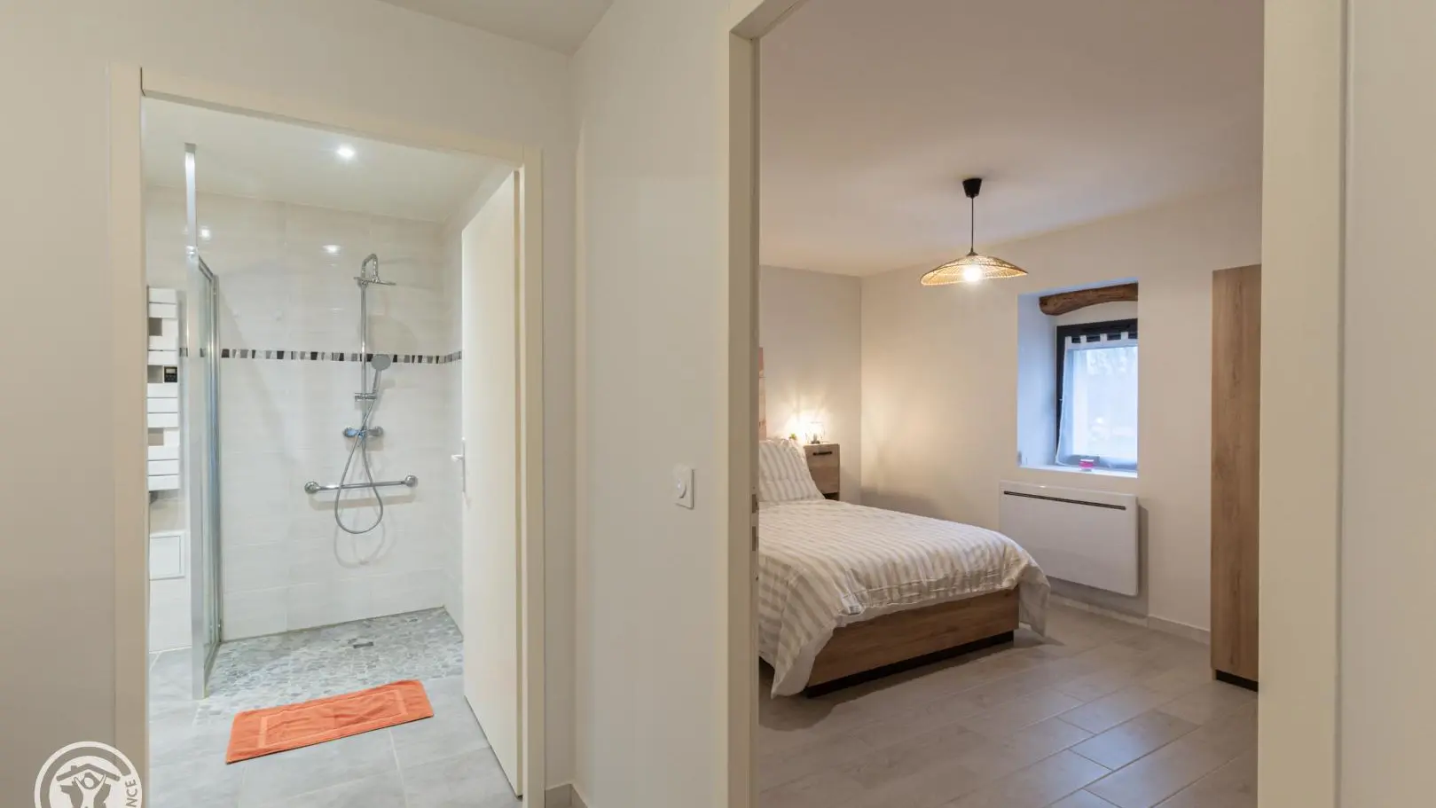 Appartement au rez-de-chaussée d'une grande bâtisse comprenant également un autre gîte à l'étage et un second gîte identique totalement indépendant au 1er étage. Accès par sas commun avec le gîte du 1er étage ou privatif par le garage attenant au gîte.