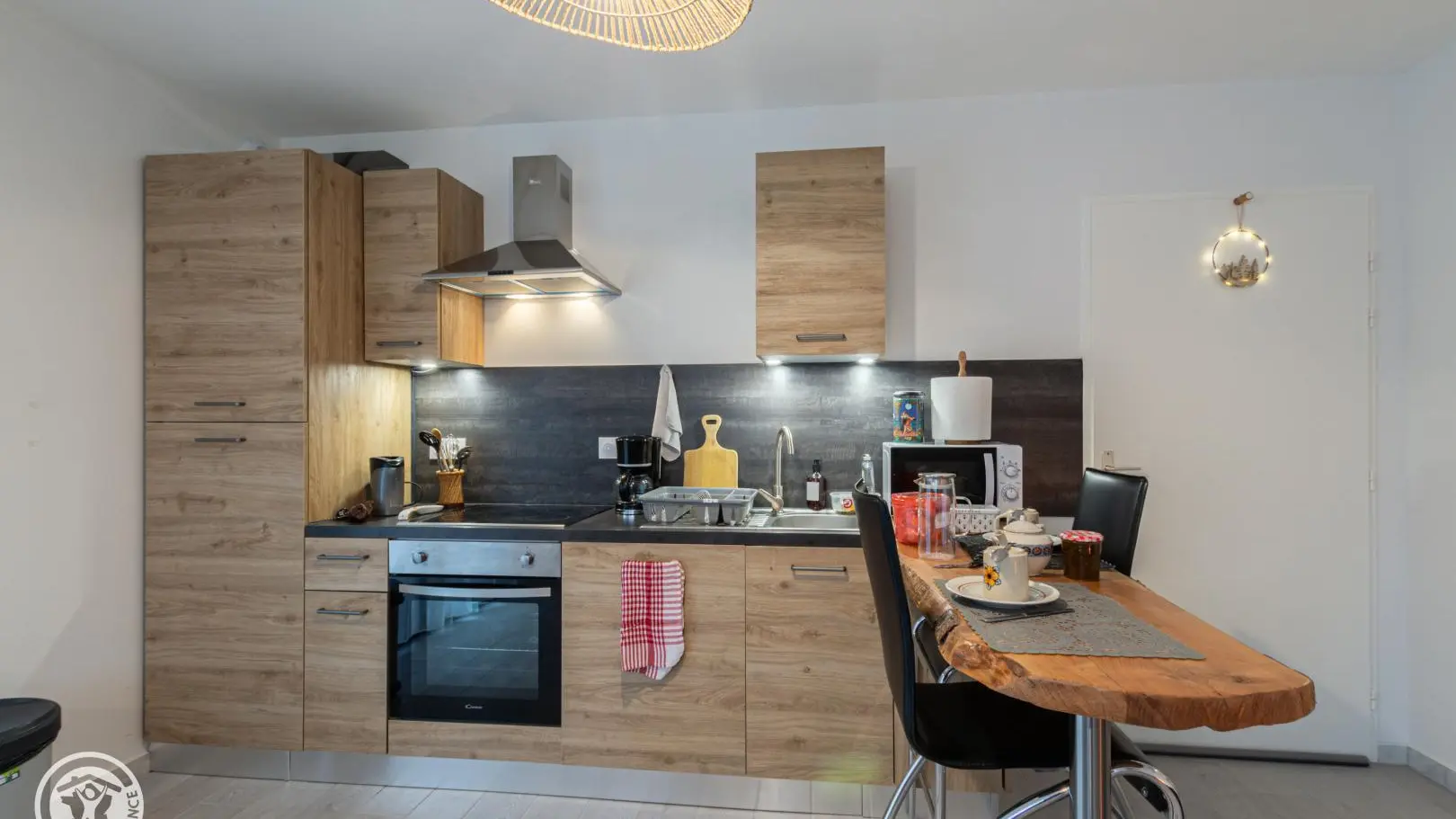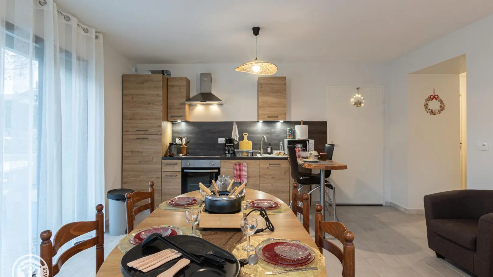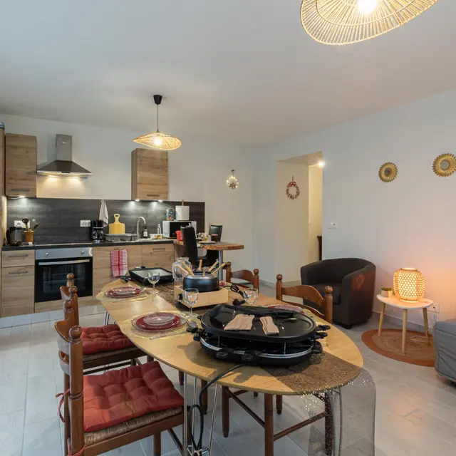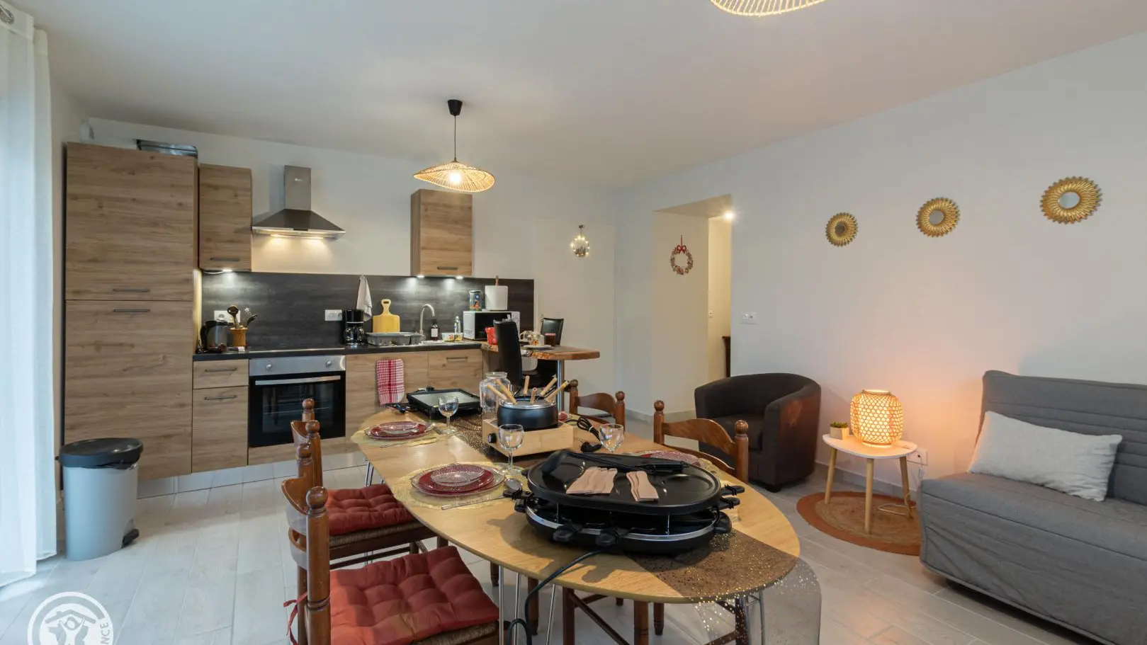 Hall d'entrée donnant accès au séjour comprenant : une cuisine ouverte avec une table haute pour 2 personnes, une table pour 4, un canapé convertible 140x190 cm et un fauteuil. Accès à la terrasse privative avec table extérieure (côté route).