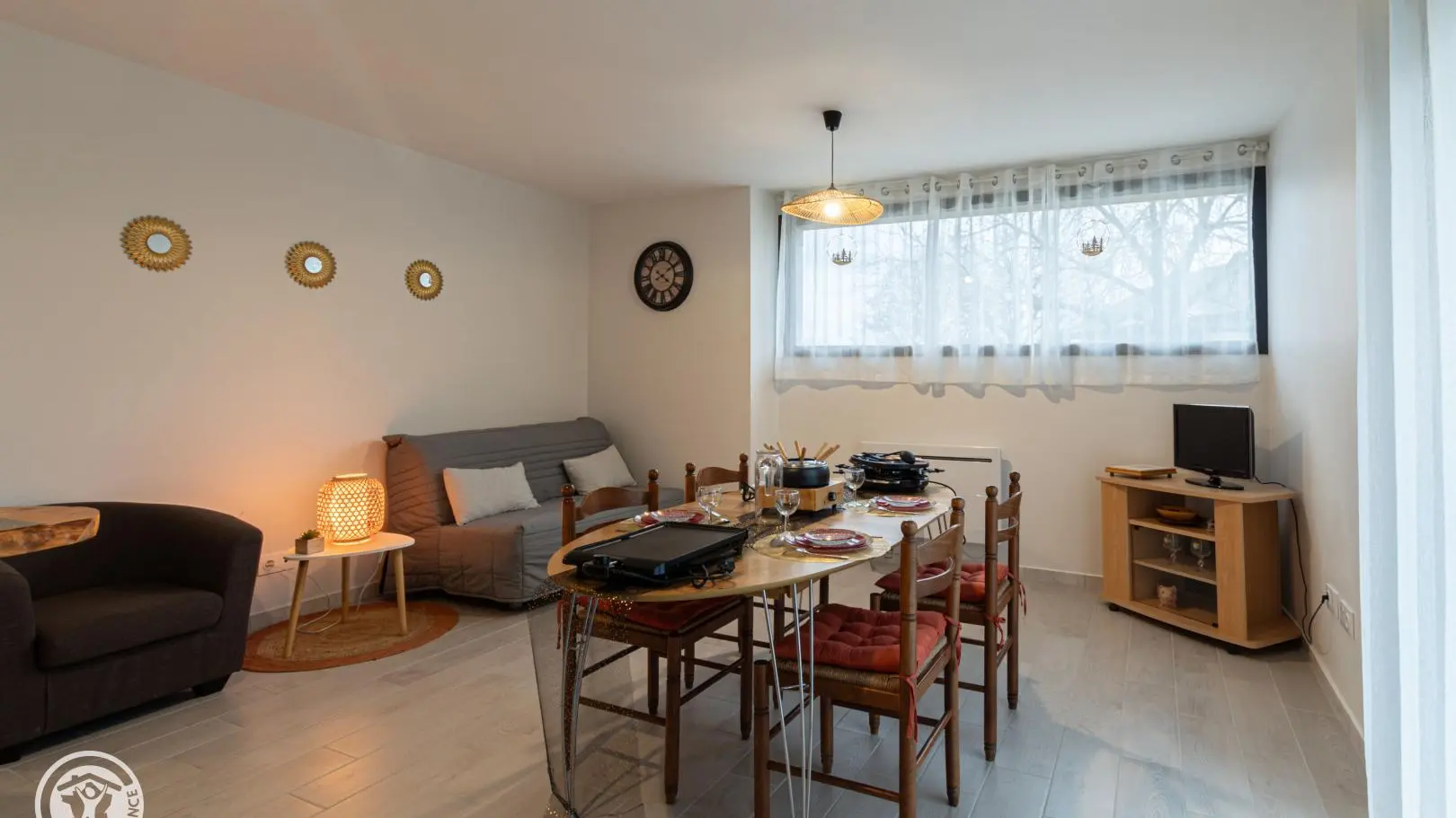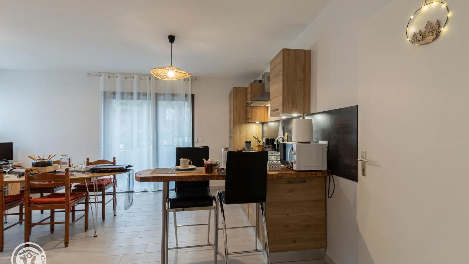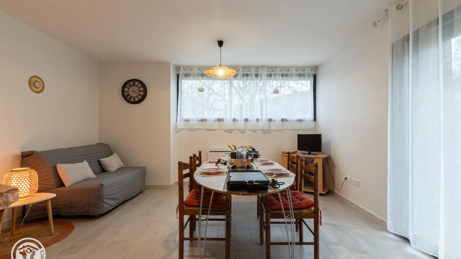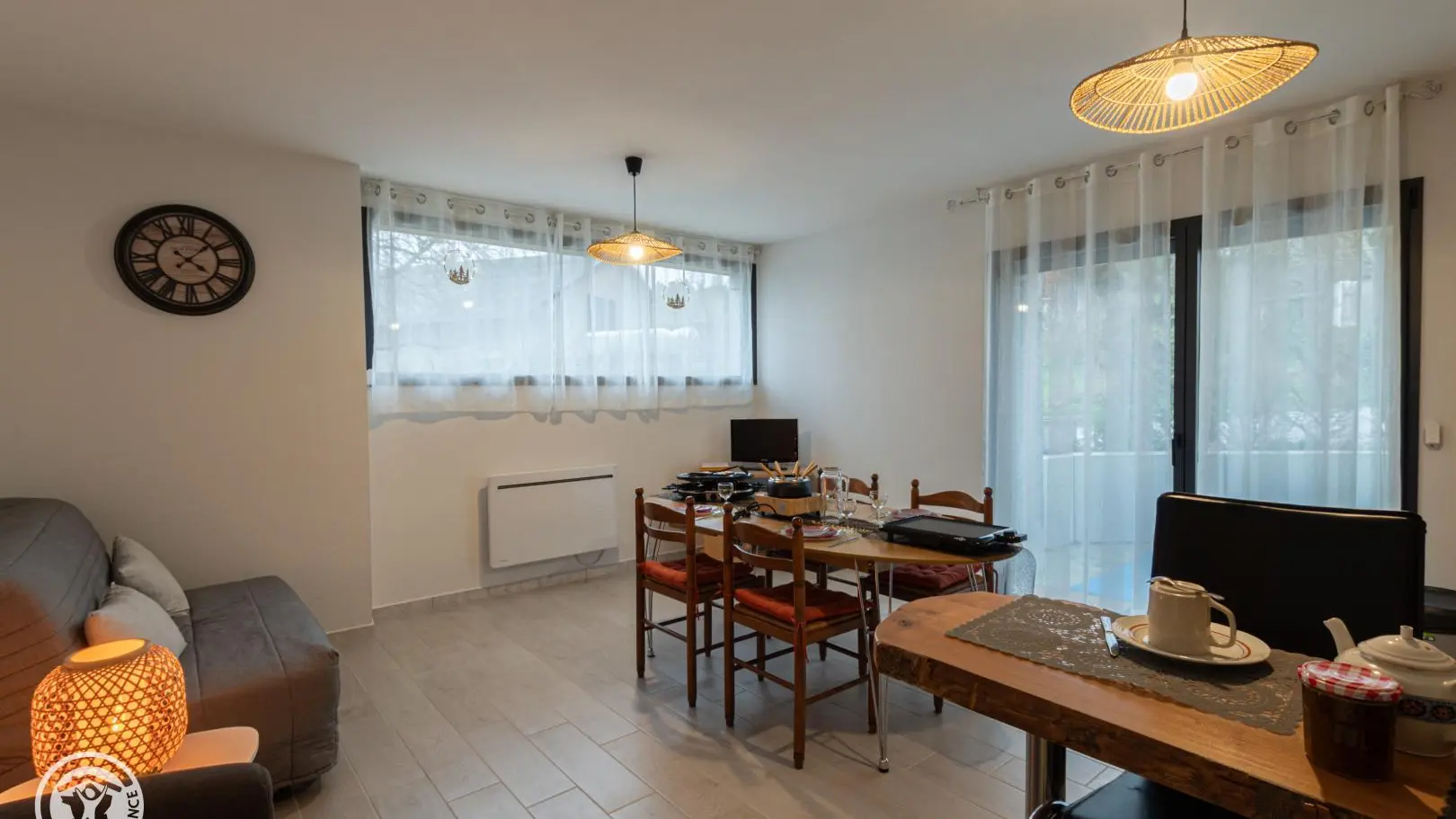 Hall d'entrée donnant accès au séjour comprenant : une cuisine ouverte avec une table haute pour 2 personnes, une table pour 4, un canapé convertible 140x190 cm et un fauteuil. Accès à la terrasse privative avec table extérieure (côté route).
