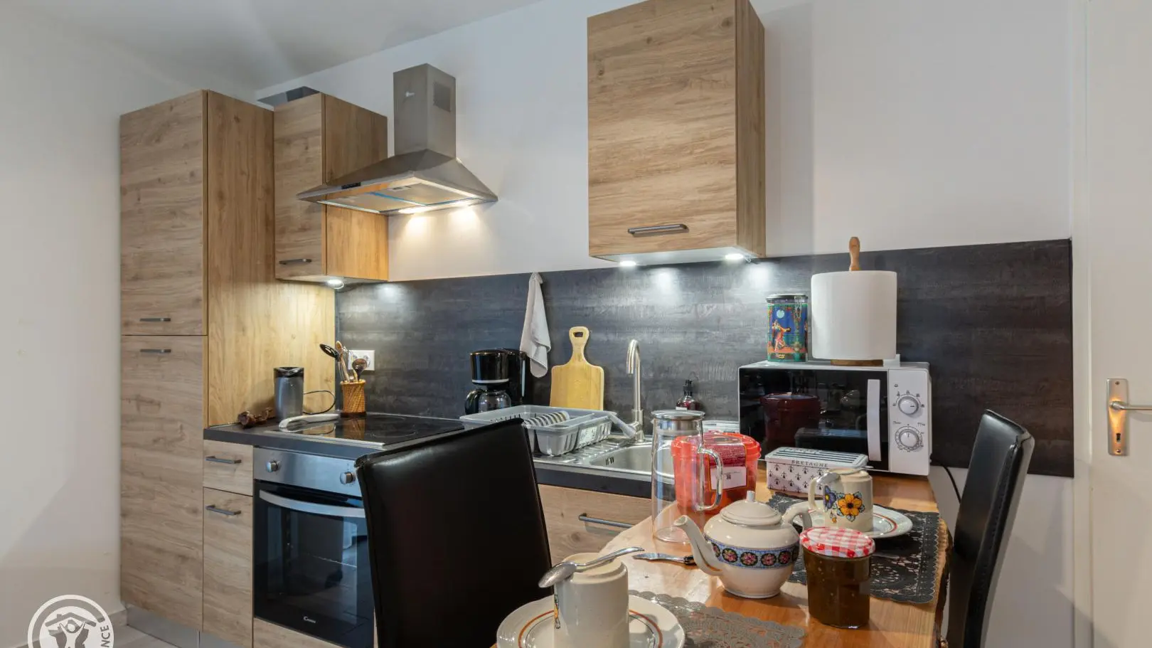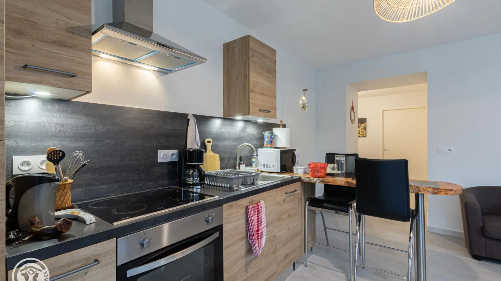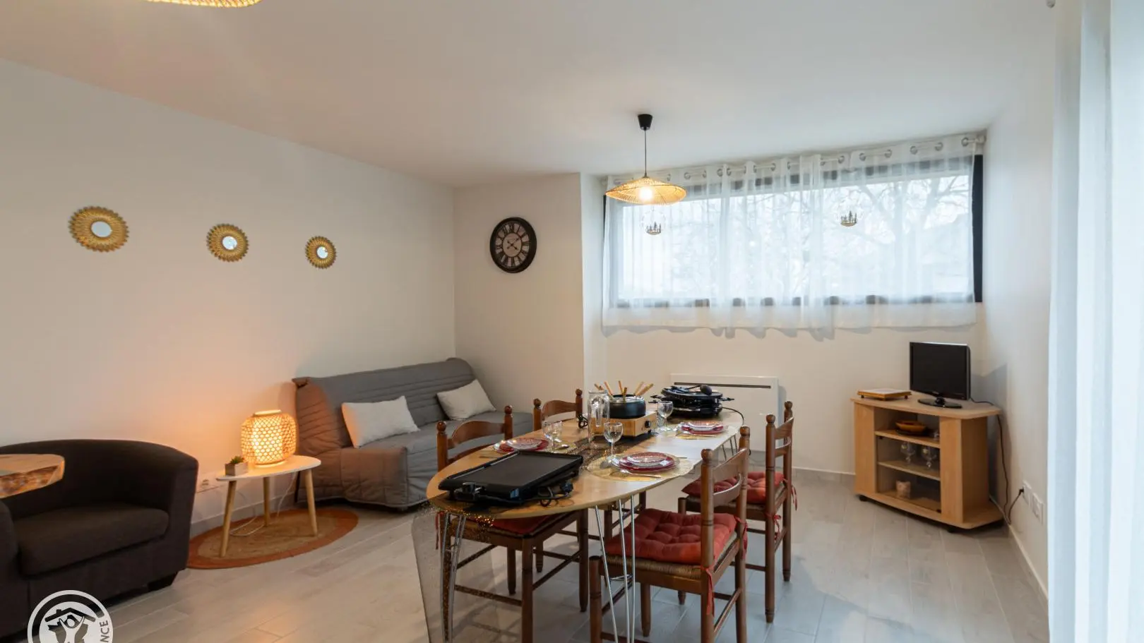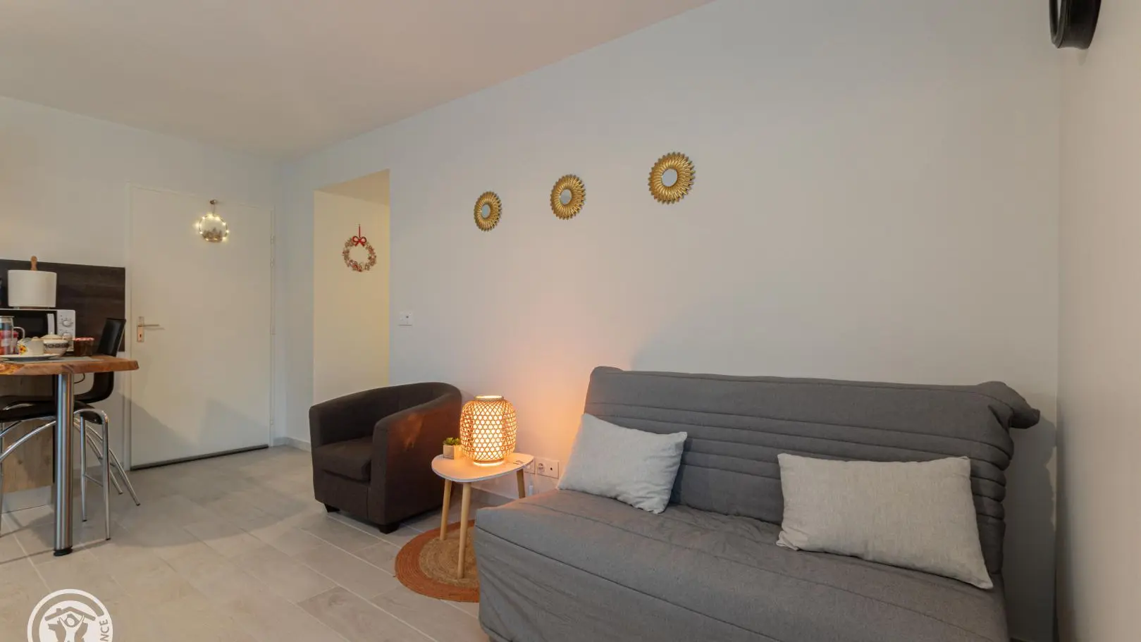 Hall d'entrée donnant accès au séjour comprenant : une cuisine ouverte avec une table haute pour 2 personnes, une table pour 4, un canapé convertible 140x190 cm et un fauteuil. Accès à la terrasse privative avec table extérieure (côté route).