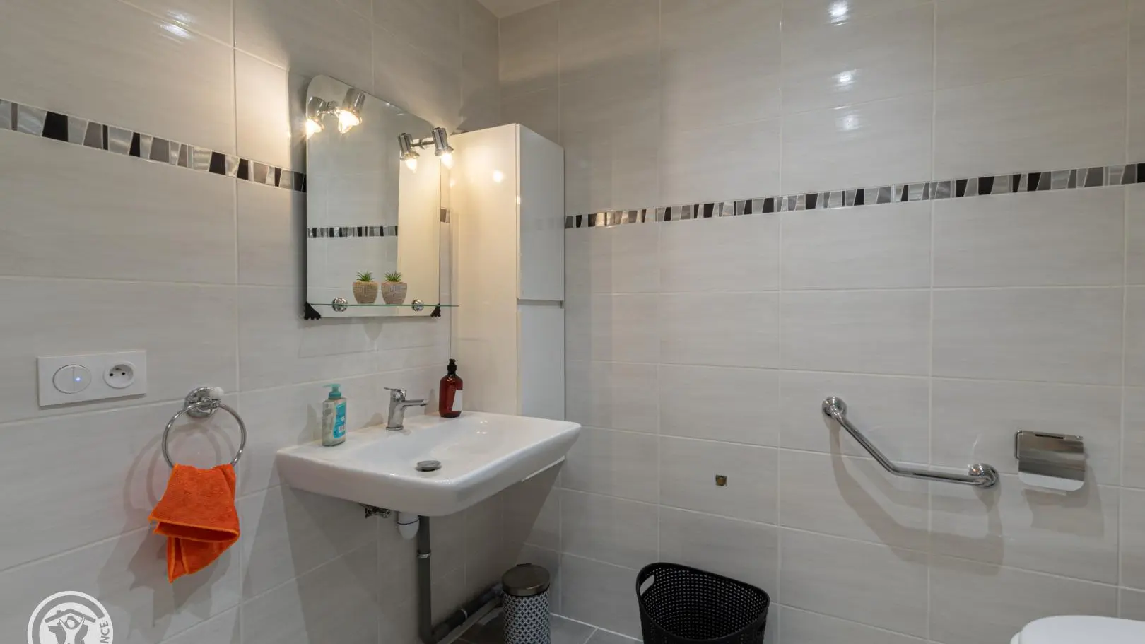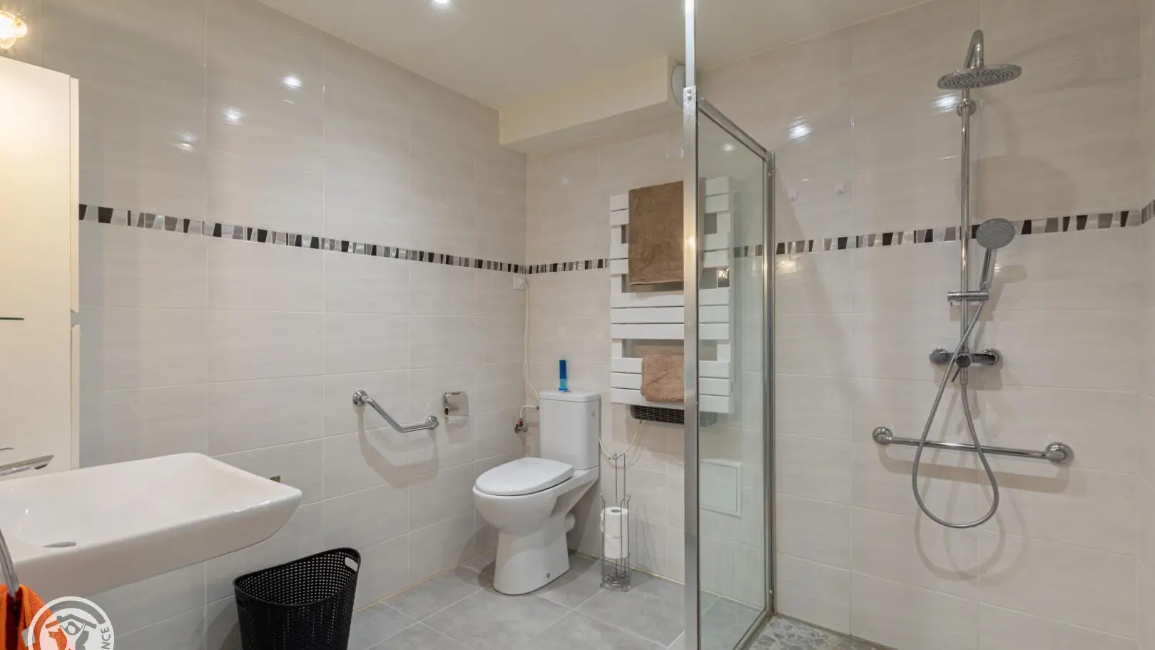 Salle d'eau avec grande douche, vasque et WC facilitant l'accessibilité aux personnes à mobilité réduite.