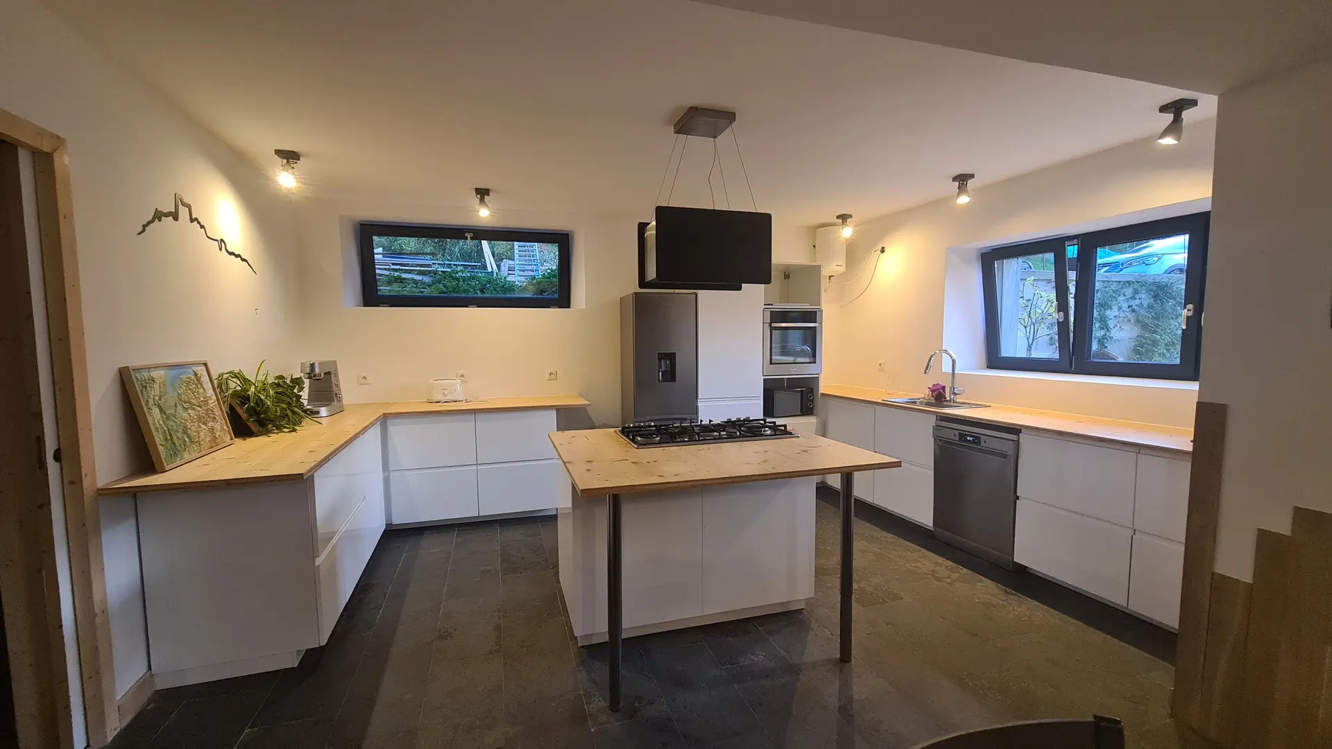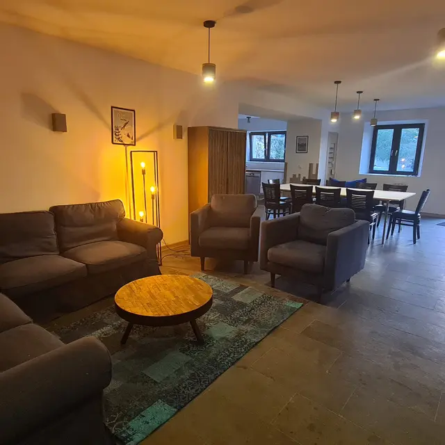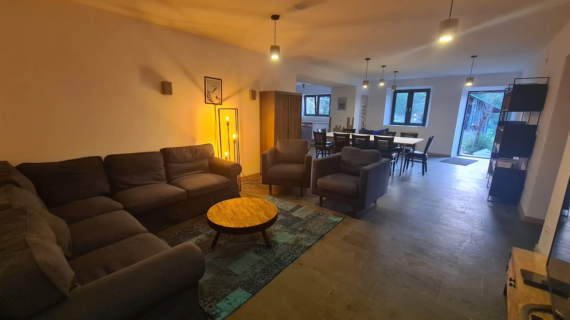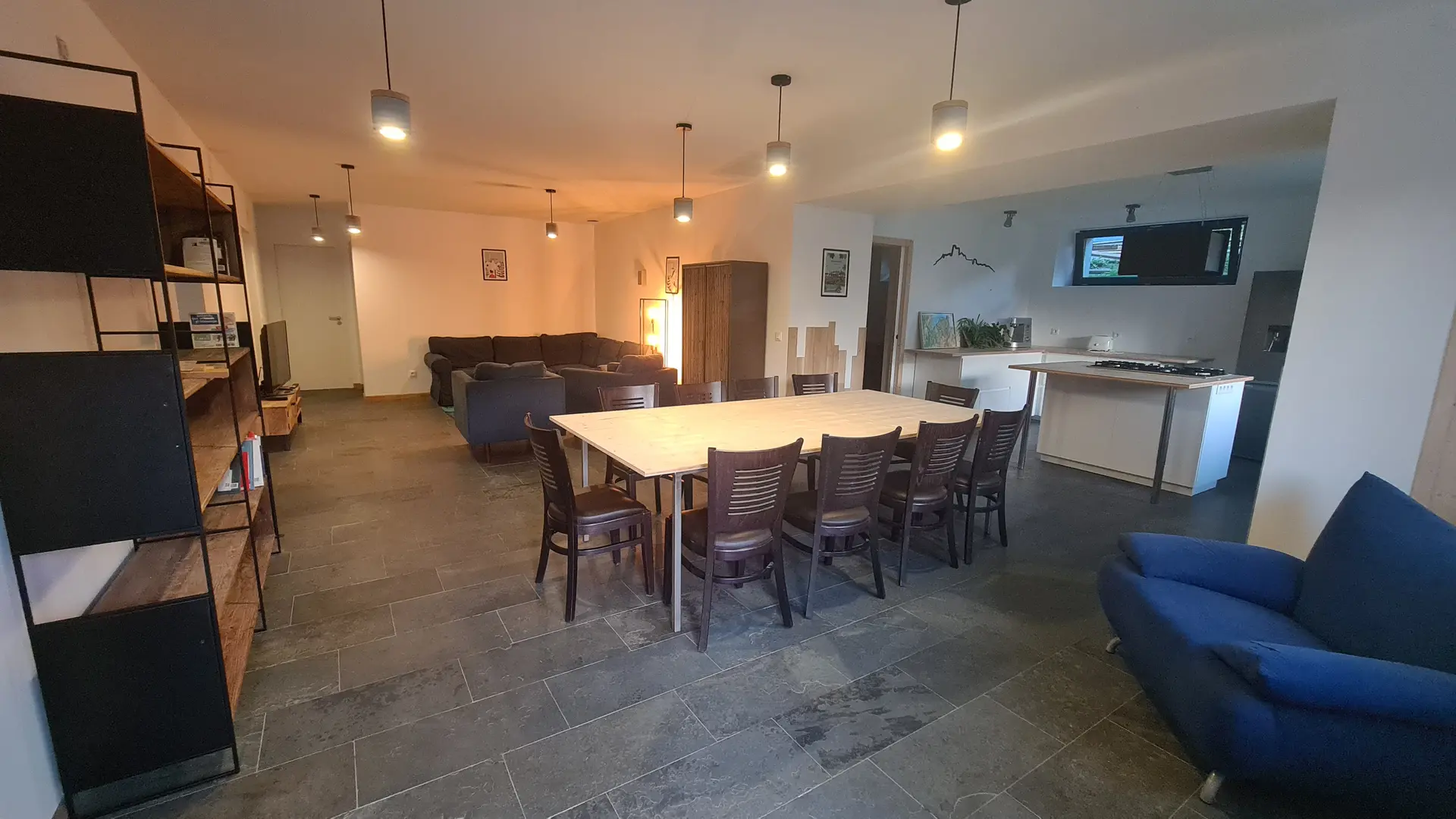 Logement de 145m² pour 10 personnes, grande pièce de vie ouverte sur une belle cuisine.