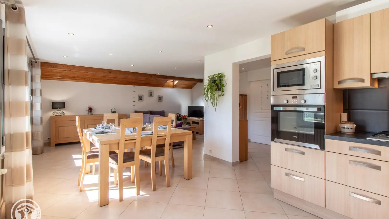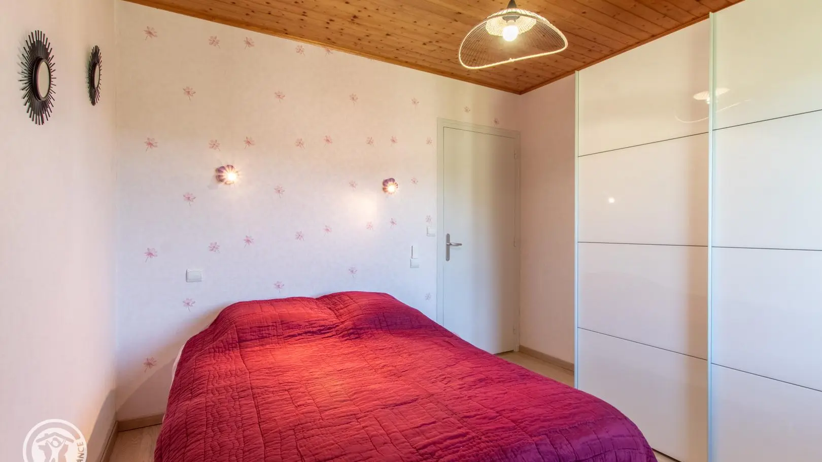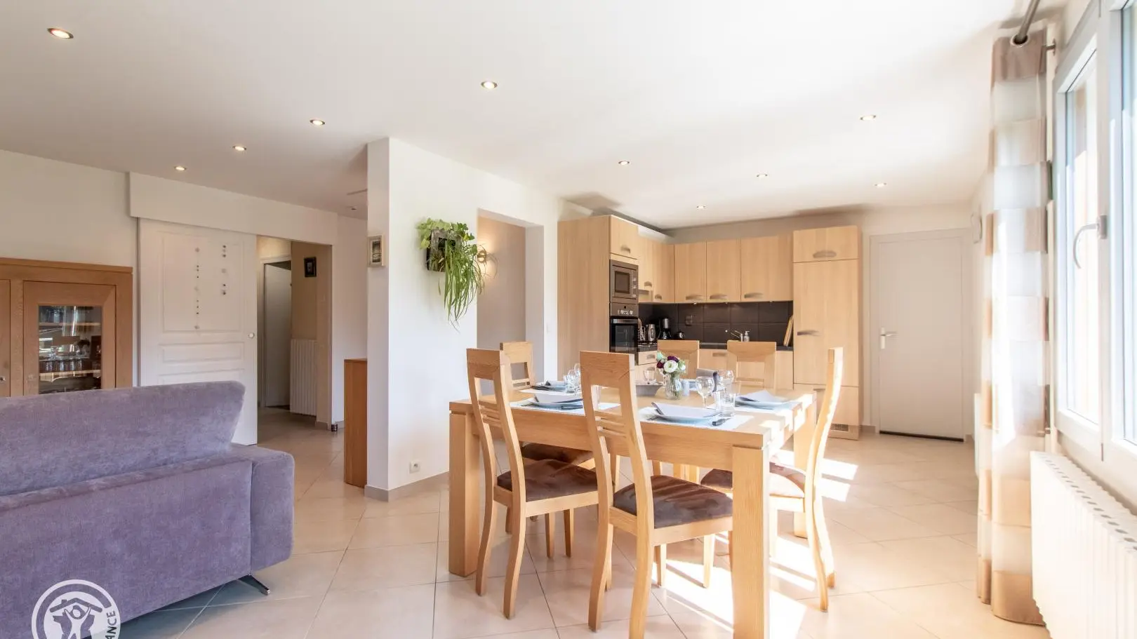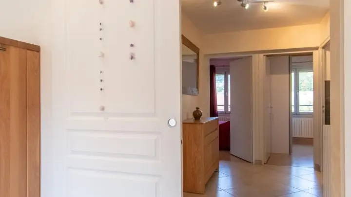 Gîte de 89 m² aménagé au 2ème étage d'une maison comprenant également le logement des propriétaires. Accès par escalier extérieur et intérieur (montée commune). Hall d'entrée avec ouverture sur pièce de vie comprenant une cuisine intégrée ouverte sur séjour (table jusqu'à 6 personnes) et un espace salon (canapé, TV). Cellier. Espace nuit et salles d'eau séparées du séjour par le hall et une porte coulissante. Chambre 1 (1 lit 140x190, dressing), chambre 2 (1 lit 140x190, dressing), chambre 3 (1 canapé convertible, rangements). Salle d'eau avec douche à l'italienne, vaste plan de toilette et nombreux rangements. WC indépendant. Lave-linge. Moustiquaires intégrées aux fenêtres. Accès espace extérieur sur le terrain autour de la maison. Grand espace jardin avec plancha, parasol, table de pique-nique en bois, chaises transat et bains de soleil Lafuma.