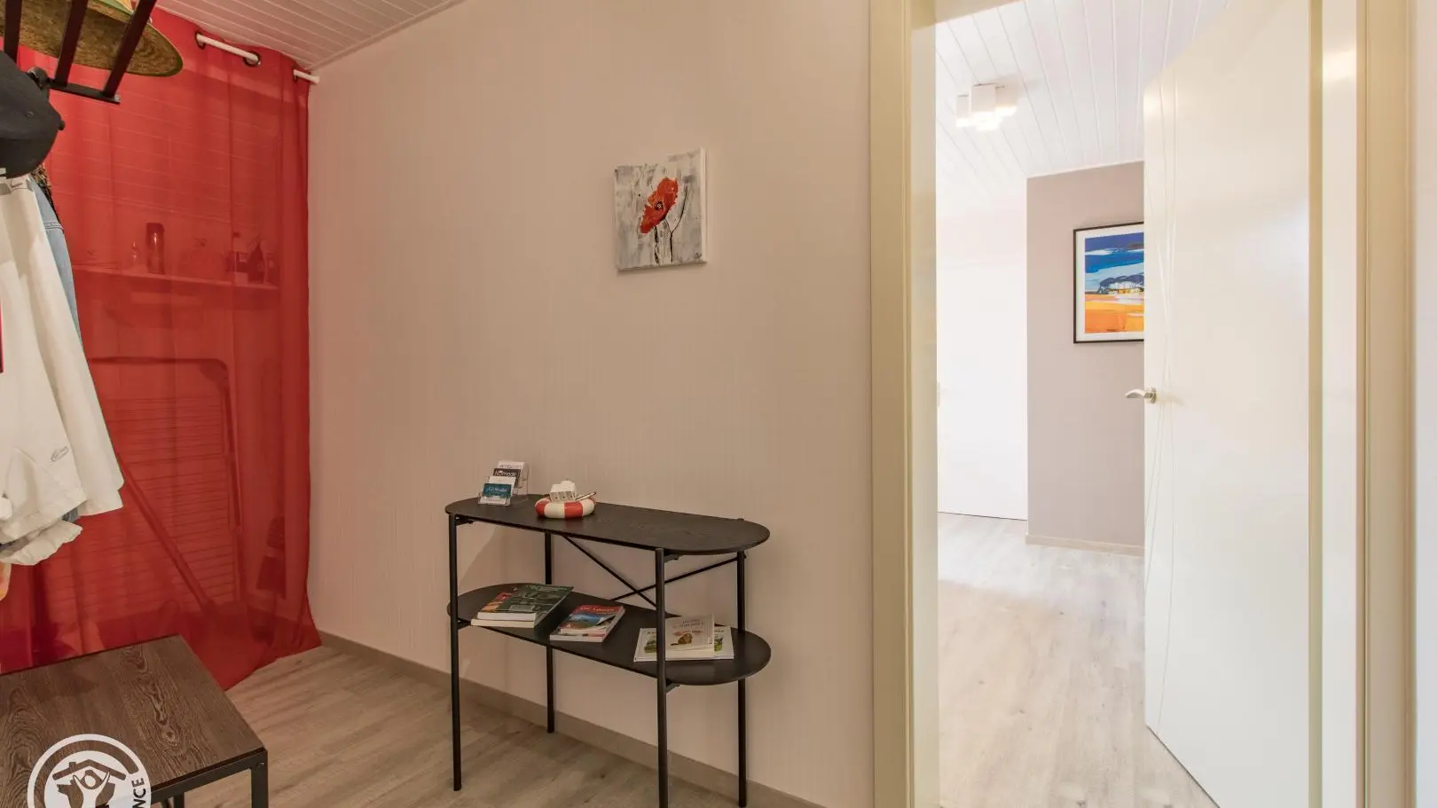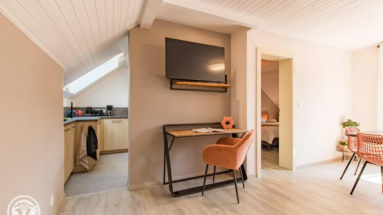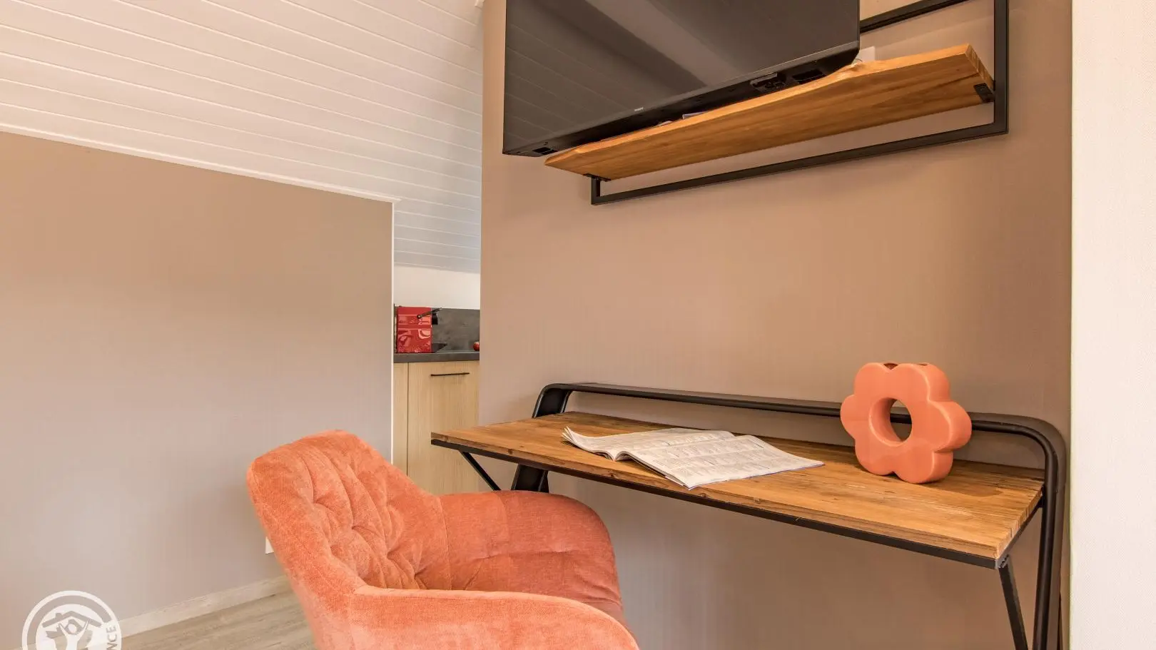 - Cuisine toute équipée partiellement ouverte sur le séjour : table repas, canapé électrique, télévision, bureau, accès à un première terrasse 'tropézienne'.
