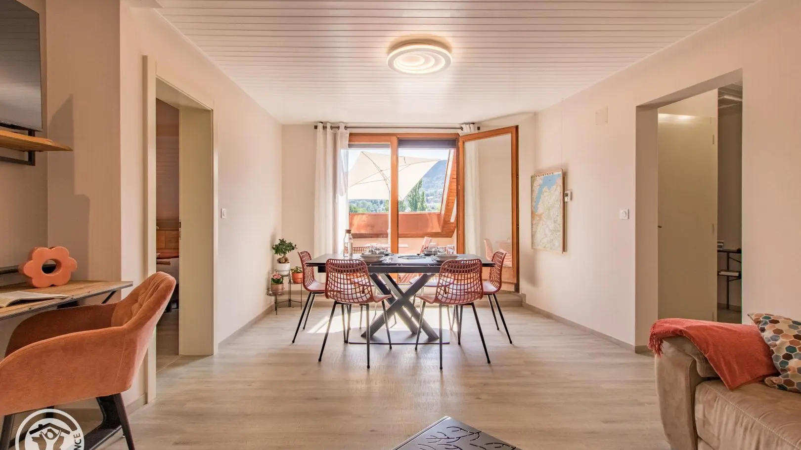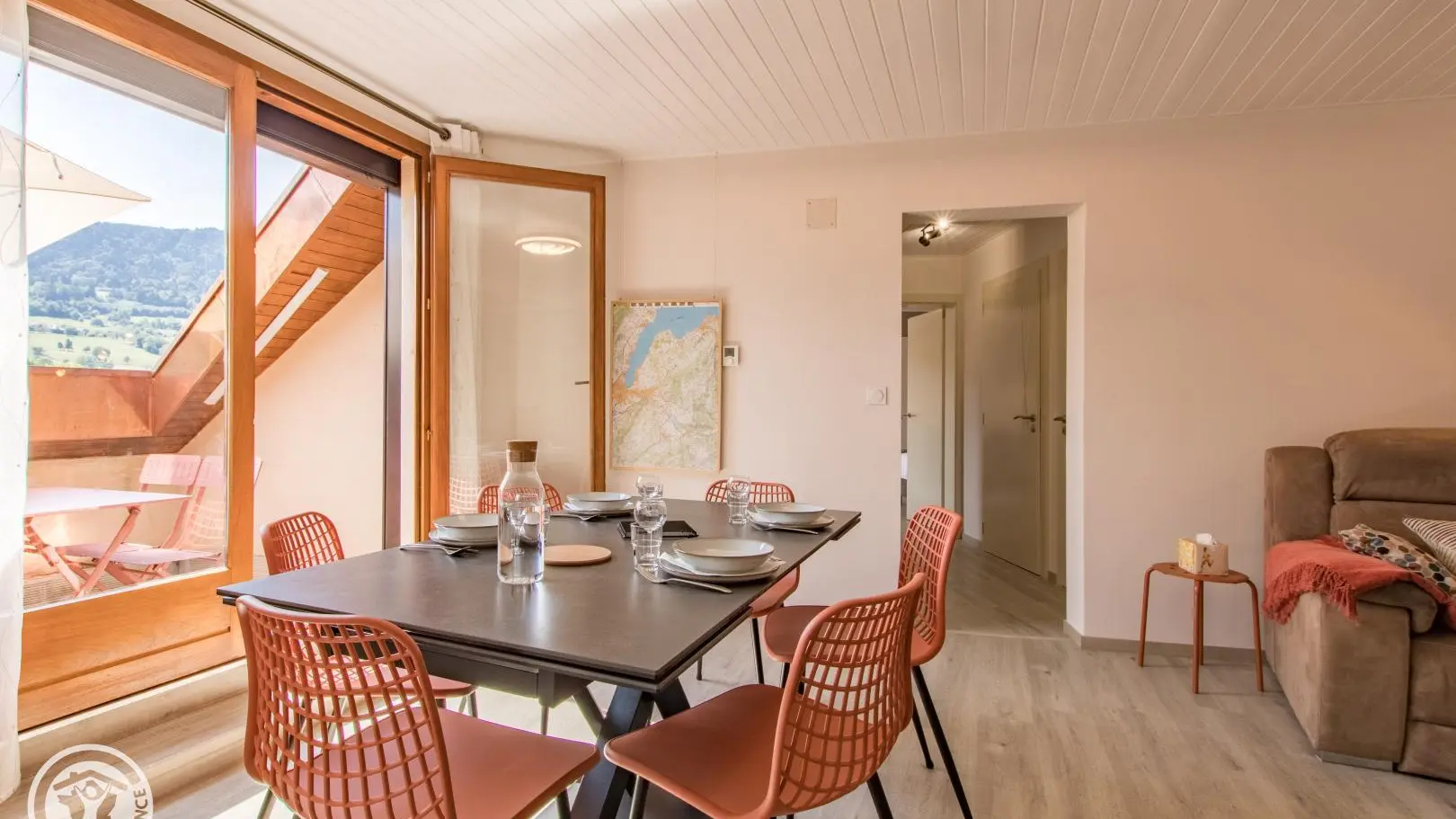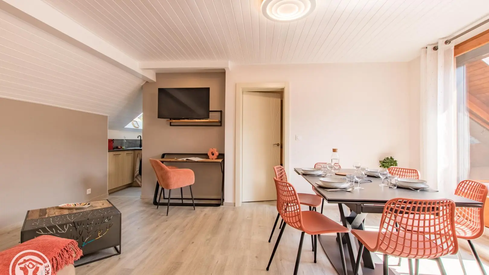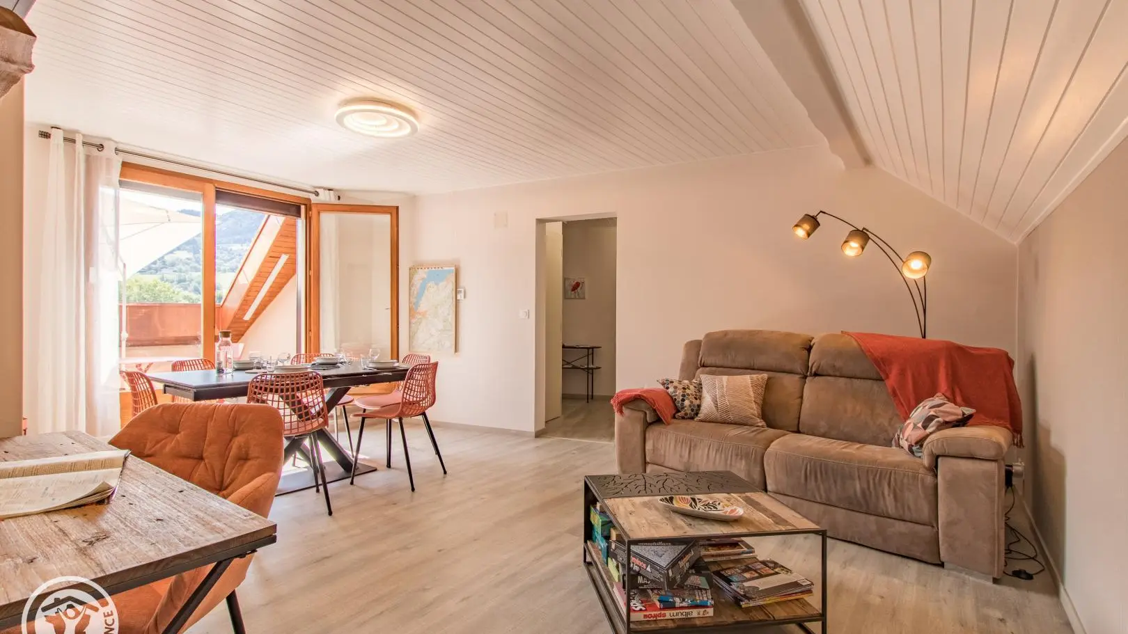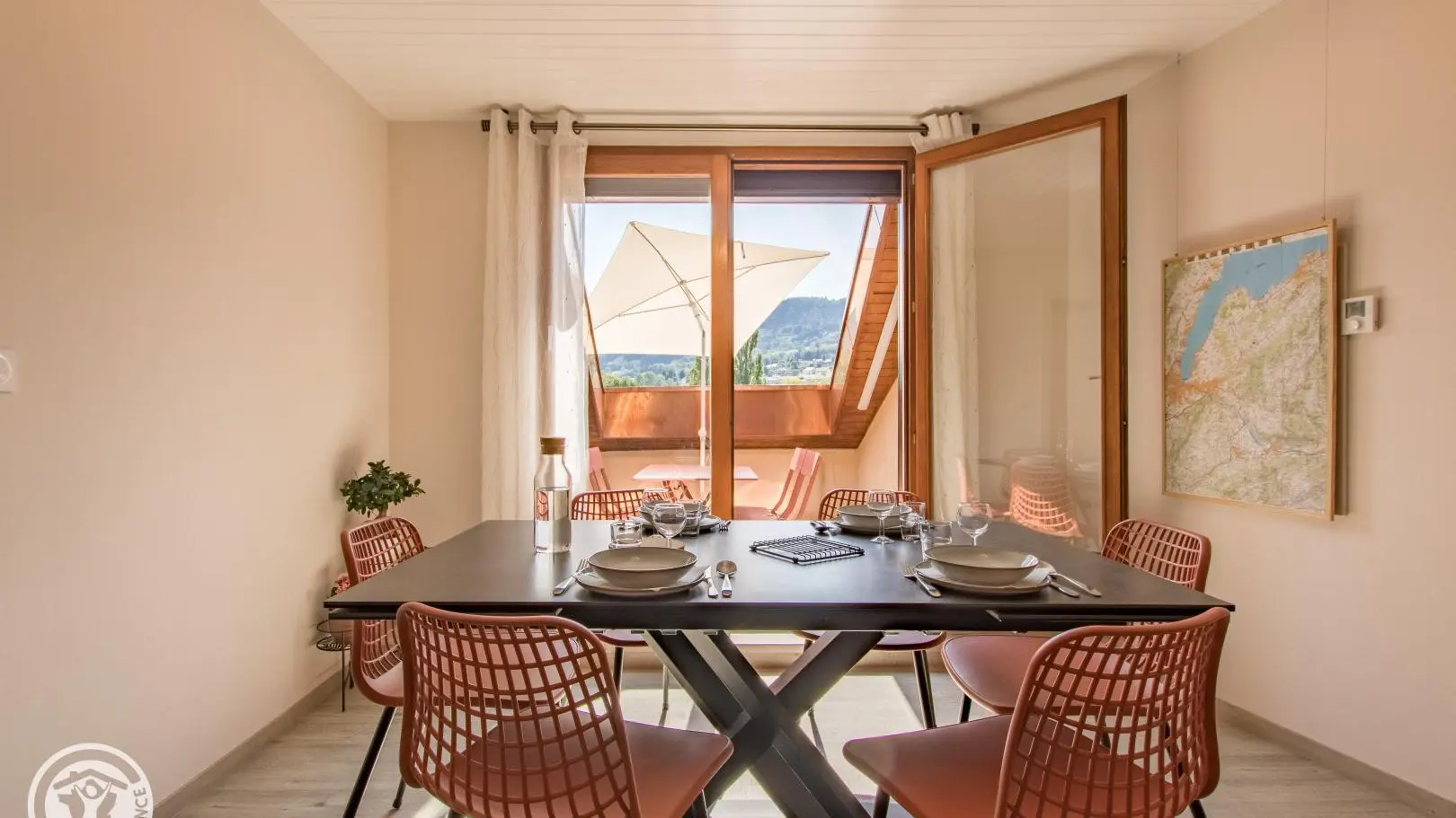 Dans une belle maison située au coeur du Chablais, gîte de 68m² (+8m² mansardés) aménagé au 1er étage. La grande maison comprend également le logement des propriétaires et une location à l'année.