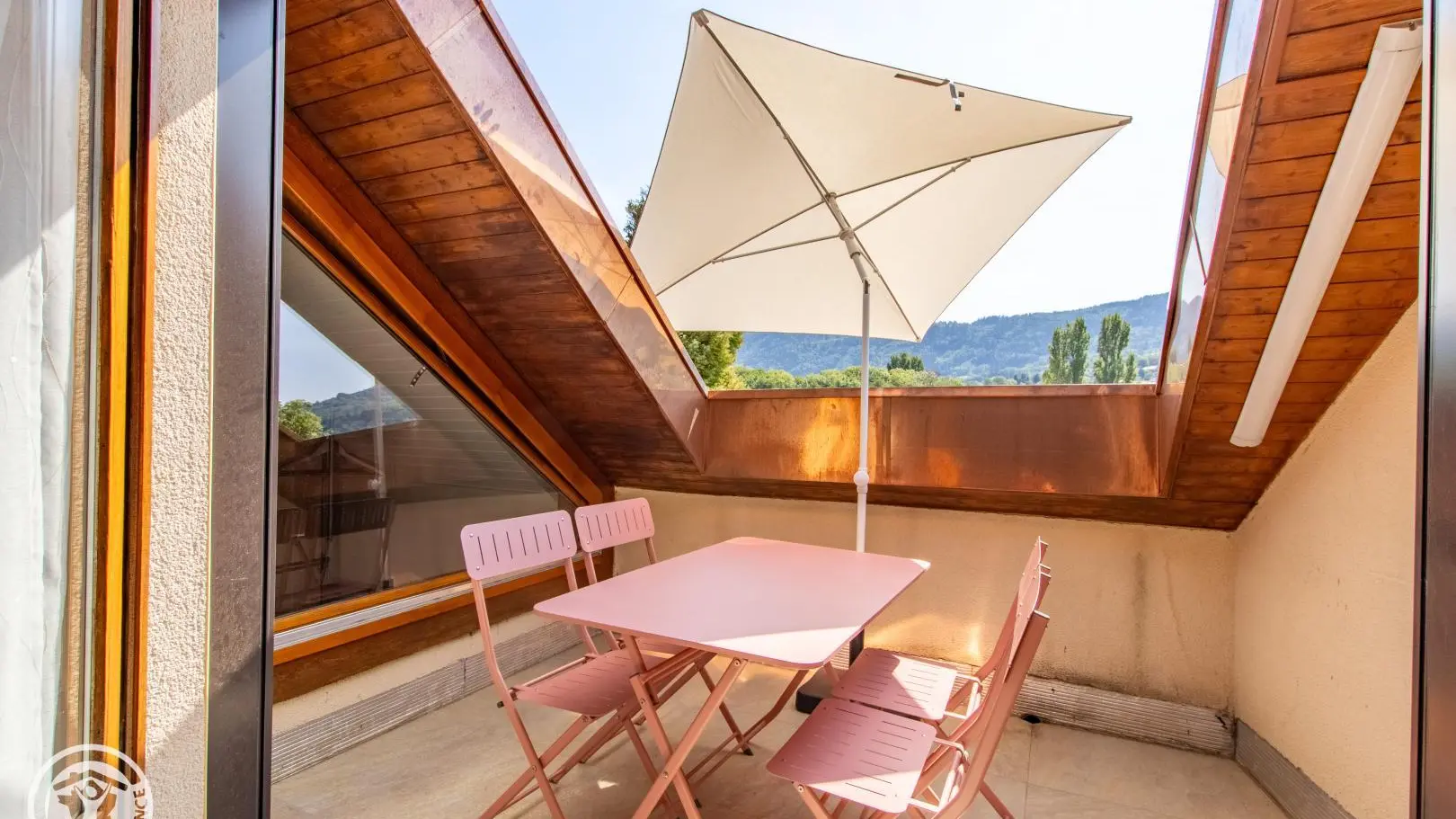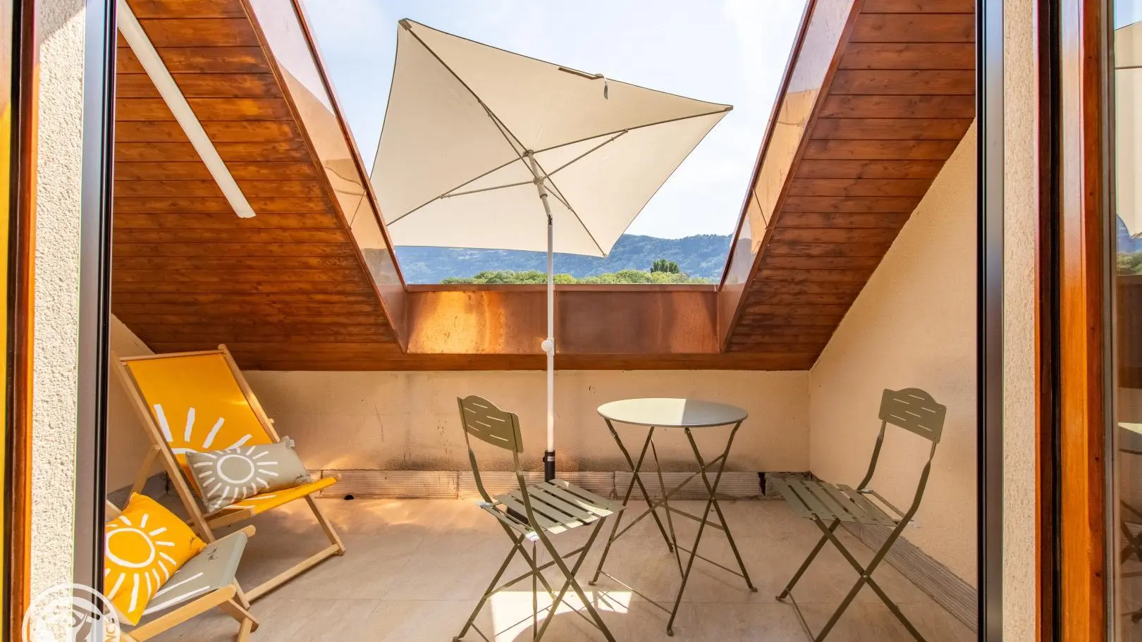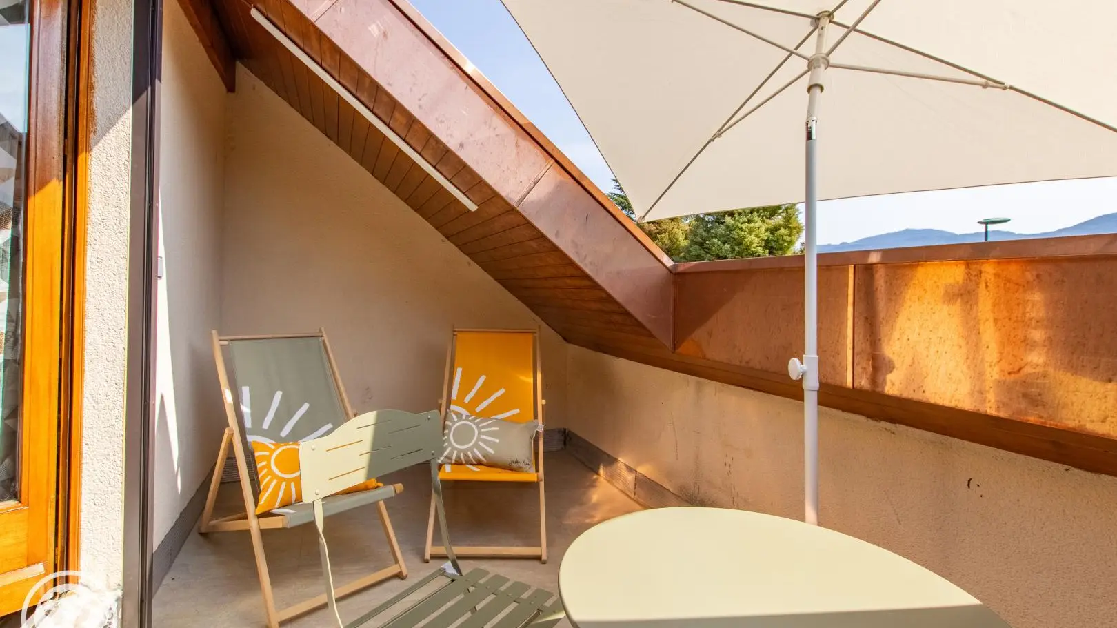 2 balcons-terrasses type tropézienne avec salon de jardin, transats, parasol, plancha électrique. Vue montagnes.