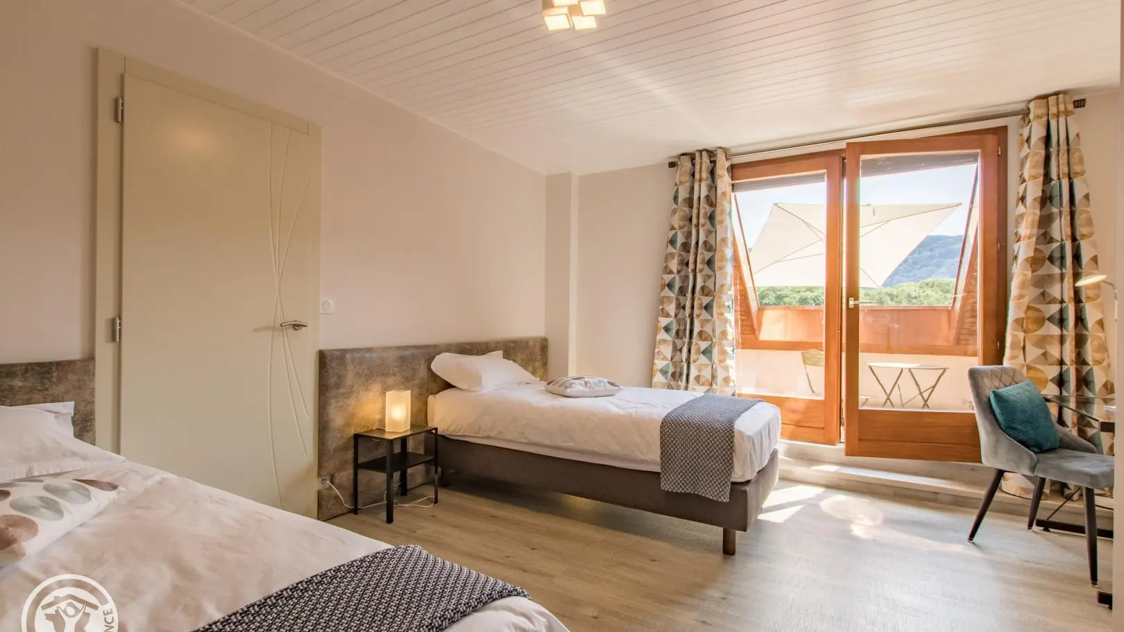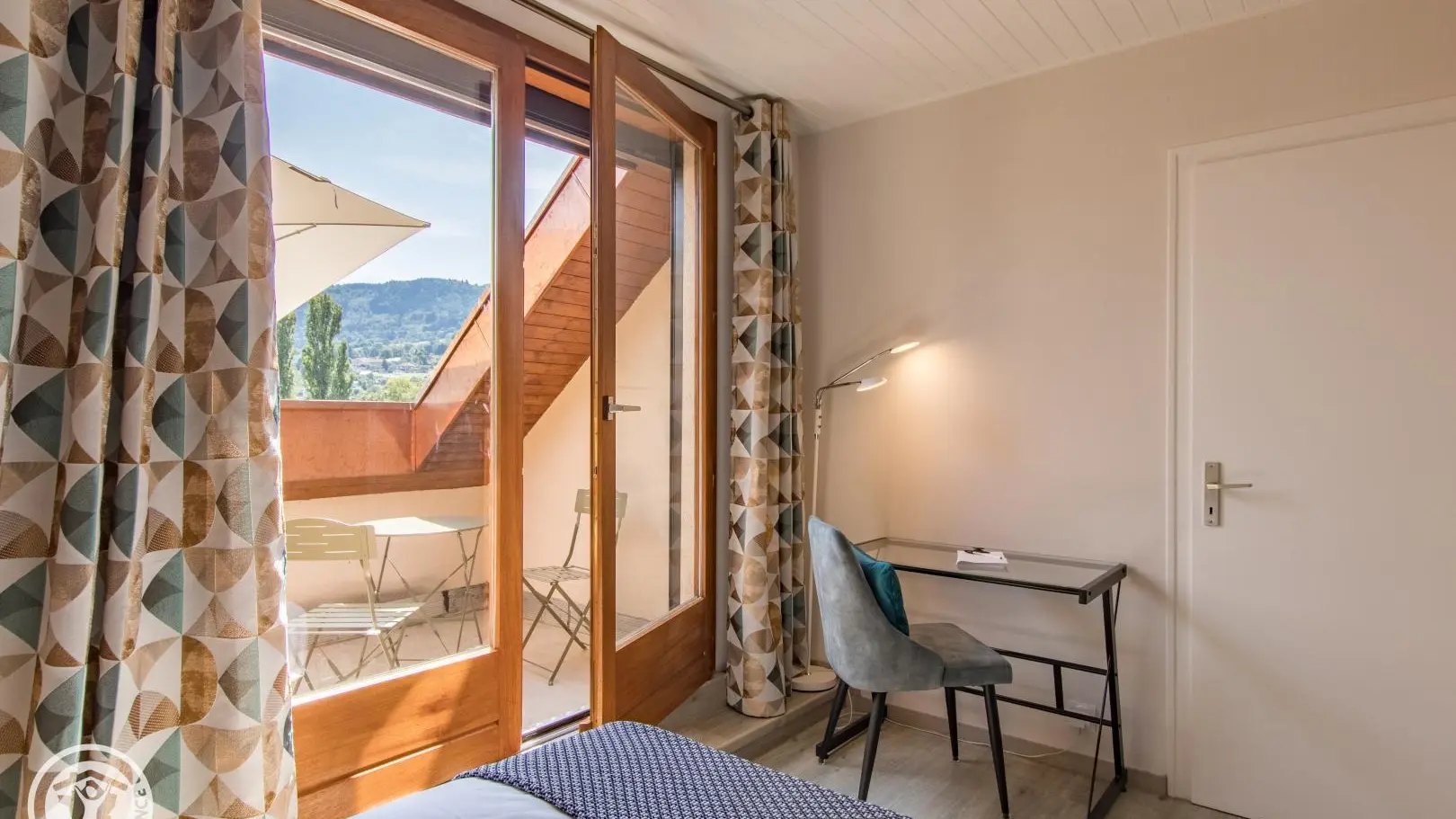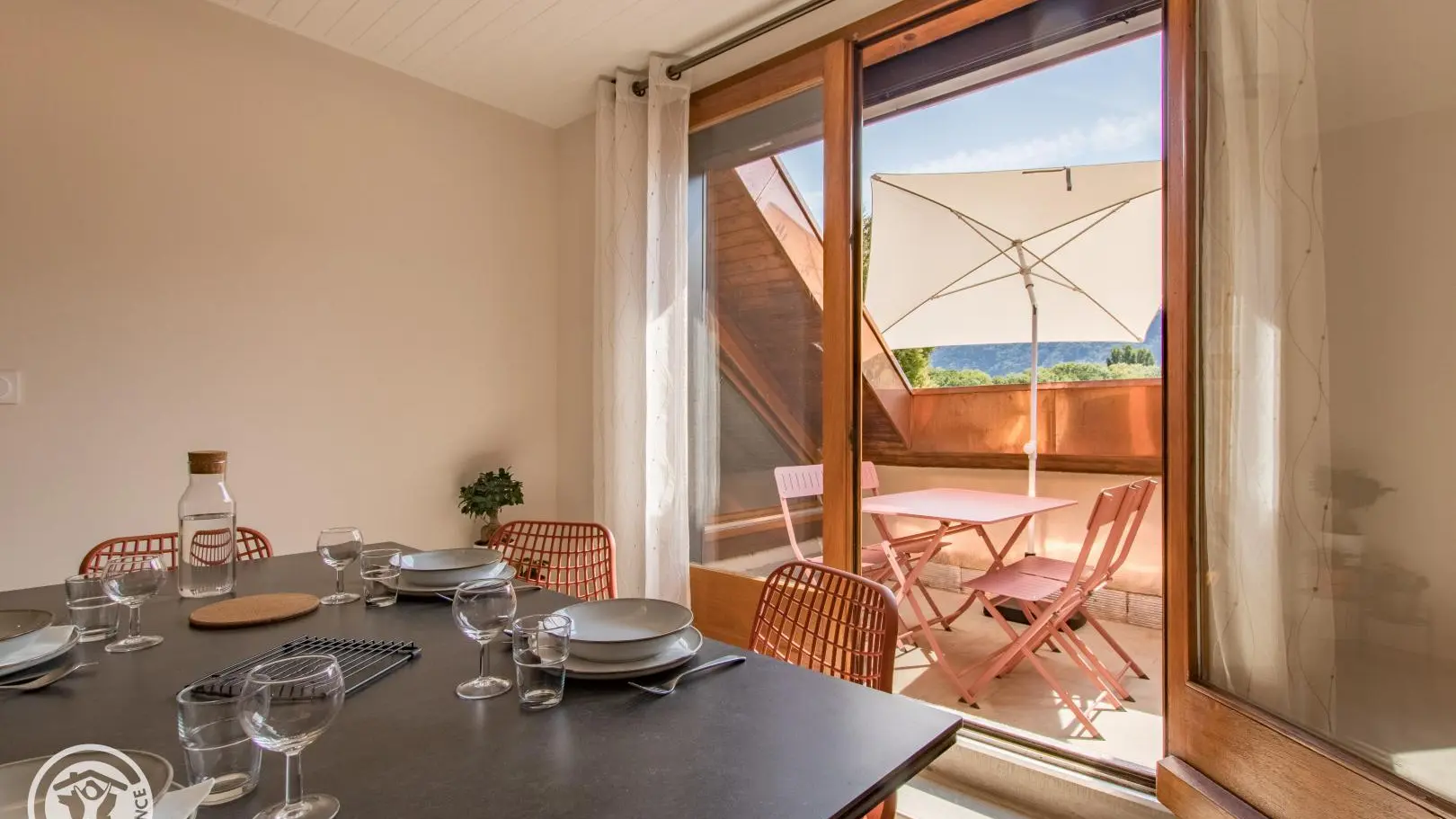 2 balcons-terrasses type tropézienne avec salon de jardin, transats, parasol, plancha électrique. Vue montagnes.