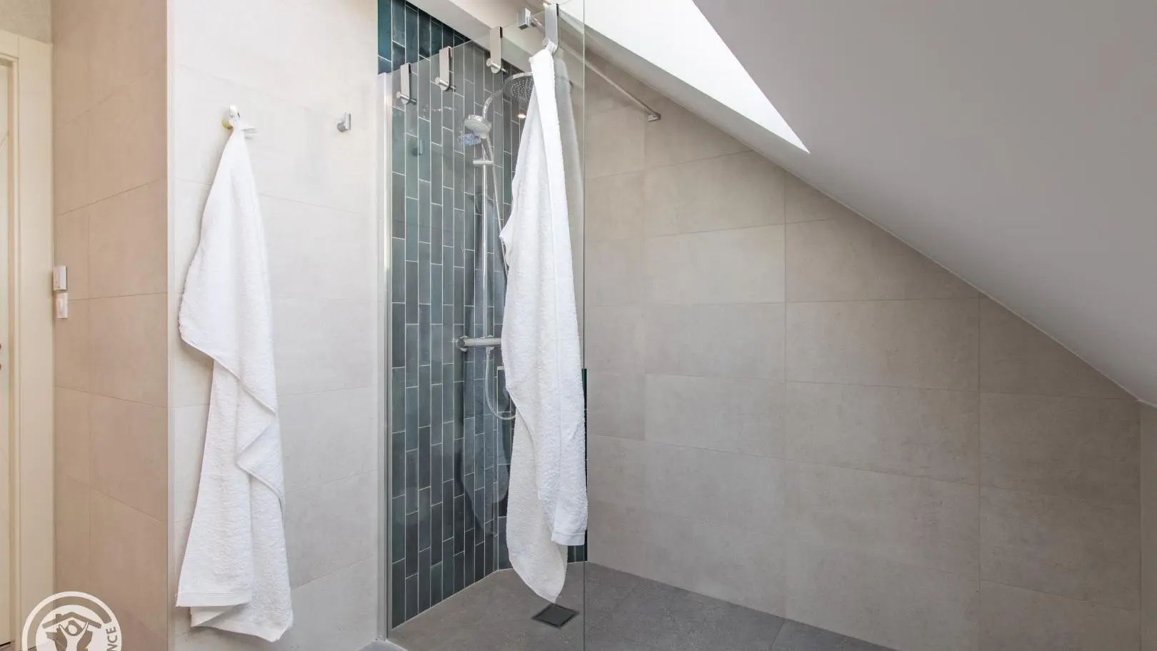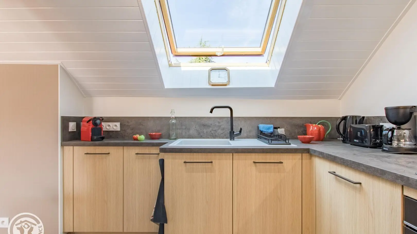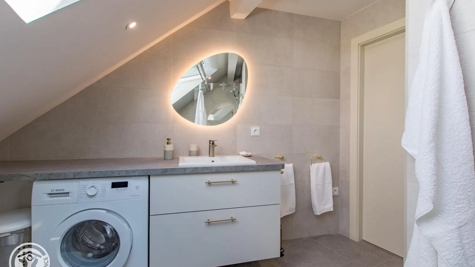 - Salle d'eau mansardée : douche à l'italienne, vasque sur plan, lave-linge.