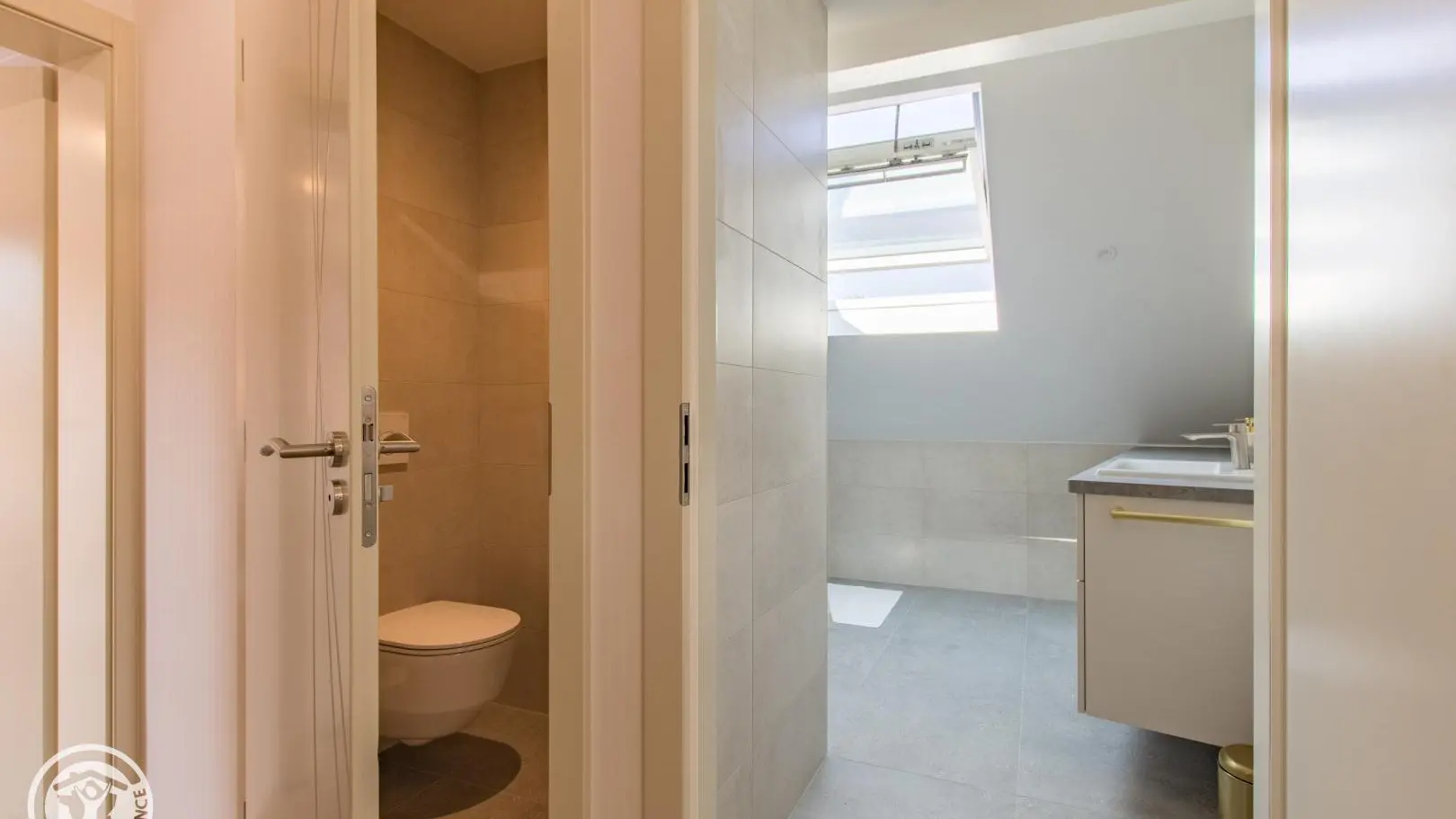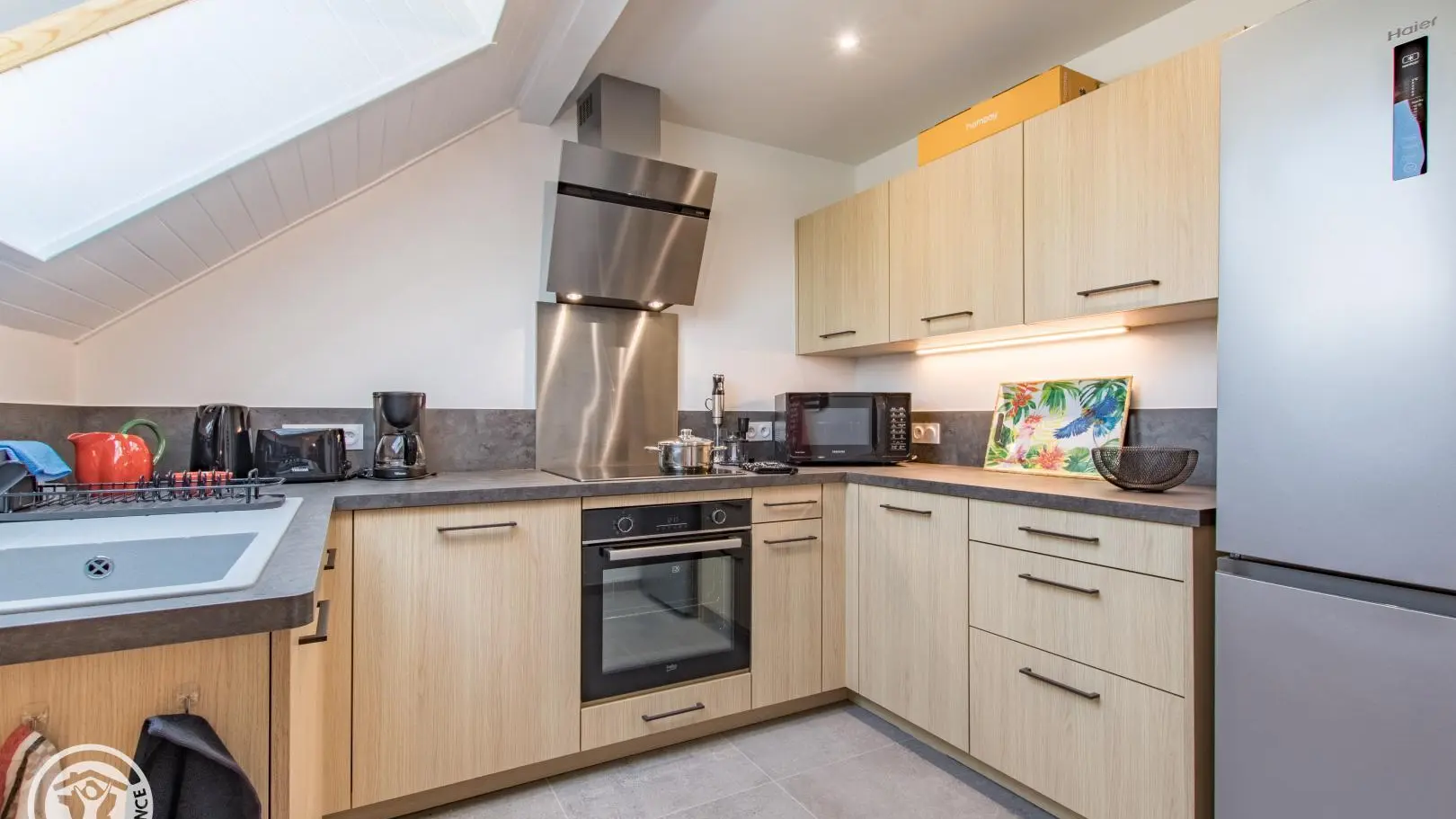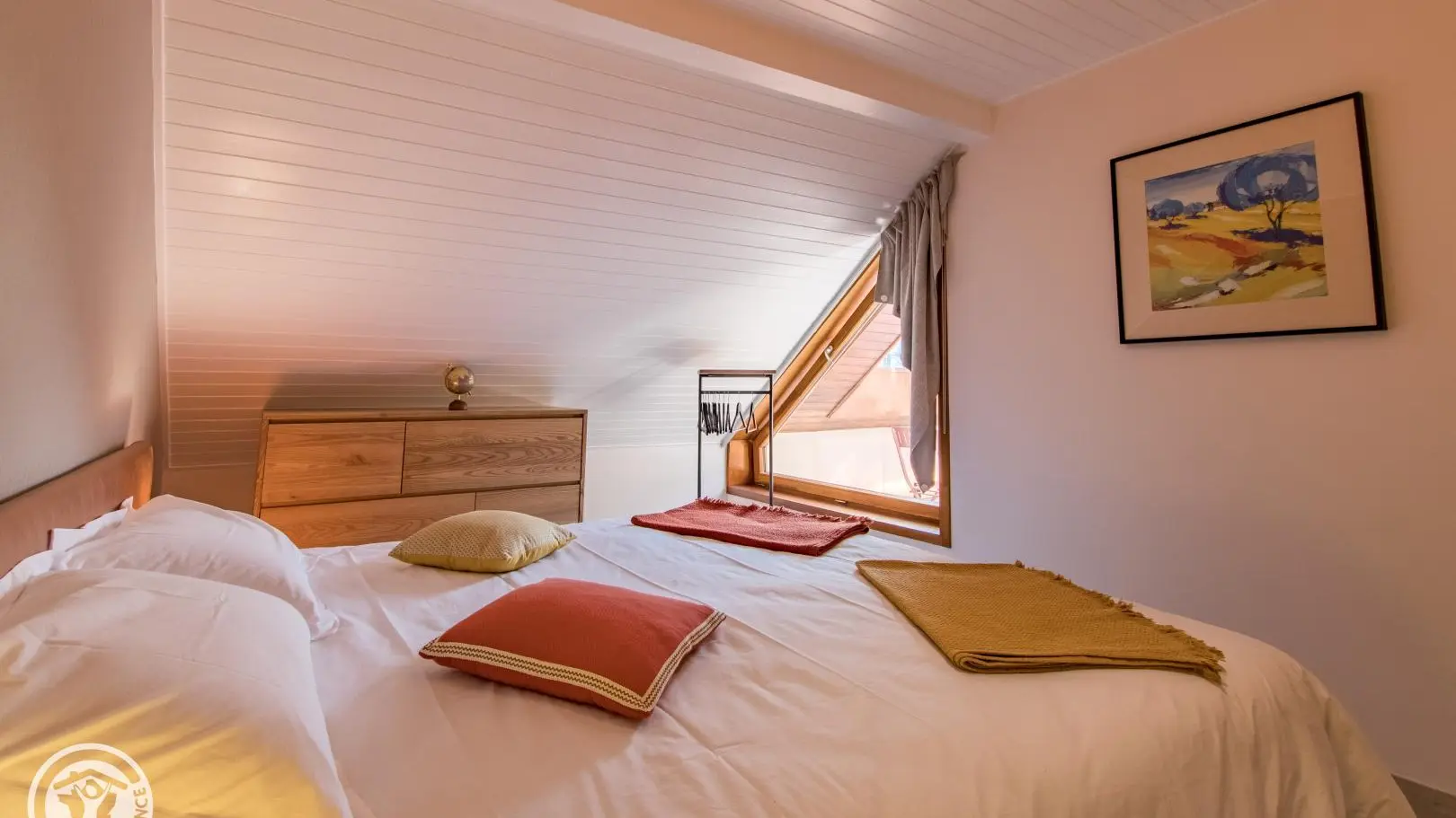 - Salle d'eau mansardée : douche à l'italienne, vasque sur plan, lave-linge.