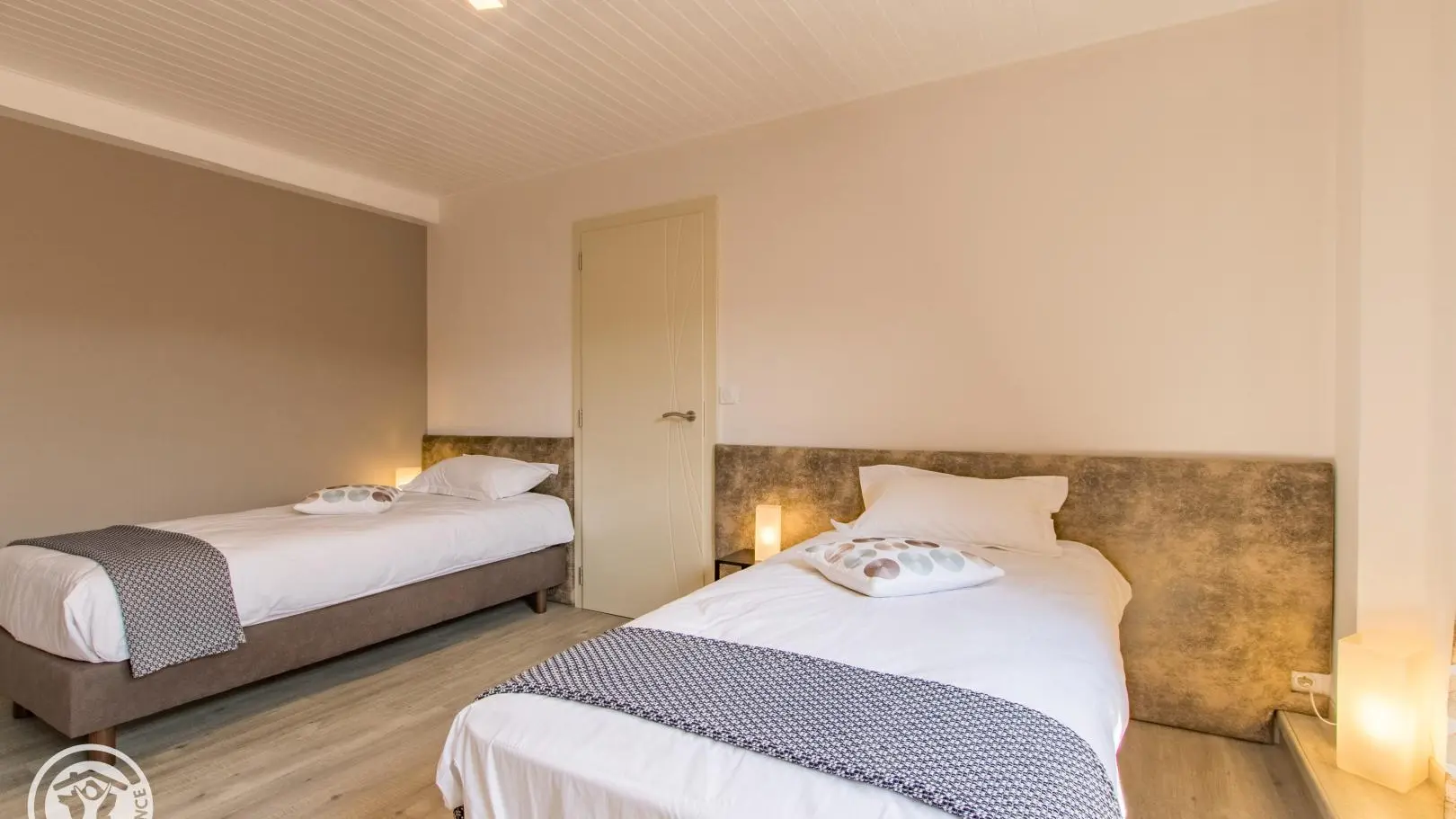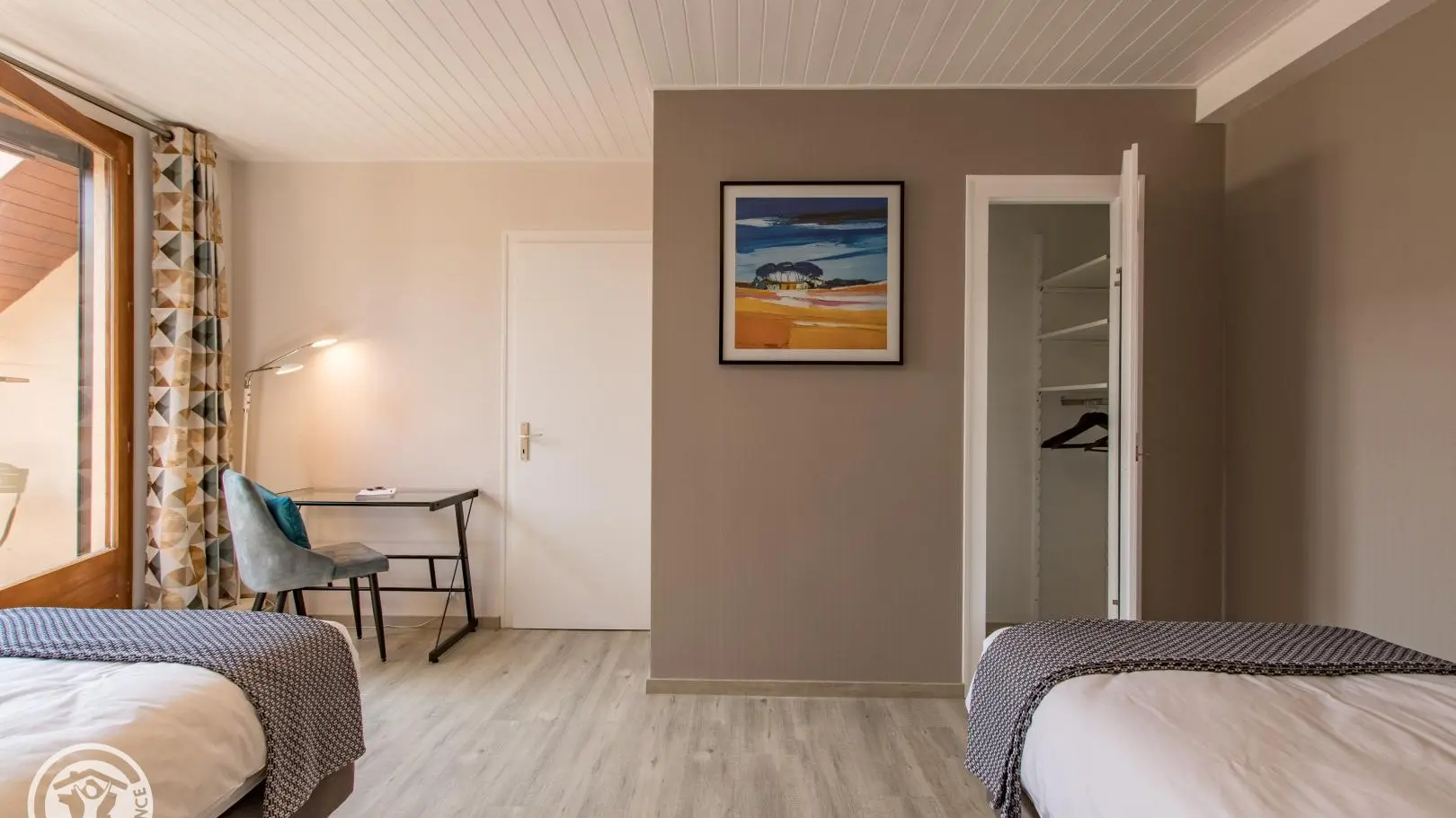 - 2 chambres : chambre 1 (1 lit double 180x200cm séparable en 2 lits 90cm), chambre 2 (2 lits 1 personne pouvant être jumelés pour créer également 1 lit double 180cm, bureau, accès à une 2ème terrasse tropézienne).