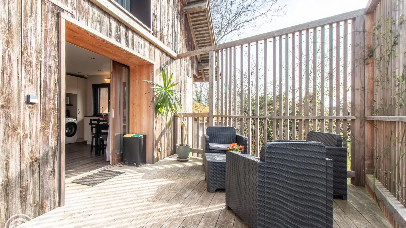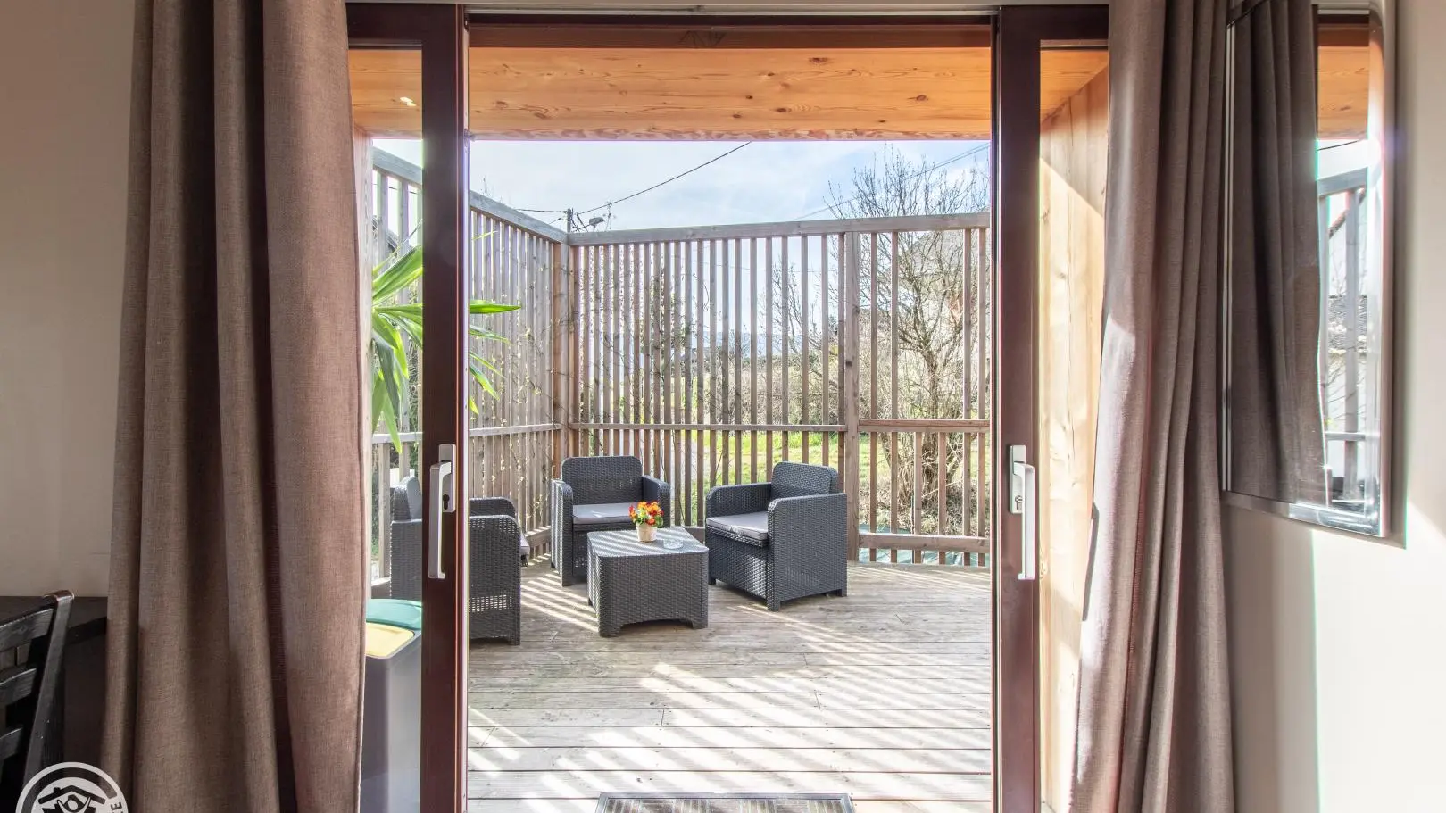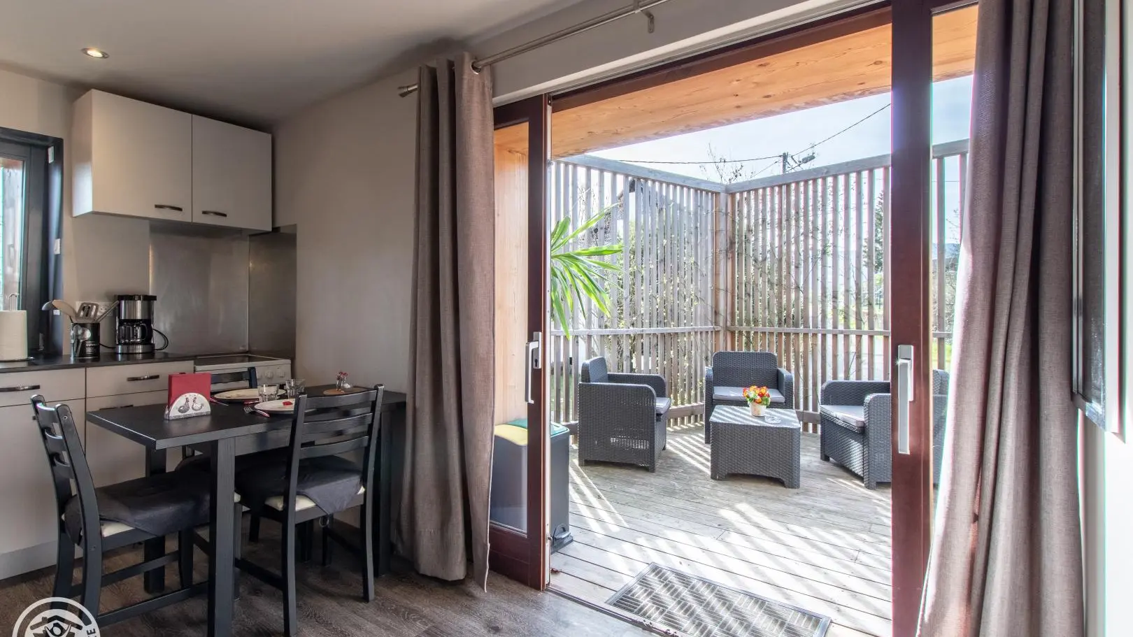 Escalier bois entre le parking et la terrasse bois privative construite de plain-pied avec la cuisine. Grand parking à proximité du gîte. Chiens et chats acceptés sur demande uniquement.