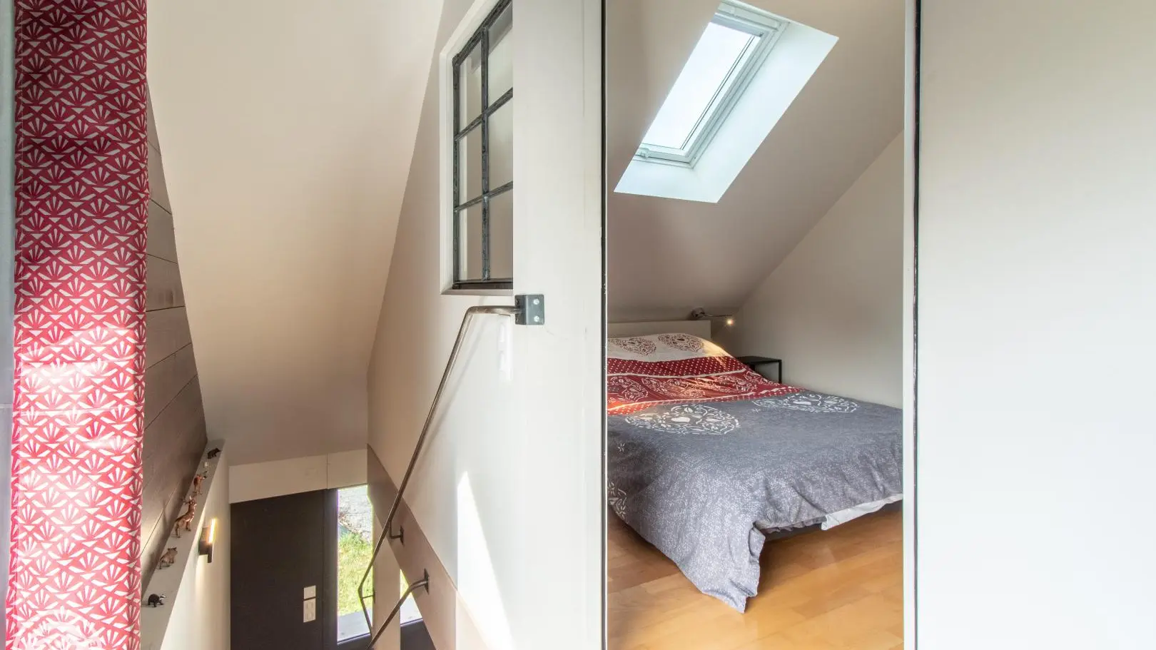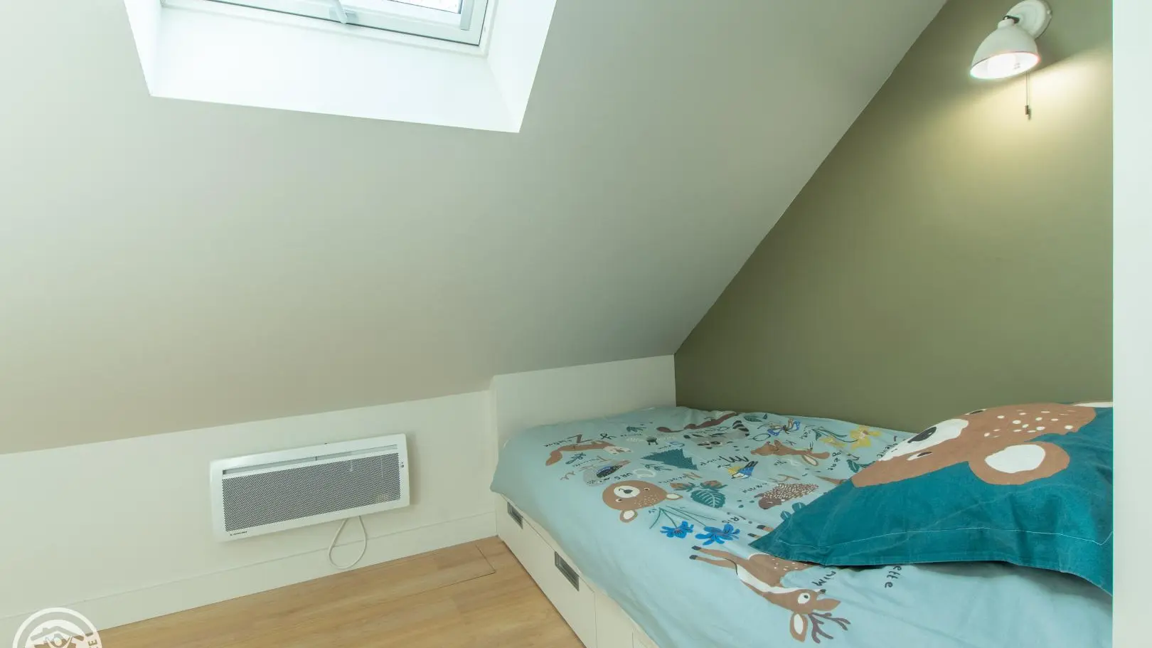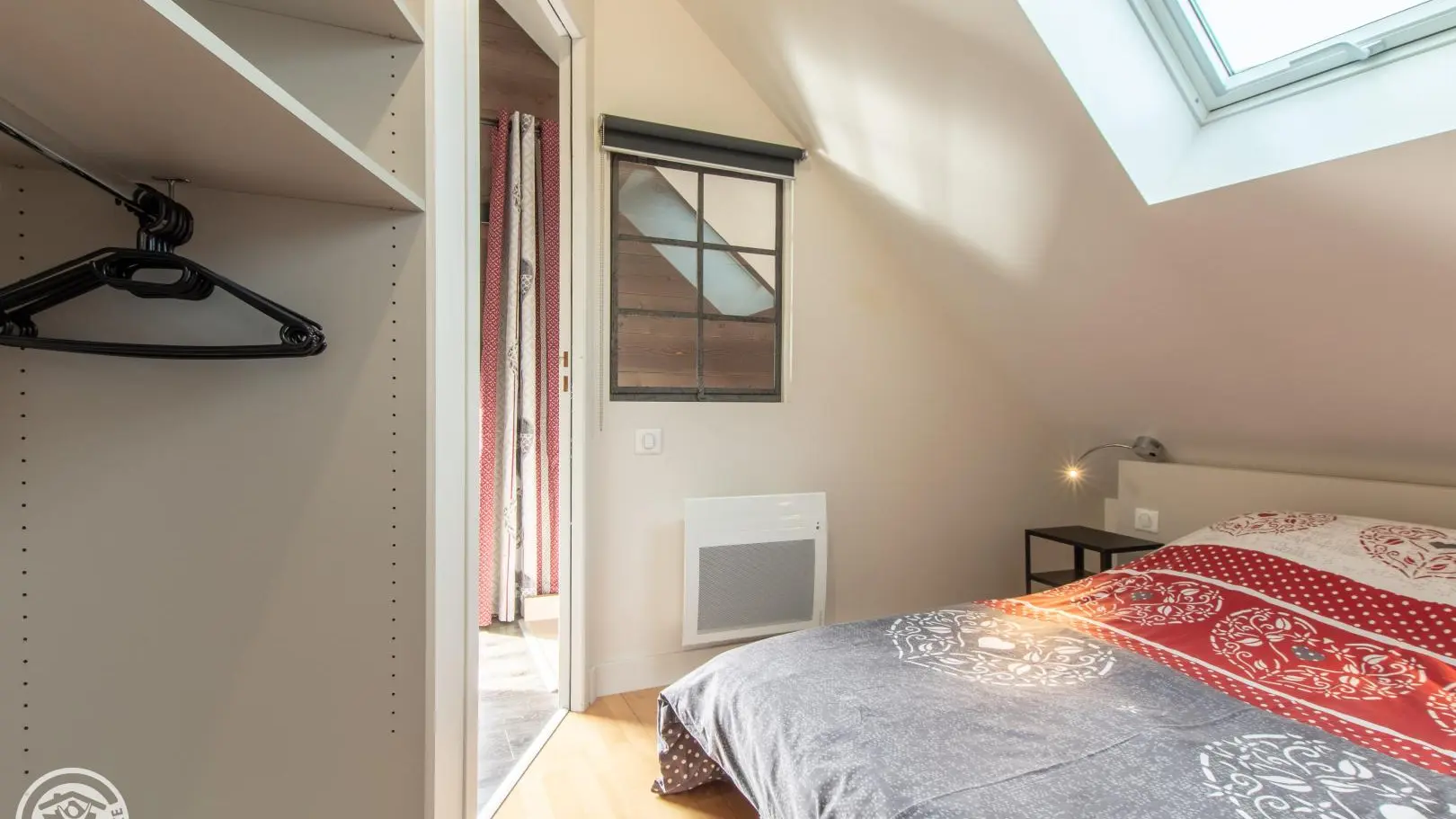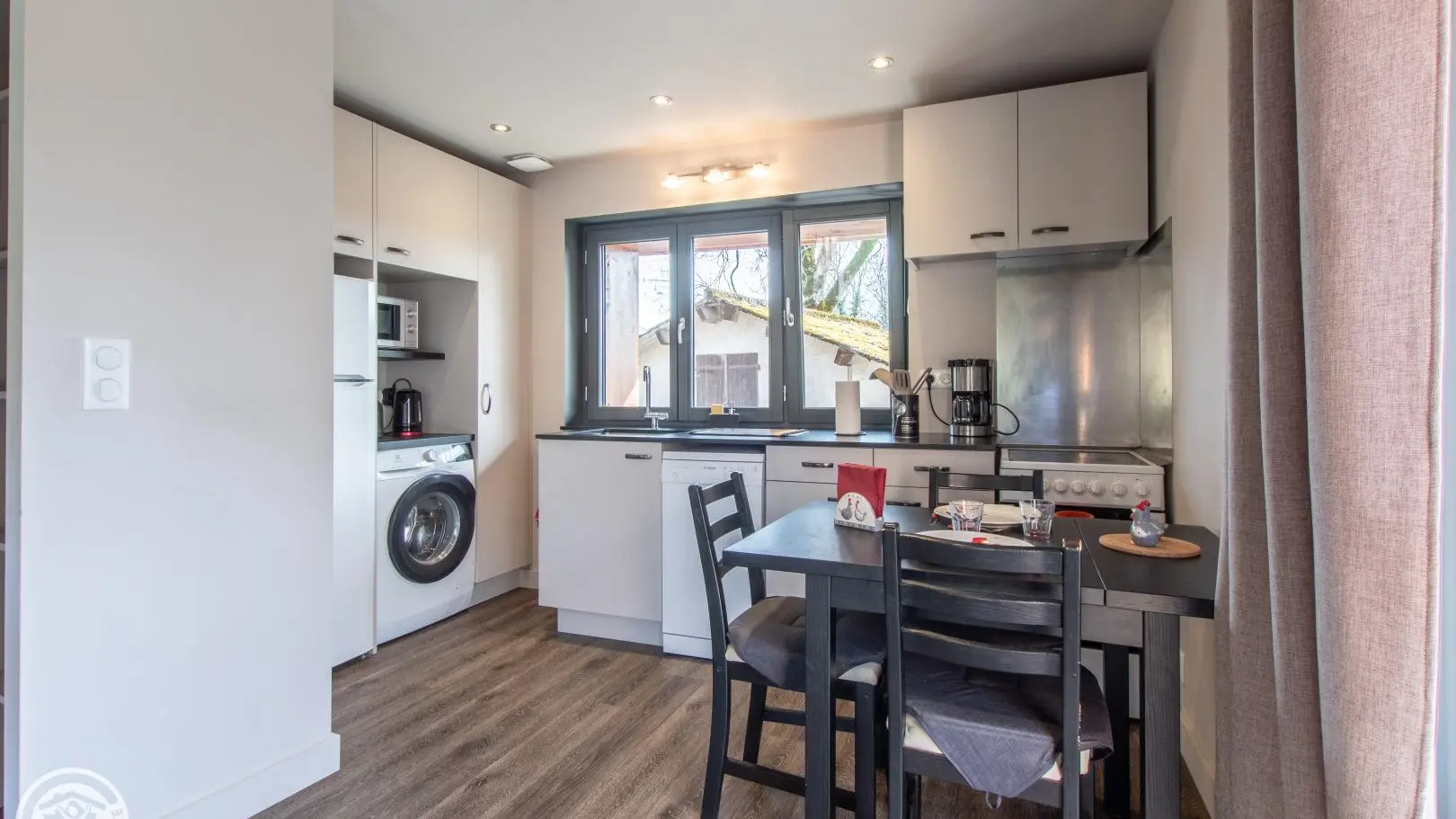 Dans une maison comprenant deux gîtes et le logement des propriétaires, hébergement de 36 m² (loi Carrez) sur deux niveaux comprenant en rez-de-terrasse une cuisine équipée (lave-linge, lave-vaisselle) avec table de repas ainsi qu'un séjour (TV sous escalier, canapé convertible avec méridienne). Espace rangement et WC indépendant. A l'étage, chambre 1 (1 lit 140x190) et chambre 2 (1 lit 90x190) mansardées. Salle d'eau avec douche et vasque sur meuble, WC.