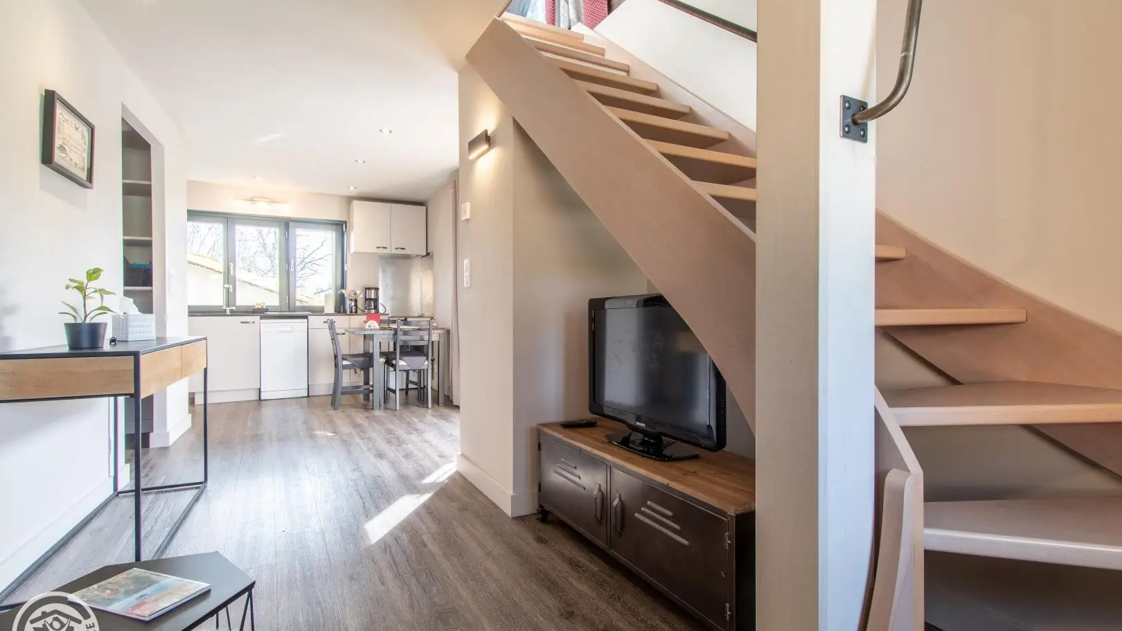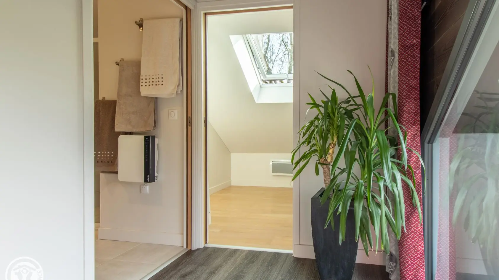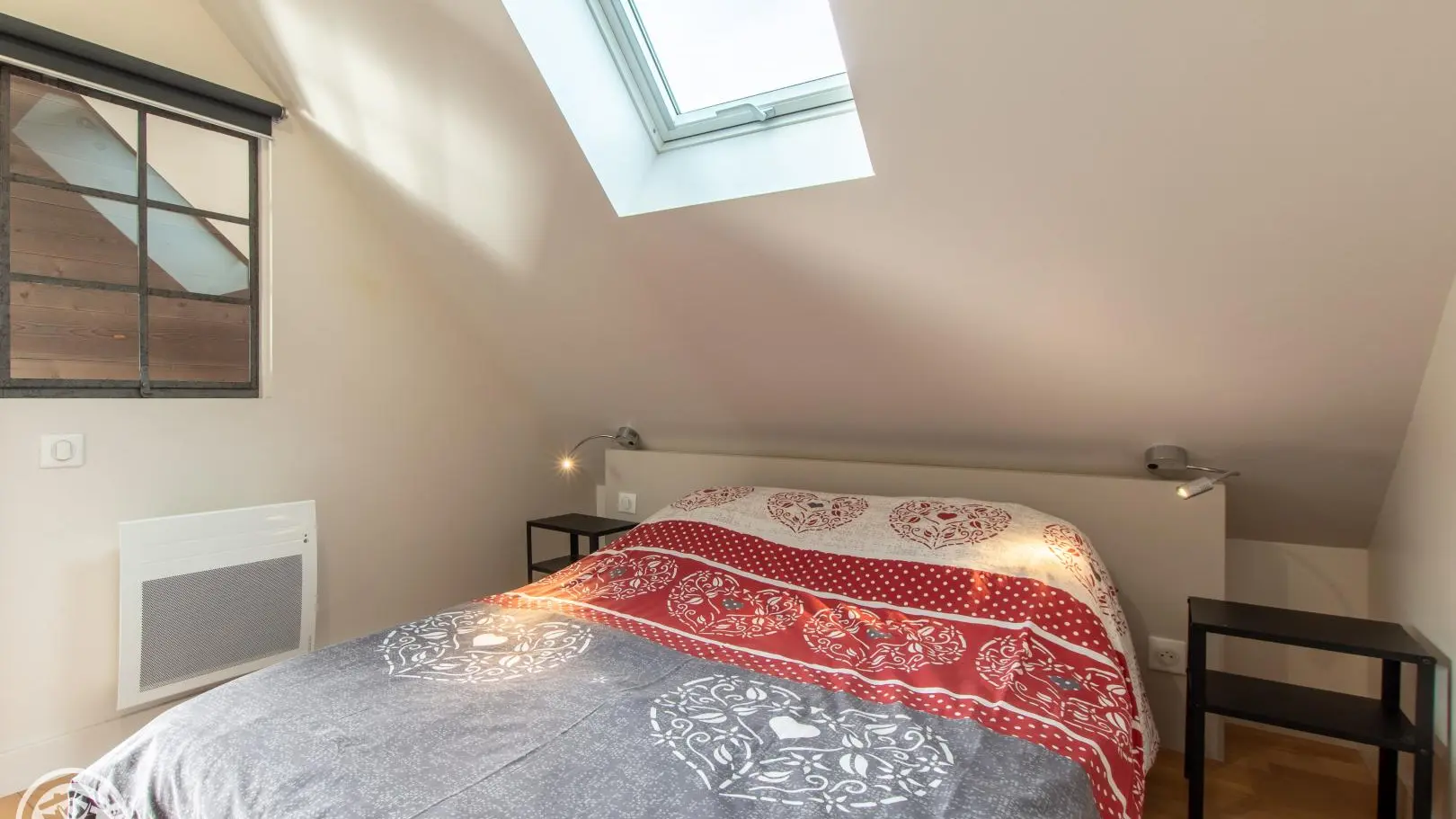 Dans une maison comprenant deux gîtes et le logement des propriétaires, hébergement de 36 m² (loi Carrez) sur deux niveaux comprenant en rez-de-terrasse une cuisine équipée (lave-linge, lave-vaisselle) avec table de repas ainsi qu'un séjour (TV sous escalier, canapé convertible avec méridienne). Espace rangement et WC indépendant. A l'étage, chambre 1 (1 lit 140x190) et chambre 2 (1 lit 90x190) mansardées. Salle d'eau avec douche et vasque sur meuble, WC.