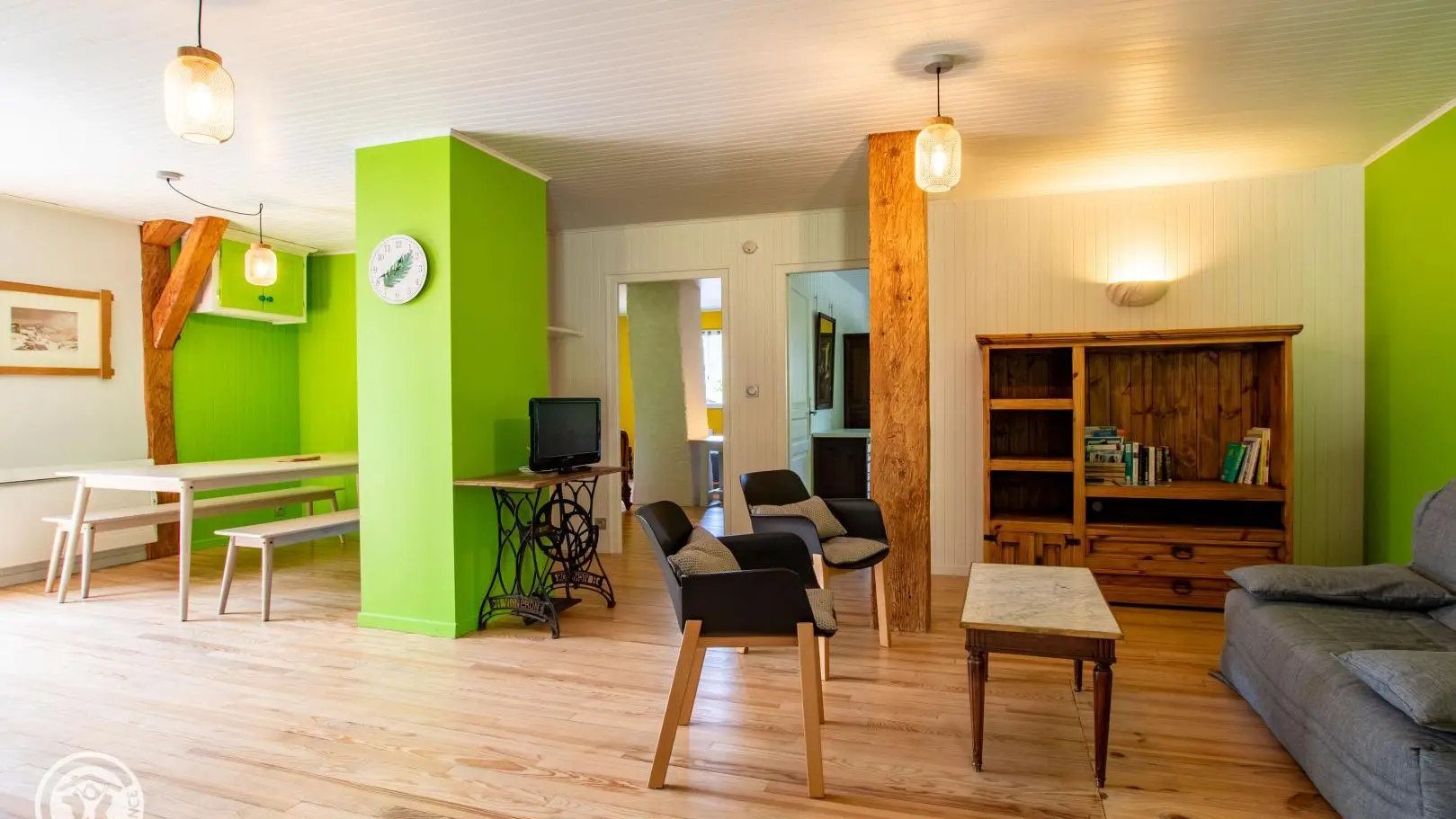 Espace entrée, salon avec canapé et fauteuils, bibliothèque, TV et table basse. Coin cuisine et repas.