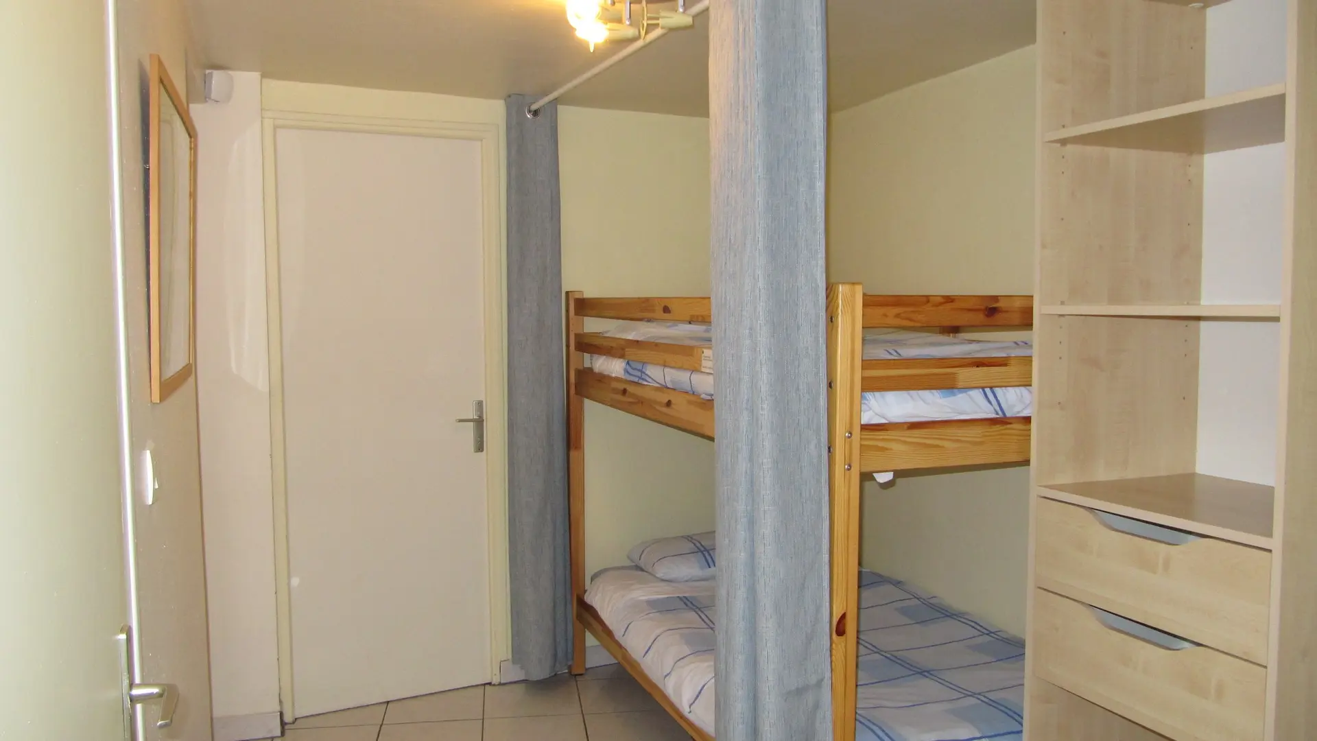 Dégagement fermé par des portes entre le séjour et la chambre avec 2 lits superposés (90x190) eux mêmes séparés par un rideau