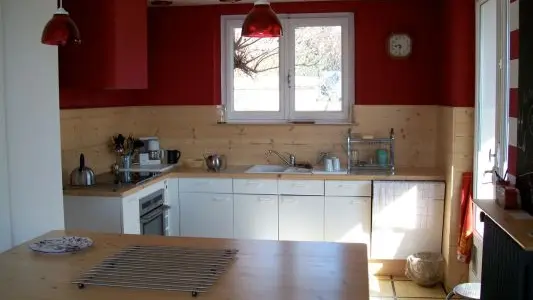 Cuisine américaine donnant sur un salon spacieux, 3 chambres, 2 salles de bain, garage.