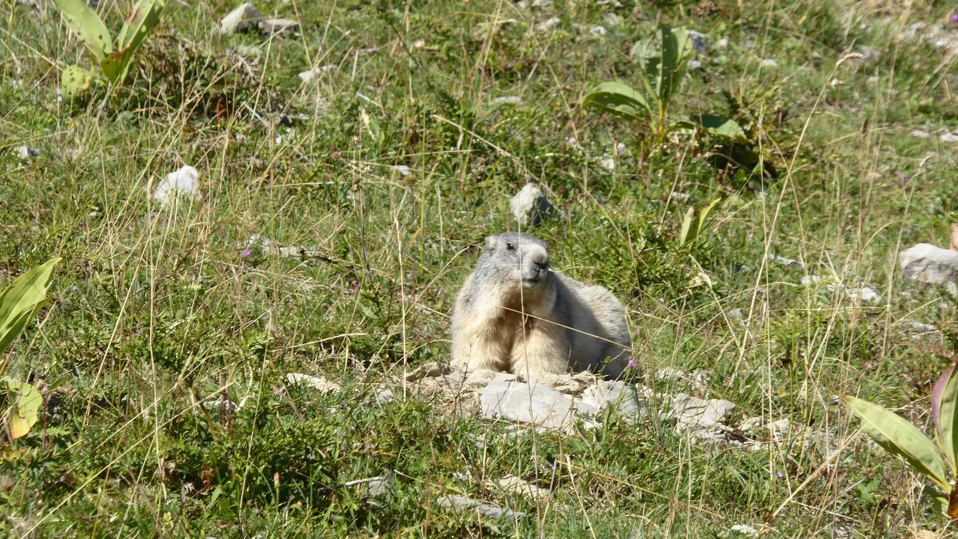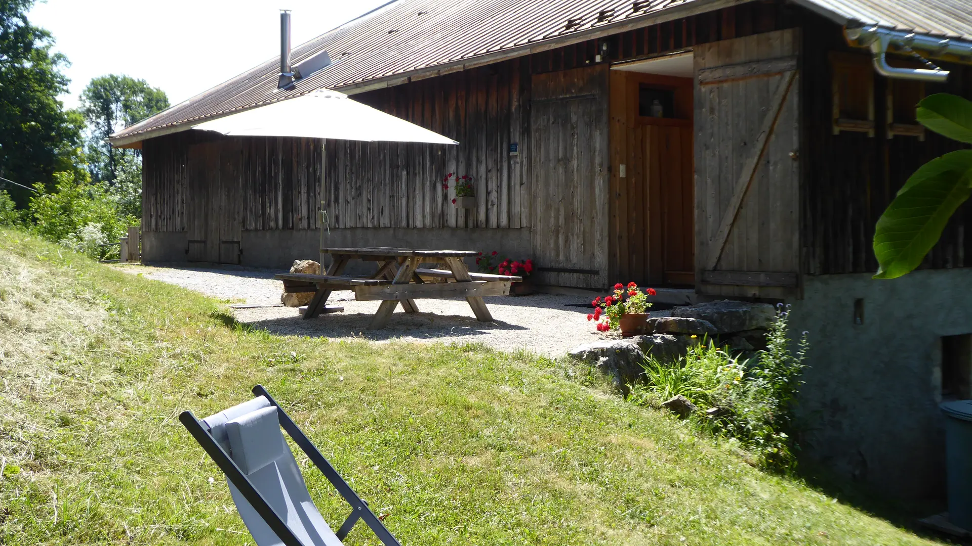 Terrasse avec table de jardin, coin pelouse avec chaises longues.