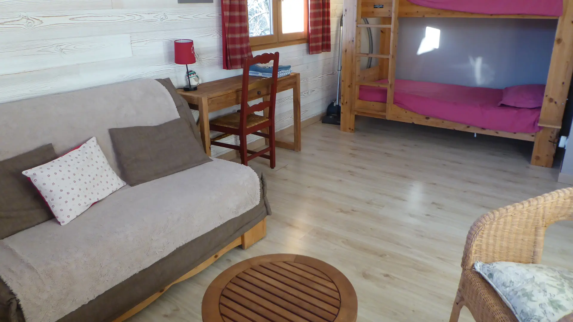 1 canapé convertible 140 x 200, 2 lits superposés 90 x 200,